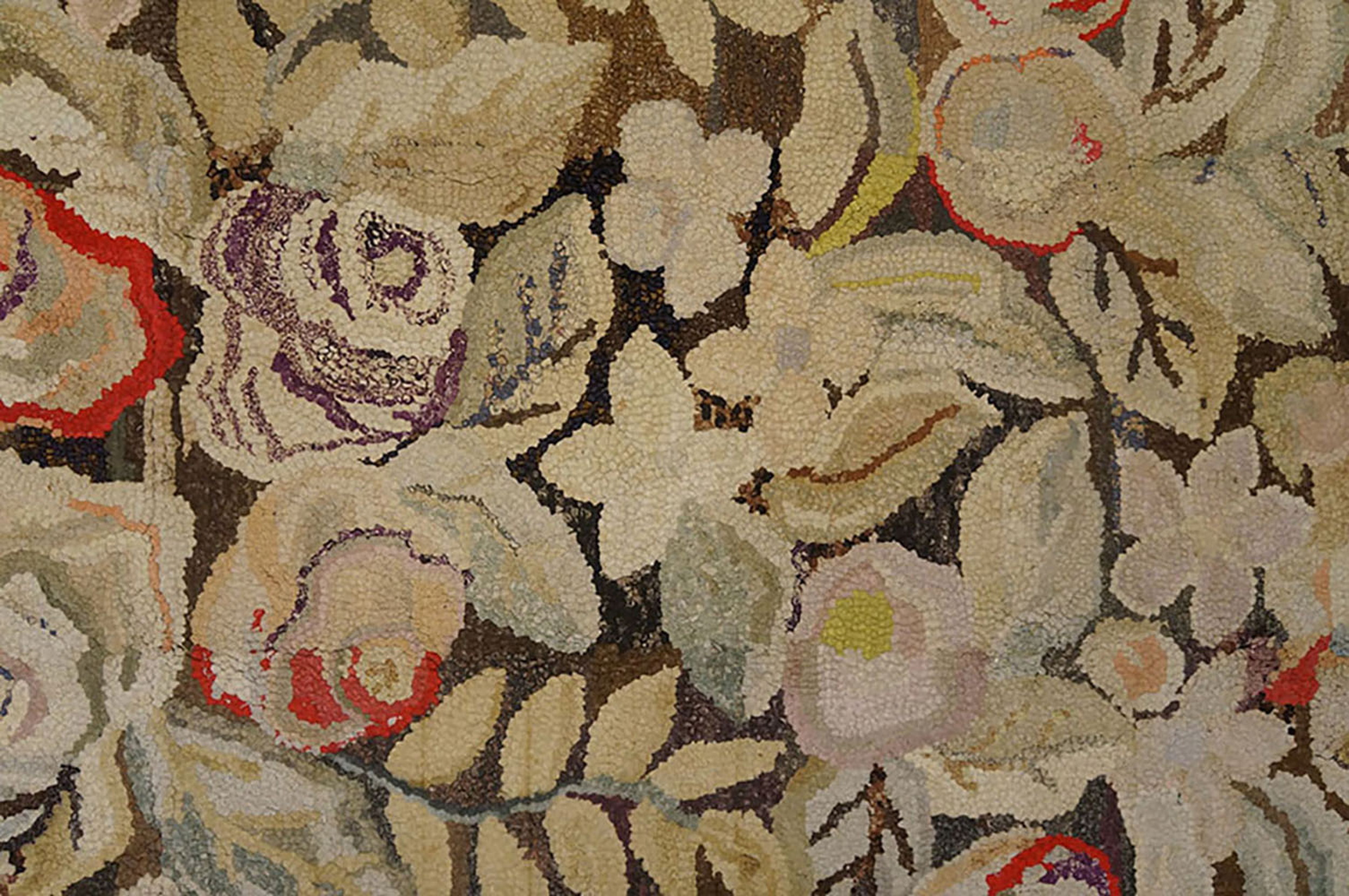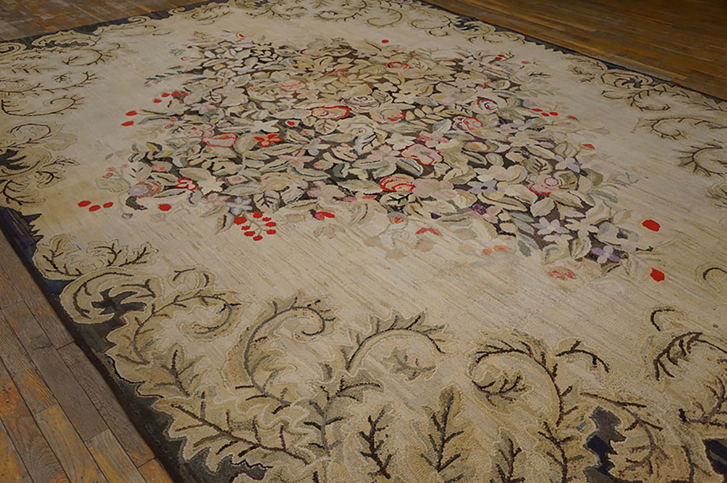Antique Ivory Wool American Hooked Room Size 1930s Rug, Circa Date: 1930s. This exceptional example of American Hooked rug production captures the domestic artistry popular during the early 20th century. The generous dimensions classify it among desirable room size rugs, making it suitable for grander interiors seeking authentic antique rugs.