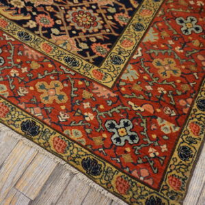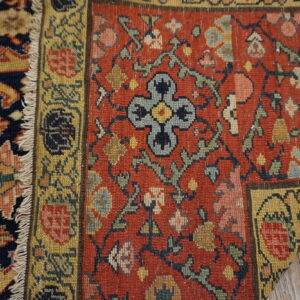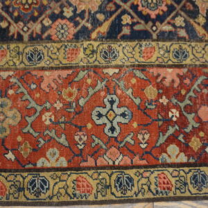 Contrasting beautifully with the deep field, the main border employs a vibrant terracotta red, framed by delicate guard borders featuring gold and pale blue detailing. The juxtaposition of the warm red against the cool, dark central panel elevates this piece beyond typical blue color rugs, providing visual depth and historical resonance.