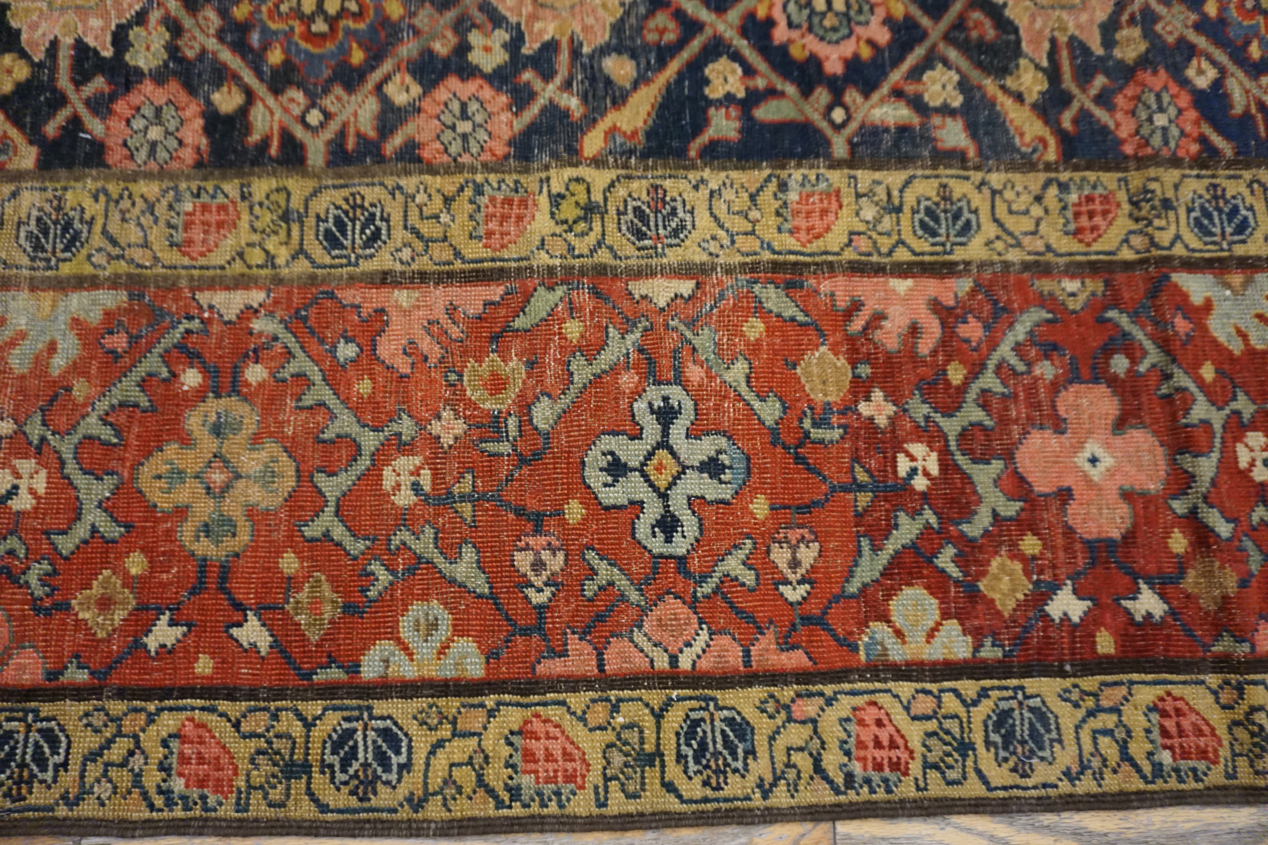 The field is defined by a deep, saturated indigo ground, characteristic of the best natural dyes of the period. This rich backdrop supports a finely articulated, repeating diamond lattice that creates an intricate allover design of stylized blossoms and palmettes, demonstrating the weaver’s mastery of complex symmetry and classical Persian motifs.