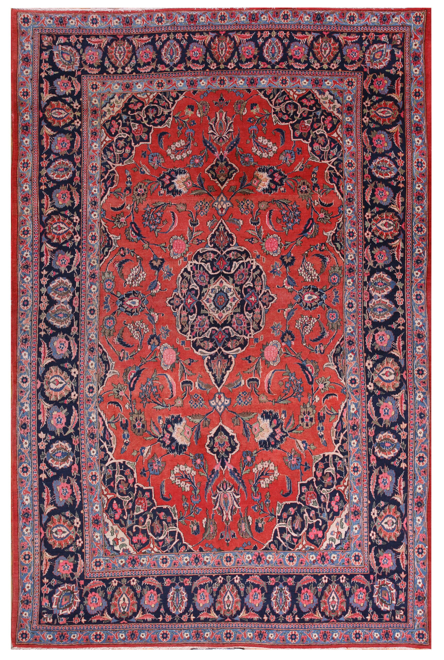 Antique Kashan Room Size Wool Coral Rug, Circa Date: 1886. This exceptional late 19th-century Persian weaving exemplifies the high standards of classical design associated with Kashan rugs. The composition features a highly refined central medallion and pendant system set against a richly saturated field.