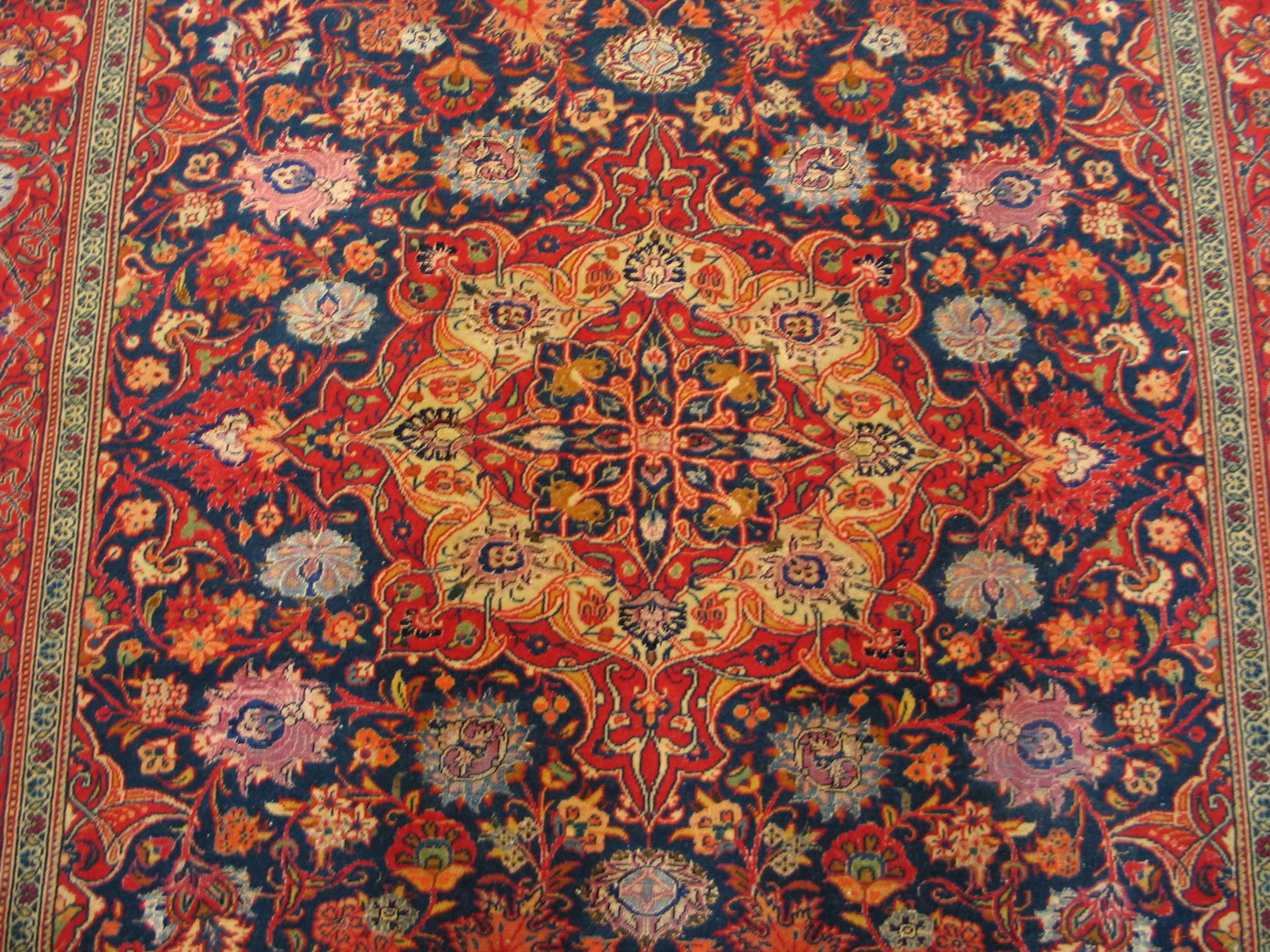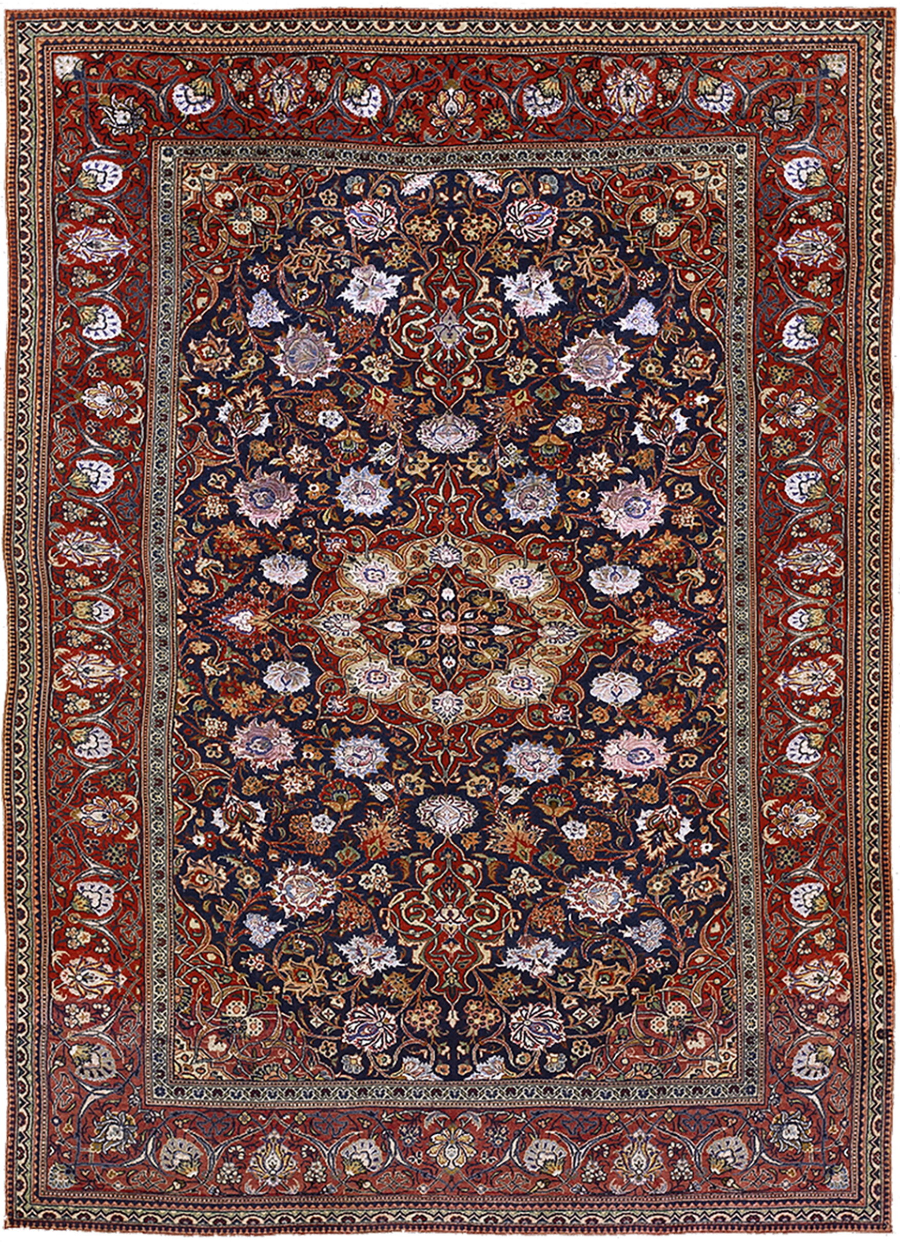The primary field color is a deep, resonant navy, offset dramatically by the terracotta red of the main border. The judicious use of silk threads within the ivory and pale pink elements provides a luminous quality, subtly shifting the tone depending on the light. This sophisticated use of pigment places it among the most desirable blue color rugs of its era, offering both historical value and enduring elegance.