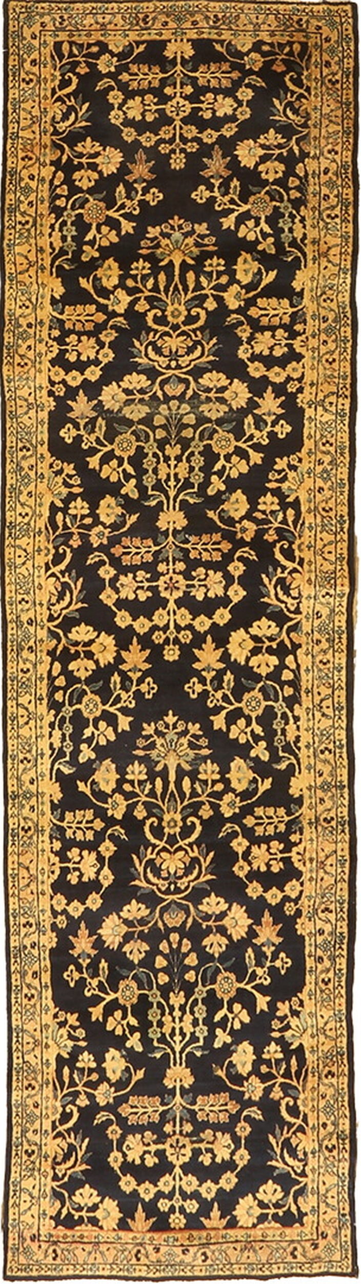 The visual impact of this piece is immediate, featuring a striking contrast between the deep, near-black field and the vibrant, luminous saffron tones of the design. This brilliant hue elevates this specific yellow rug beyond typical palettes. Furthermore, the composition utilizes an elegant, continuous allover pattern of scrolling vines and stylized palmettes, ensuring visual interest across the entire surface.