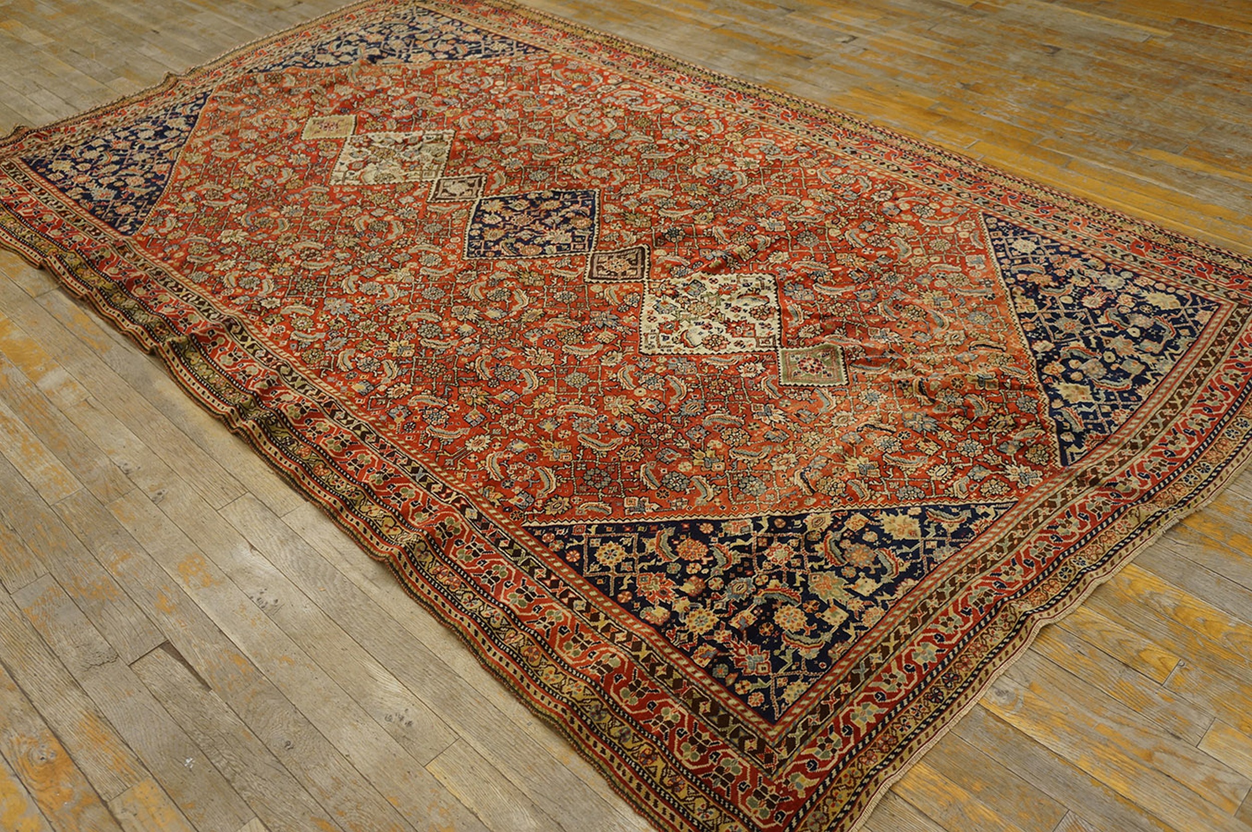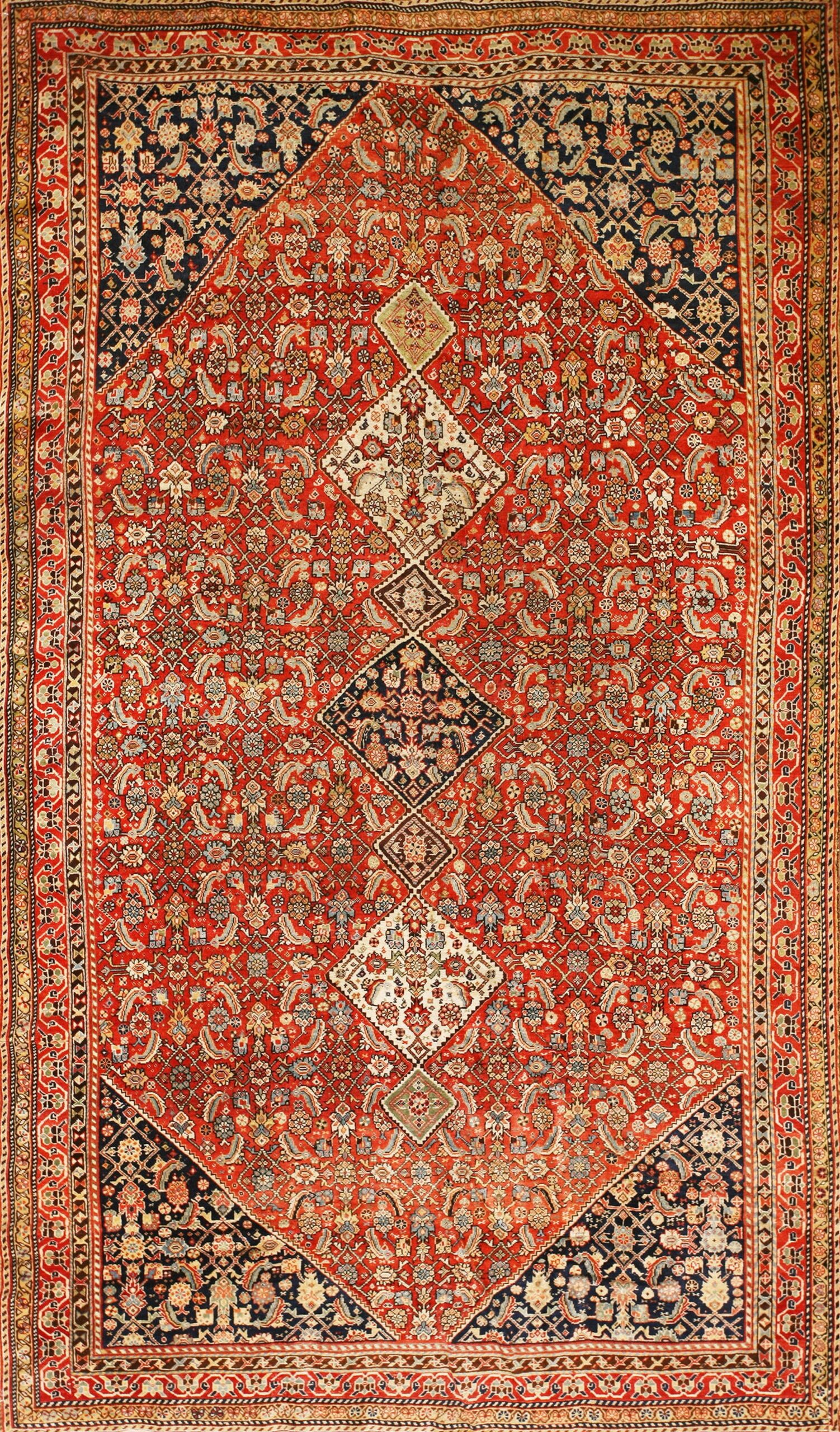 Antique khamse Persian Geometric Knotted Rug, Circa Date: 1890s. This exceptional piece represents the finest weaving traditions of the Khamseh tribal confederacy in Fars province. Its design is characterized by a powerful central axis of stacked diamond medallions, a hallmark of these rare antique rugs.