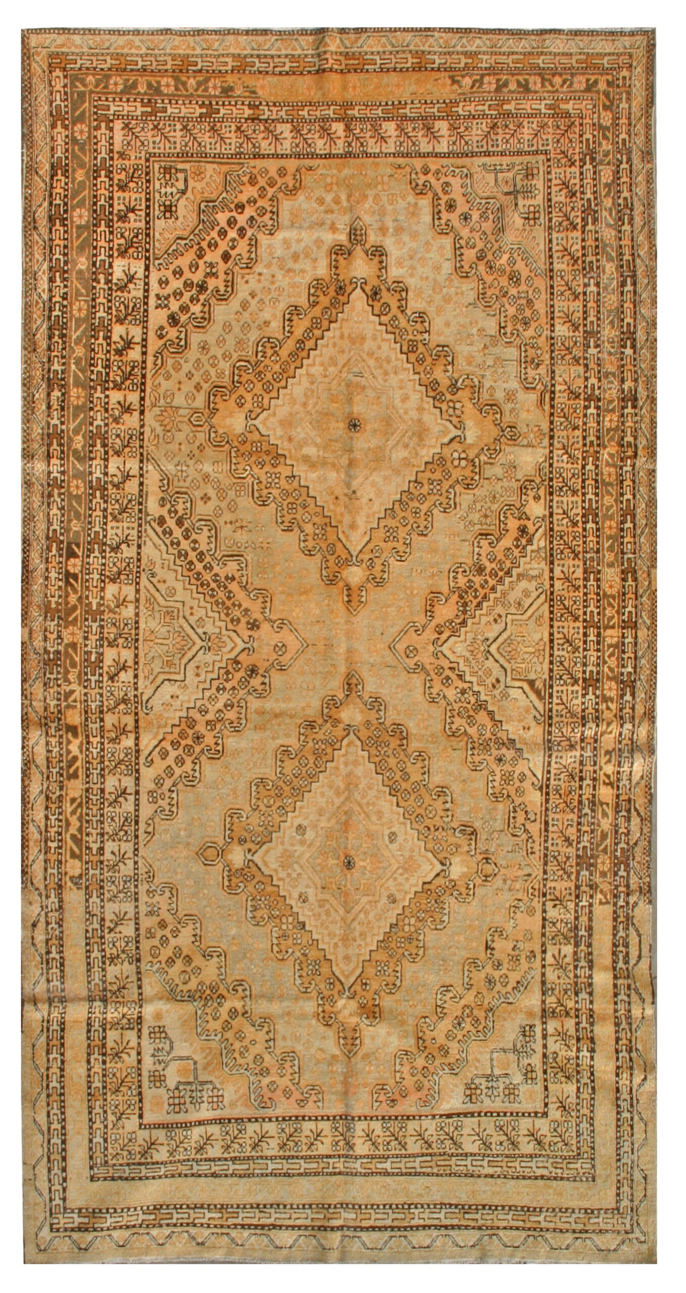 The design centers on a series of bold, stepped geometric diamonds defining the central axis. The wool foundation features a field dominated by a beautifully aged, soft gray color rugs patina, which provides a serene counterpoint to the vibrant, oxidized terracotta and rich brown dyes used in the primary motifs.