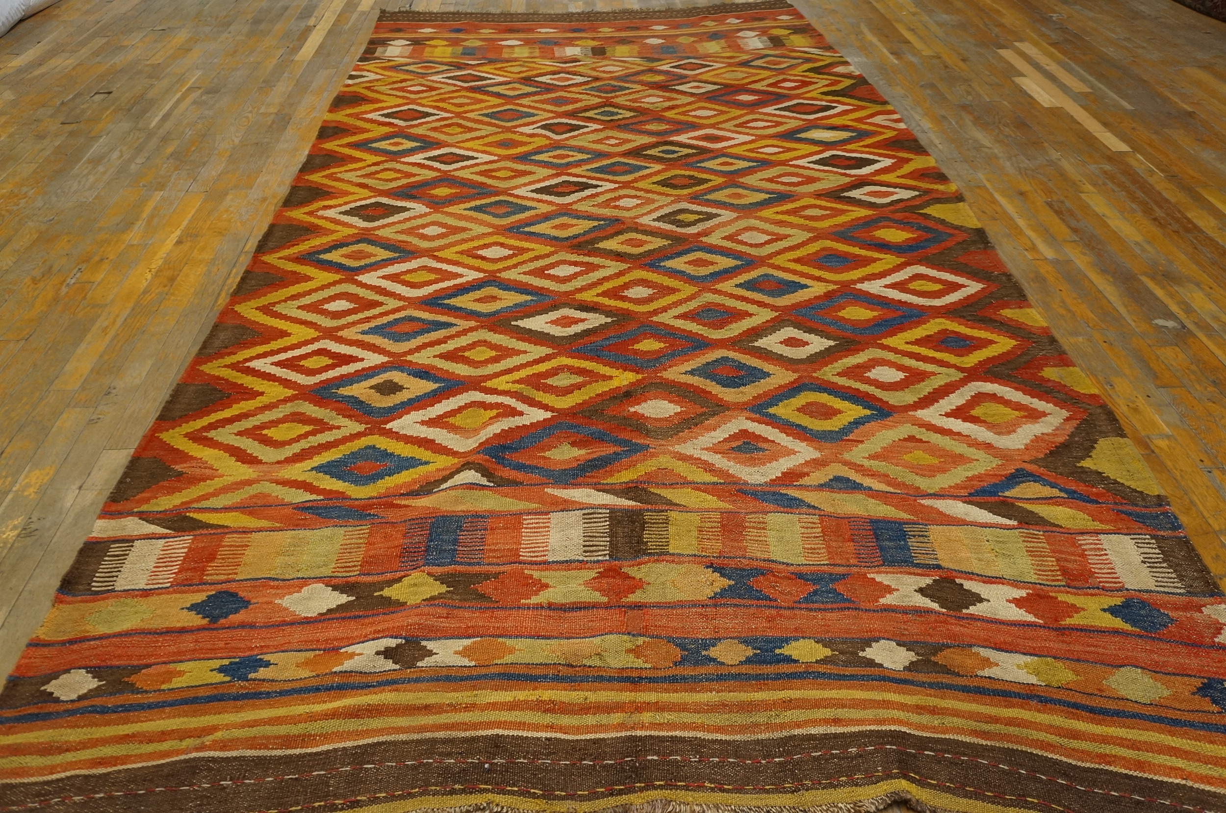 The composition is dominated by a dense, repeating lattice of stepped diamond motifs, a classic tribal design element. The vibrant geometry is framed by complex, multi-banded borders featuring striped and zigzag patterns. Given its elongated dimensions, this piece functions perfectly as a striking accent in modern interiors, especially suited for use as one of our premium hallway runner rugs.