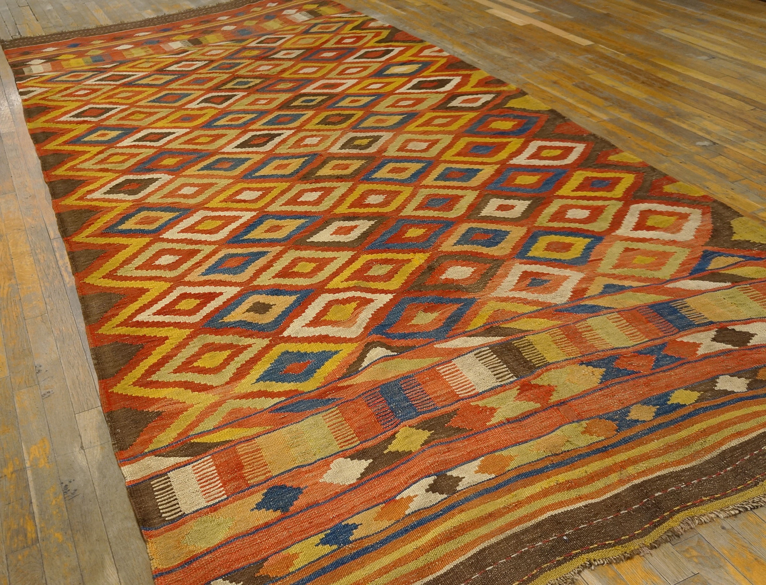 The palette is remarkably saturated, featuring rich madder reds, deep indigo blues, and brilliant saffron yellows. This striking combination creates a dazzling visual effect, positioning this piece among the most desirable multicolor jewel-tone rugs available today. The natural dyes have aged gracefully, resulting in a patina that enhances the depth and complexity of the design.