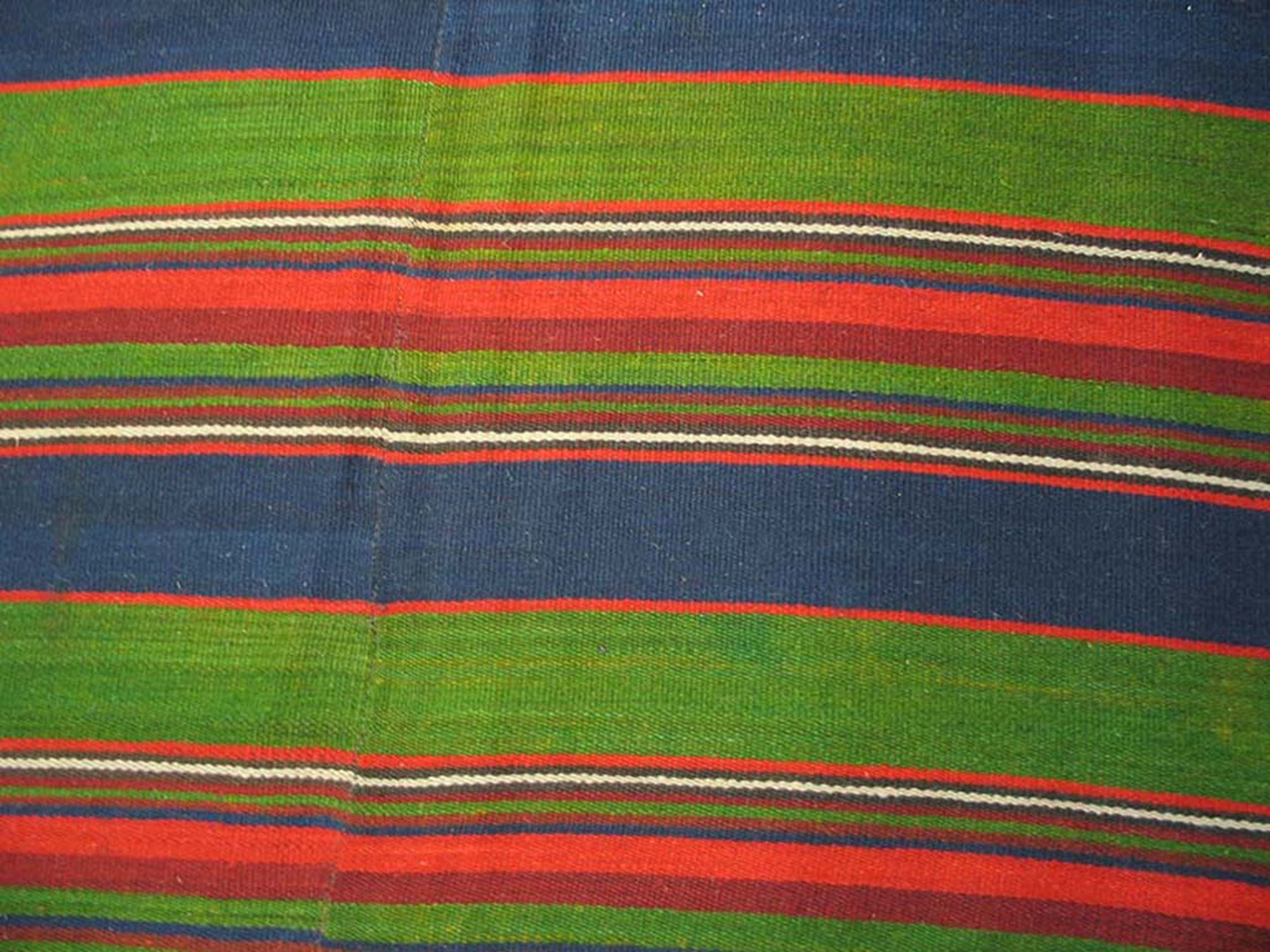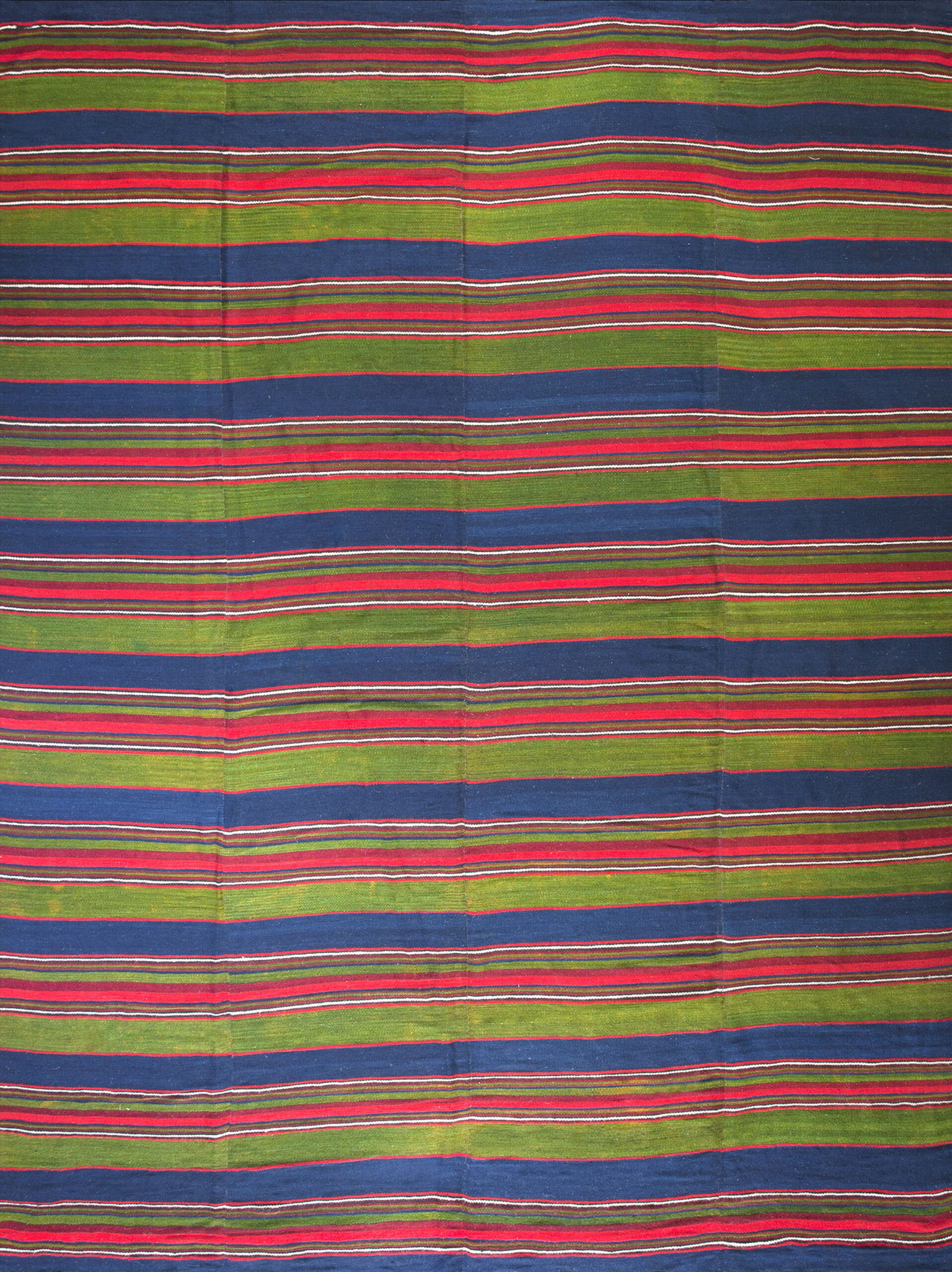 The palette is notably rich and saturated, featuring deep indigo, mossy olive green, and vibrant cochineal red, punctuated by thin white lines. The careful interplay of these hues defines it as a striking example of jewel-tone rugs. The subtle fading and desirable patina confirm its status among highly sought-after antique rugs of the early 20th century.