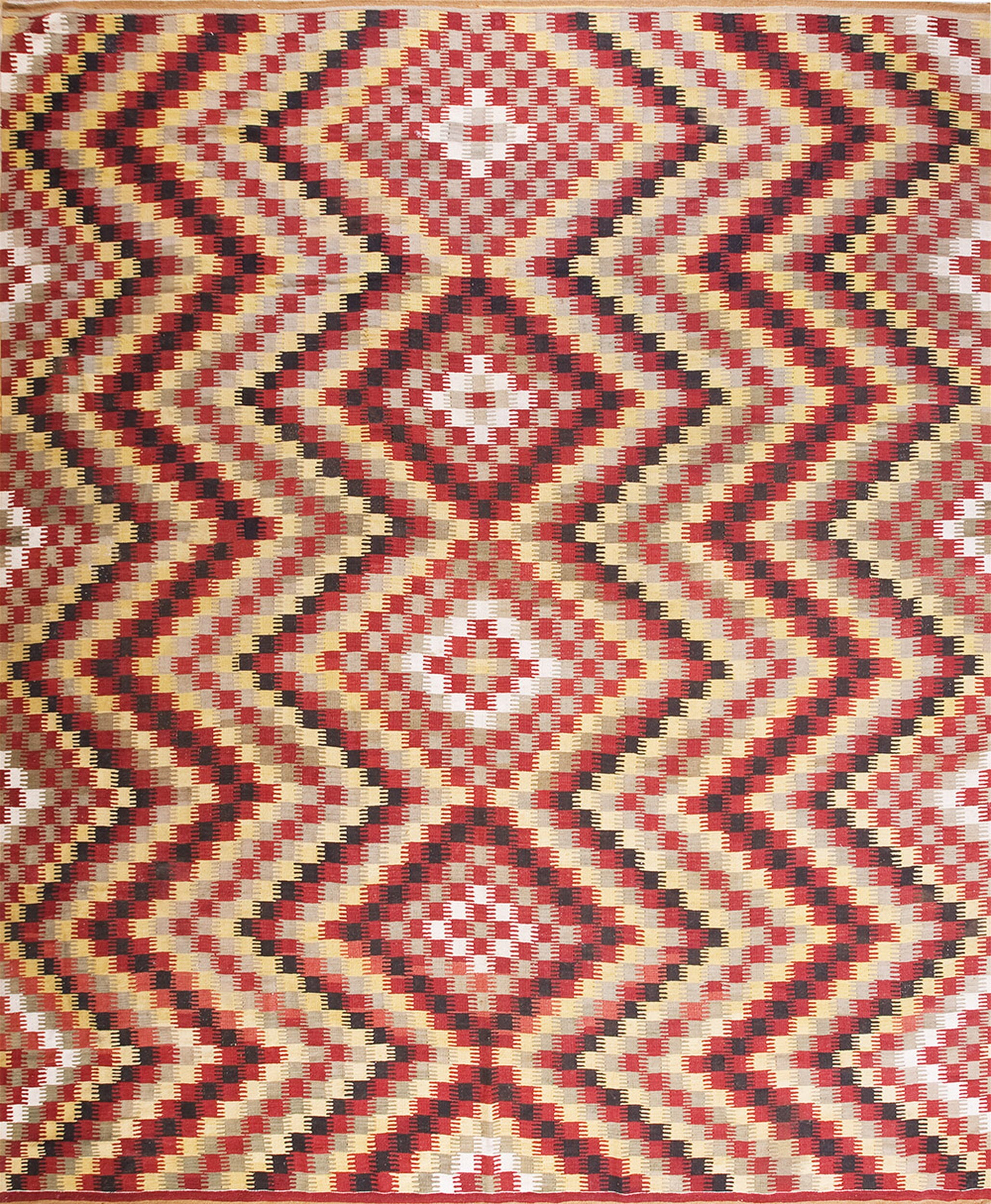 The scale of this piece is particularly noteworthy, presented in a commanding room size format that allows the dynamic design to fully articulate itself within a grand interior space. The composition features an arresting, repeating diamond and zigzag motif, executed as an allover geometric pattern that extends seamlessly across the entire field.