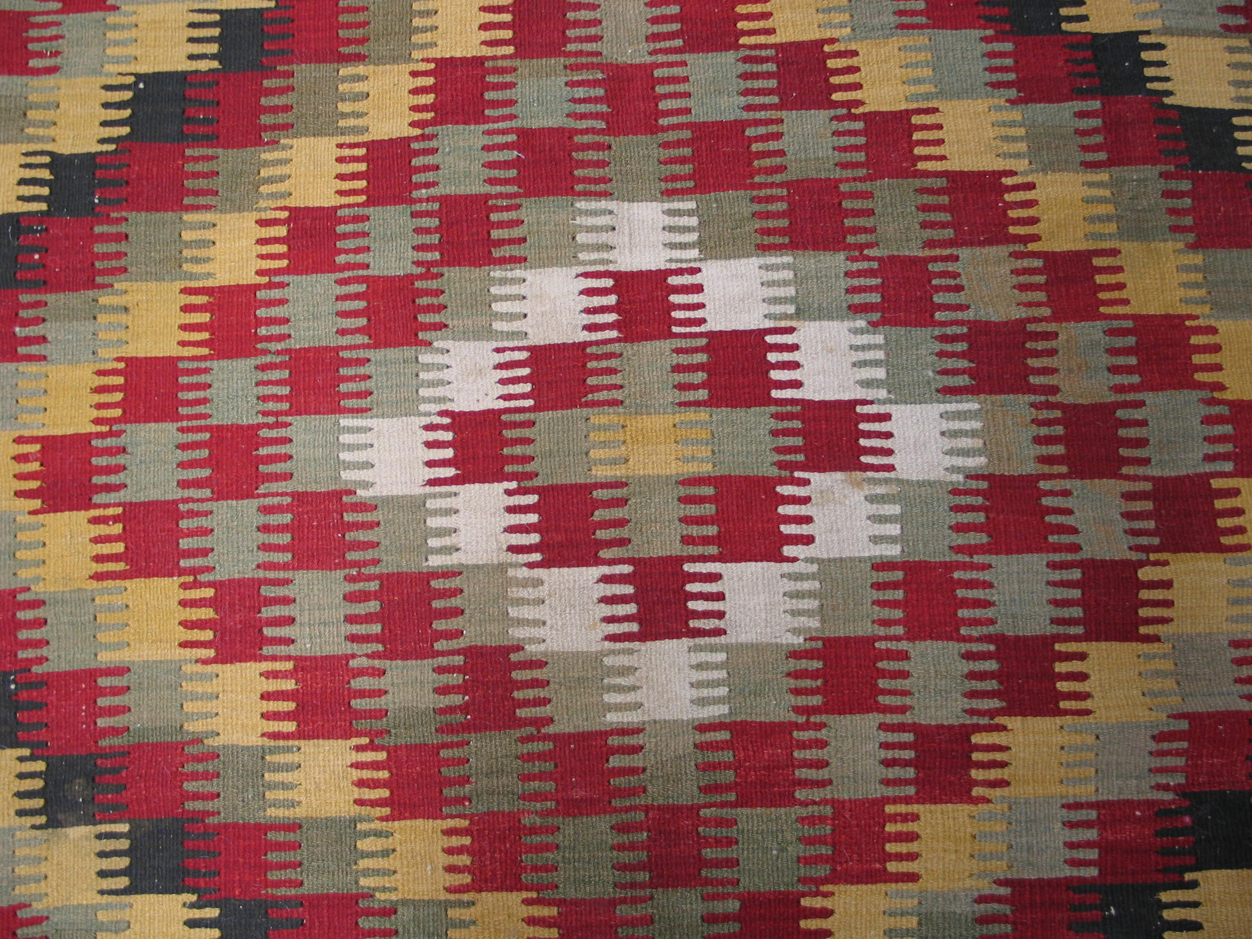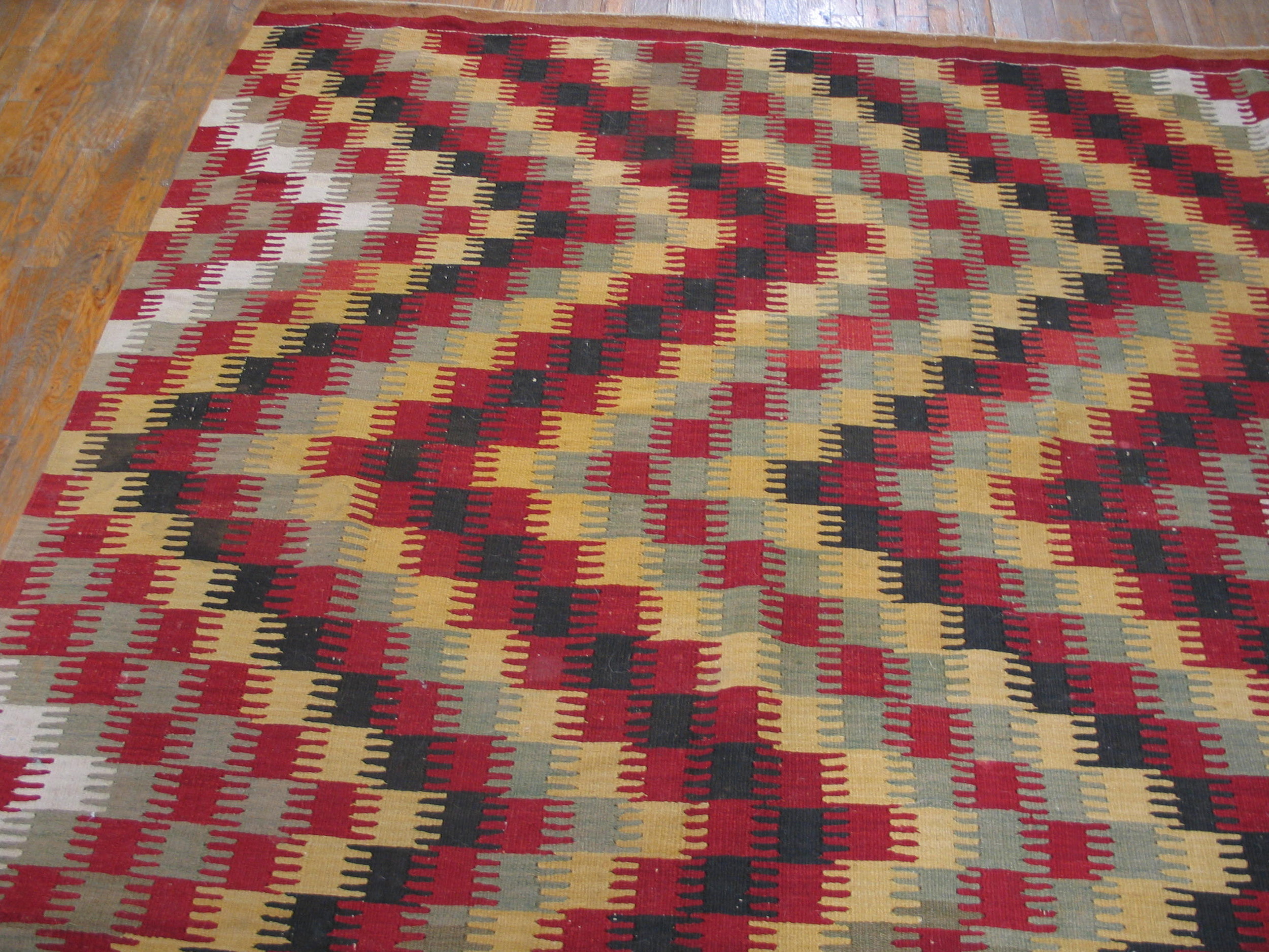 A vibrant and sophisticated palette defines the rug’s visual impact. Deep reds, rich ochres, charcoal blacks, and muted creams combine to create a striking multicolor jewel tone effect. The careful selection of natural dyes ensures that the colors retain their depth and clarity, a testament to the weaving artistry of the early 20th century.