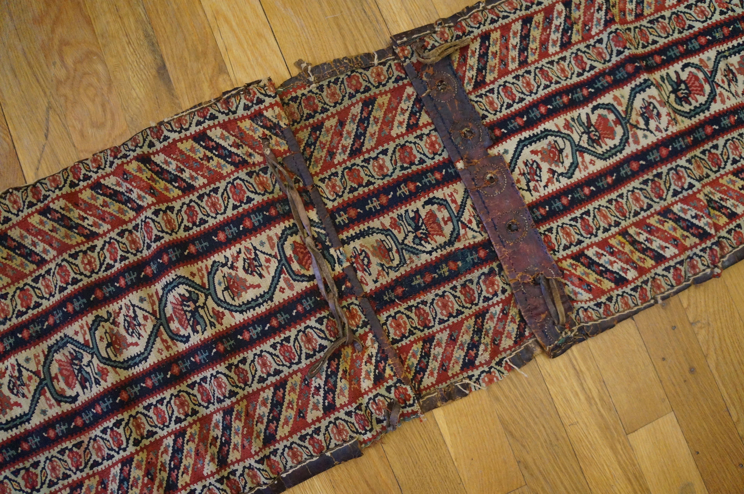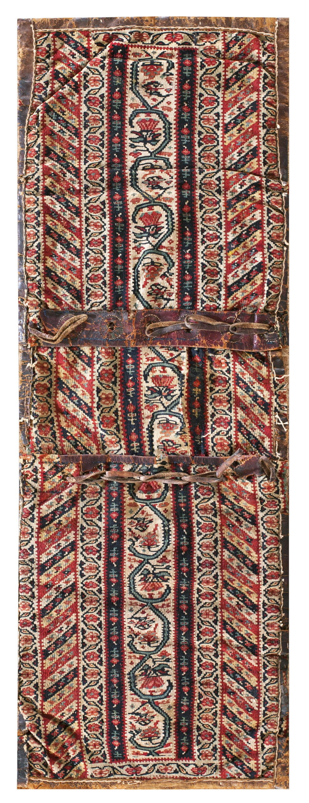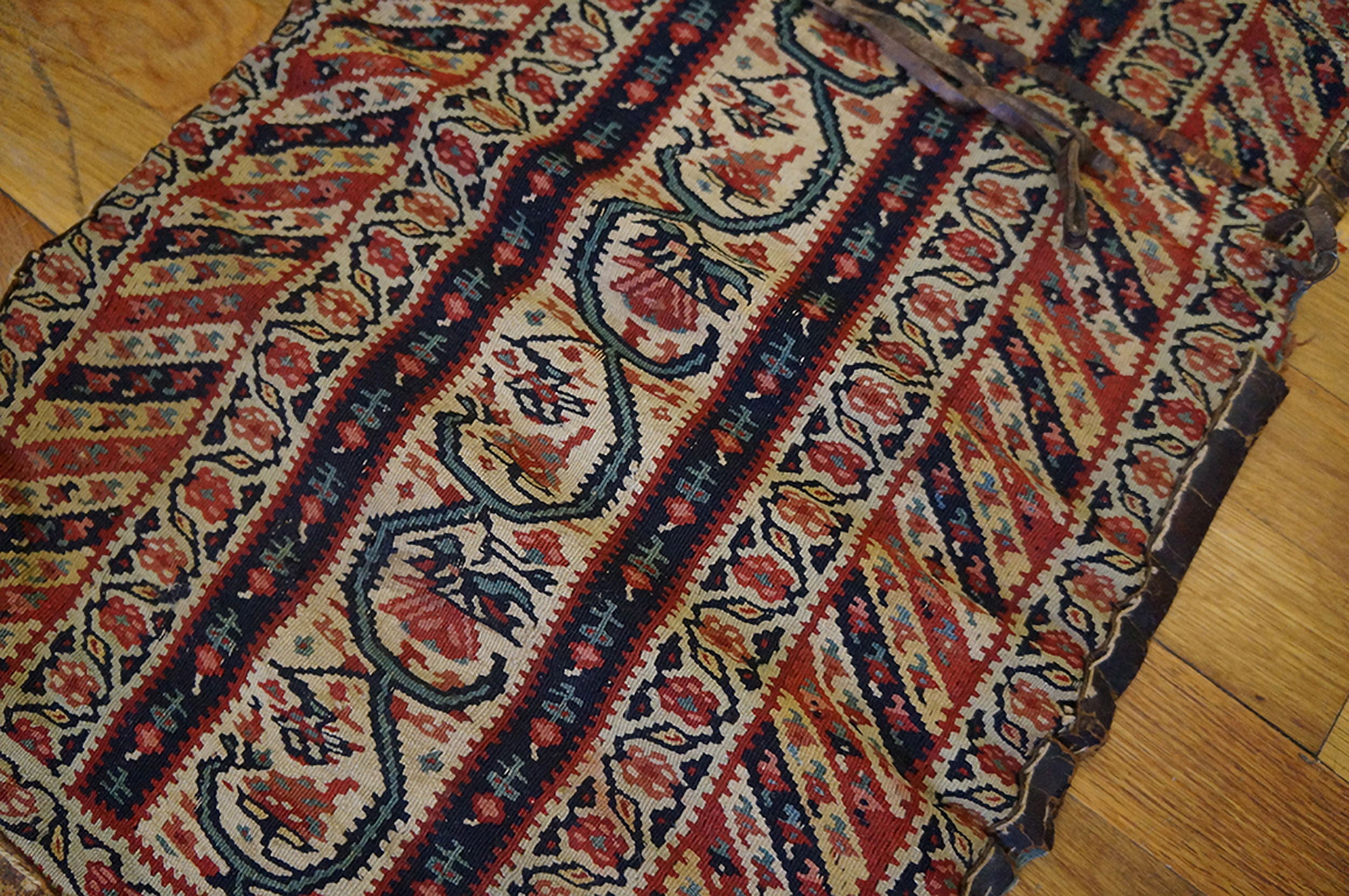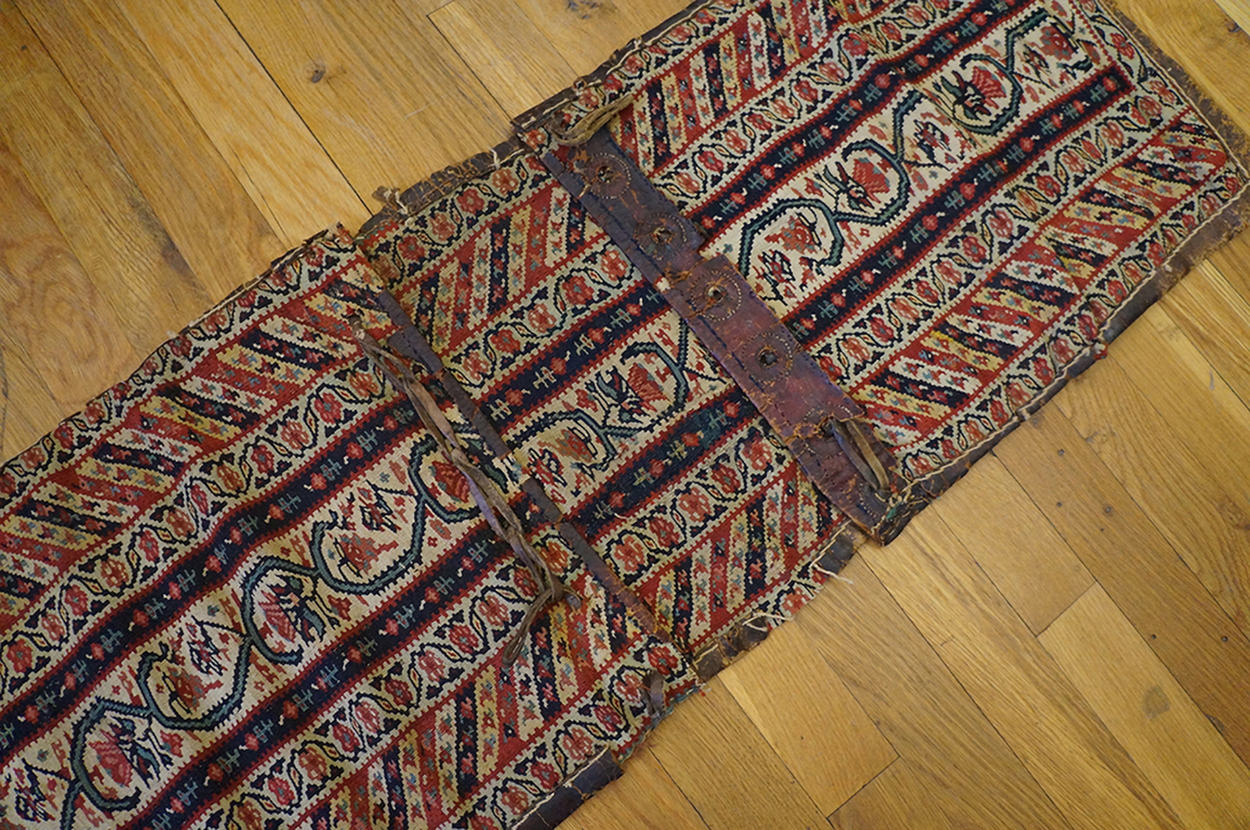 Antique Kilim – Senneh Persian Multicolor 1880s Rug, Circa Date: 1880s. This exceptional example of a flat woven kilim originates from the Senneh region of Persia, renowned for its highly detailed and finely executed weaving tradition. The piece is clearly a tribal saddlebag (or ‘khorjin’), evidenced by the original leather straps and the segmented structure, offering a rare glimpse into utilitarian textile history.