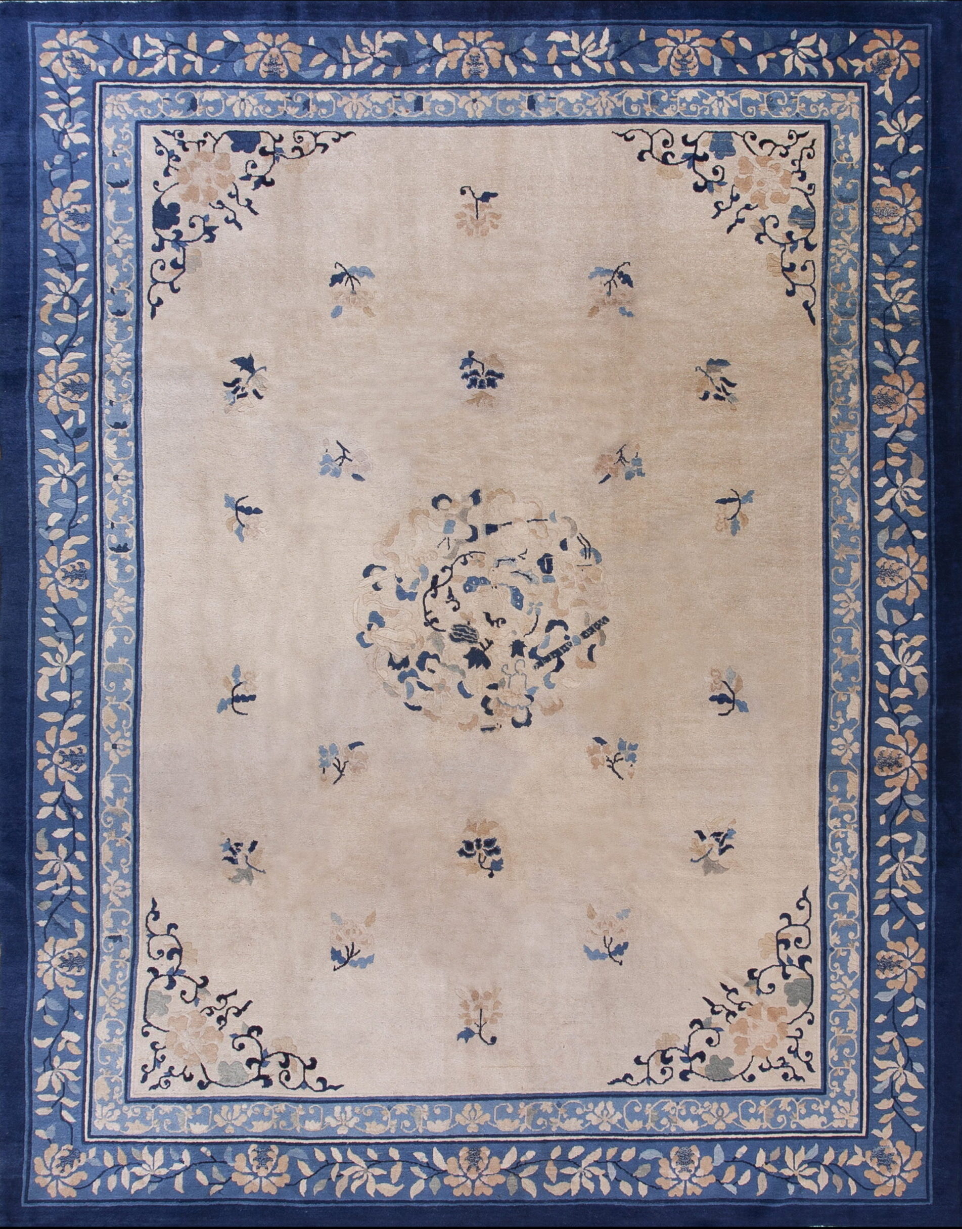 The expansive field is rendered in a soft, luminous ivory color, characteristic of the finest wools used during this period. This neutral ground provides a striking contrast to the deep, saturated indigo blue border, creating visual definition and structure that frames the entire composition.