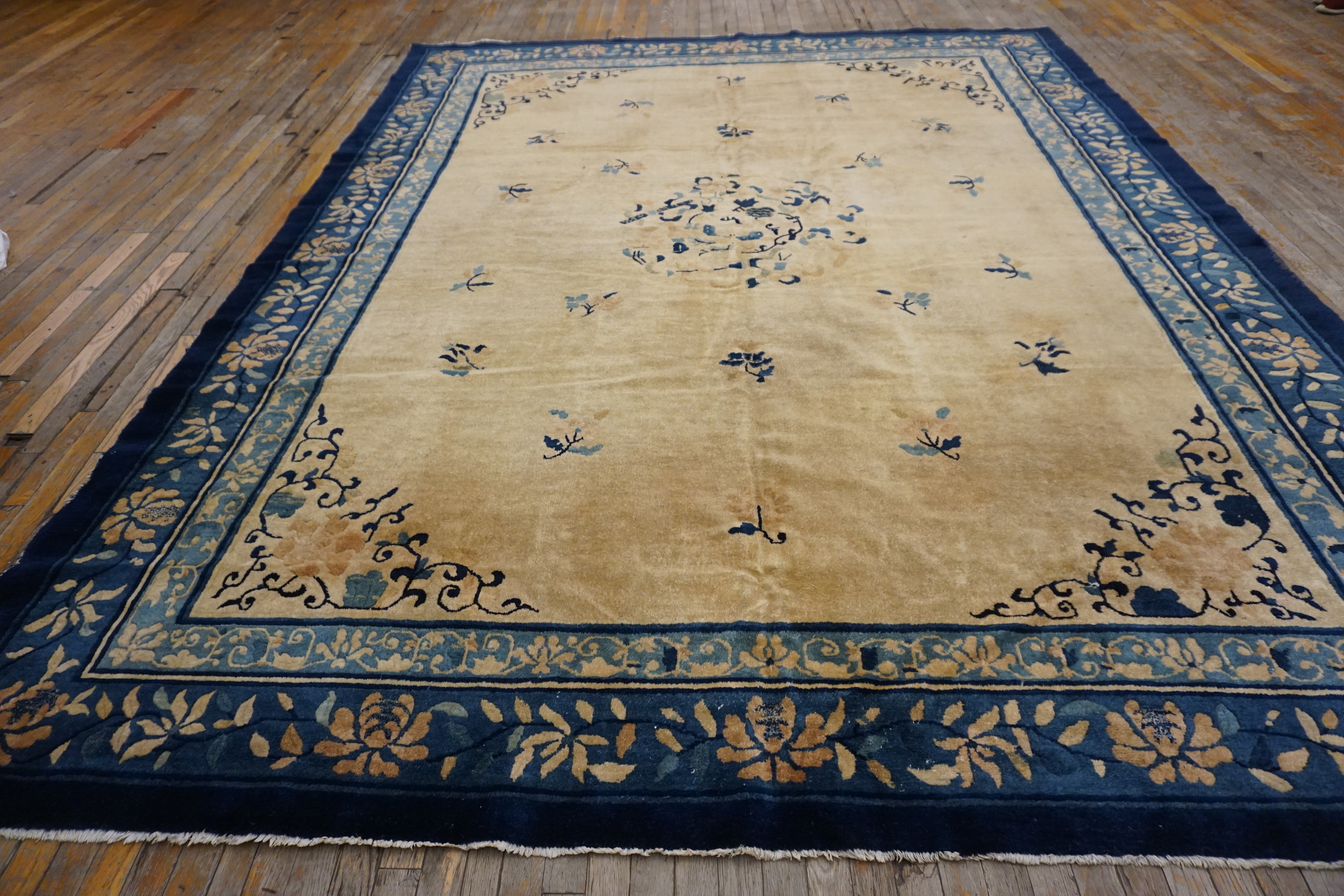 Antique Knotted Rectangle 1920s Chinese – Peking Wool Ivory Room Size Rug, Circa Date: 1920s. This superb example of early 20th-century Chinese weaving, specifically from the Peking region, possesses a generous scale. Its dimensions make it a highly desirable room size rug, perfectly suited for contemporary interiors seeking historical depth and sophisticated grounding.