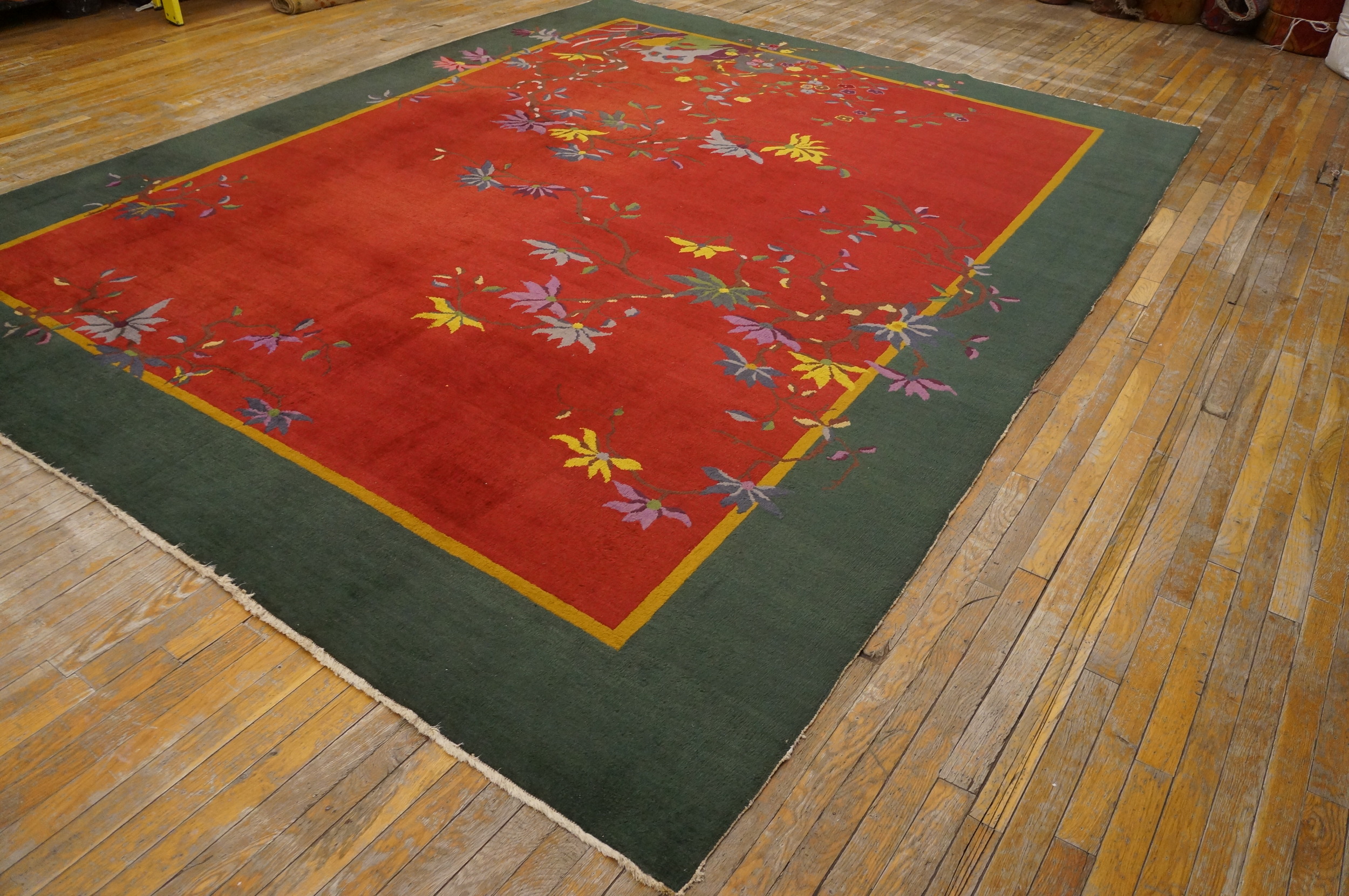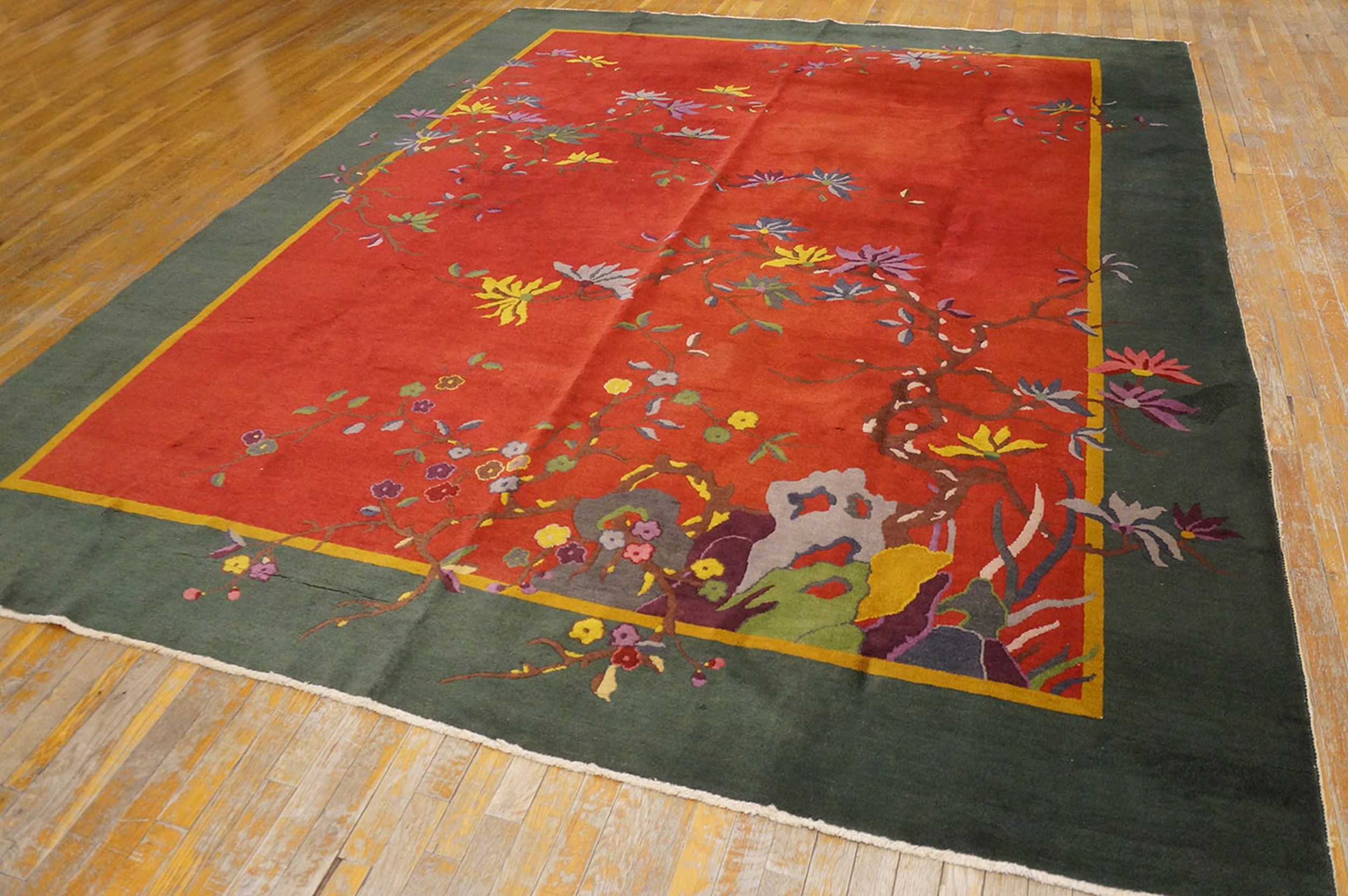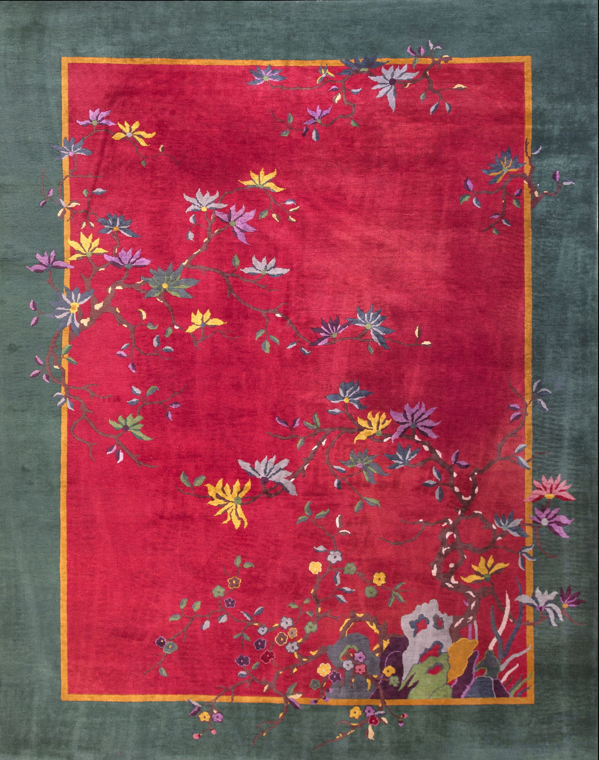 Antique Knotted Wool Rectangle Room Size 1920s Chinese – Art Deco Rug, Country of Origin: China, Circa Date: 1920s. This magnificent example of early 20th-century weaving represents the pinnacle of the Chinese Art Deco rugs movement, blending traditional Eastern motifs with the bold, simplified aesthetic of the Jazz Age. The deep, saturated color palette is instantly recognizable as a hallmark of this period.