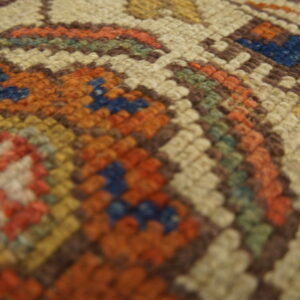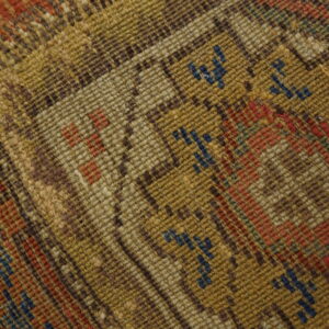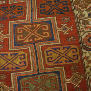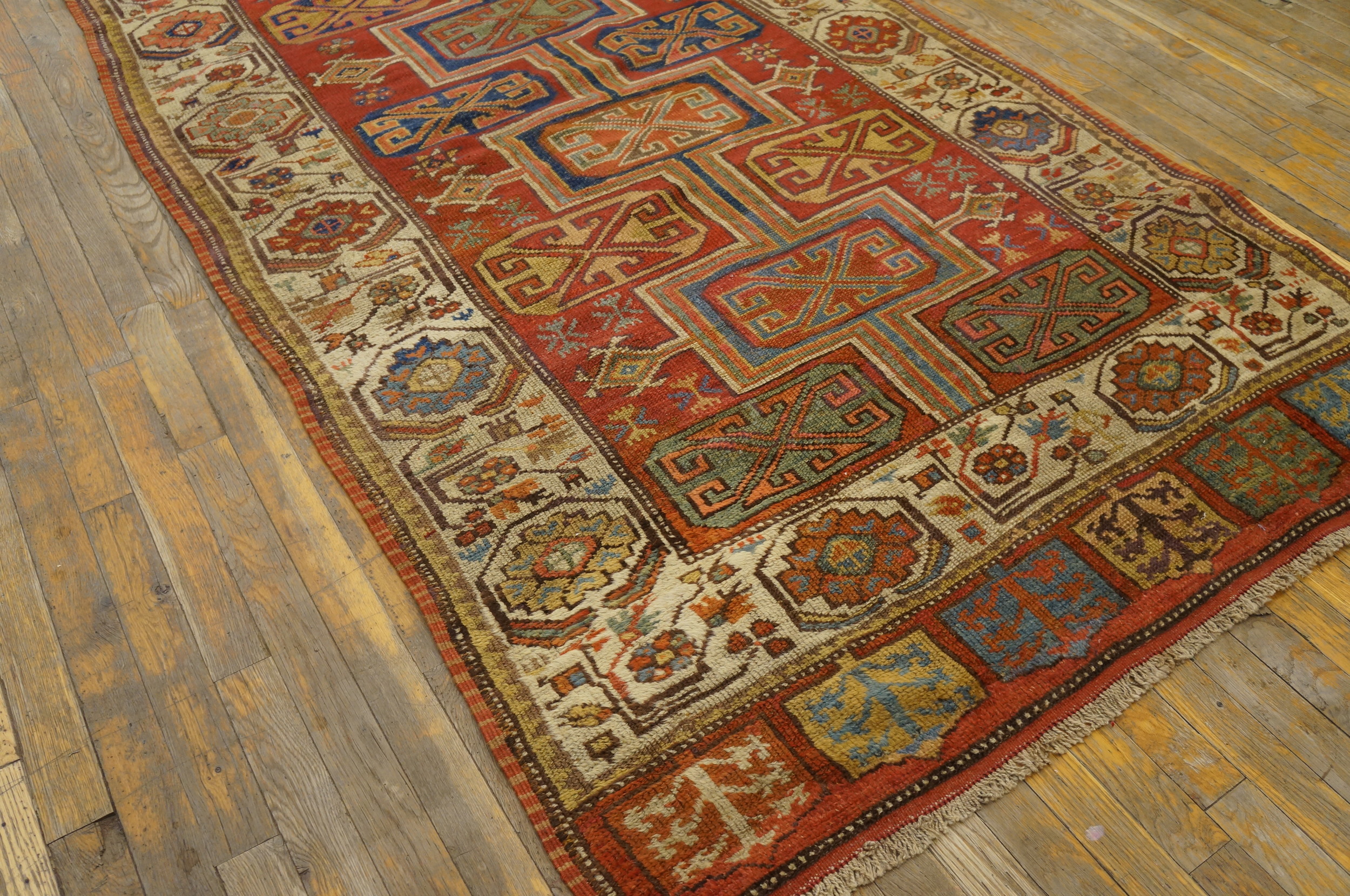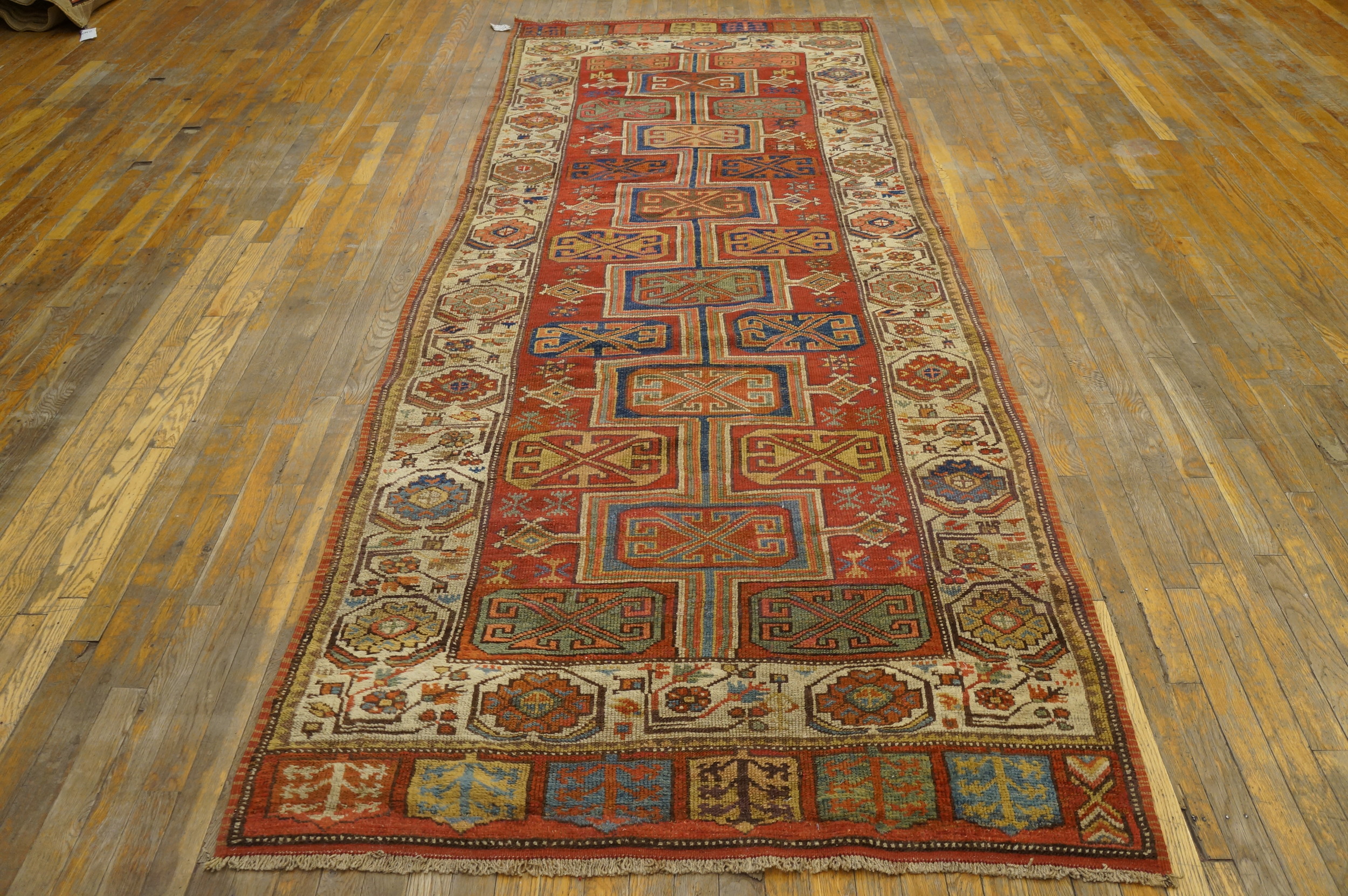 Unlike many centralized Anatolian designs, this piece employs an allover design approach, where the repeating geometric elements flow continuously down the length of the carpet, creating a dynamic visual rhythm suitable for long, narrow spaces. The ivory border features repeating stylized rosettes and octagons, offering a crisp contrast to the primary field color.