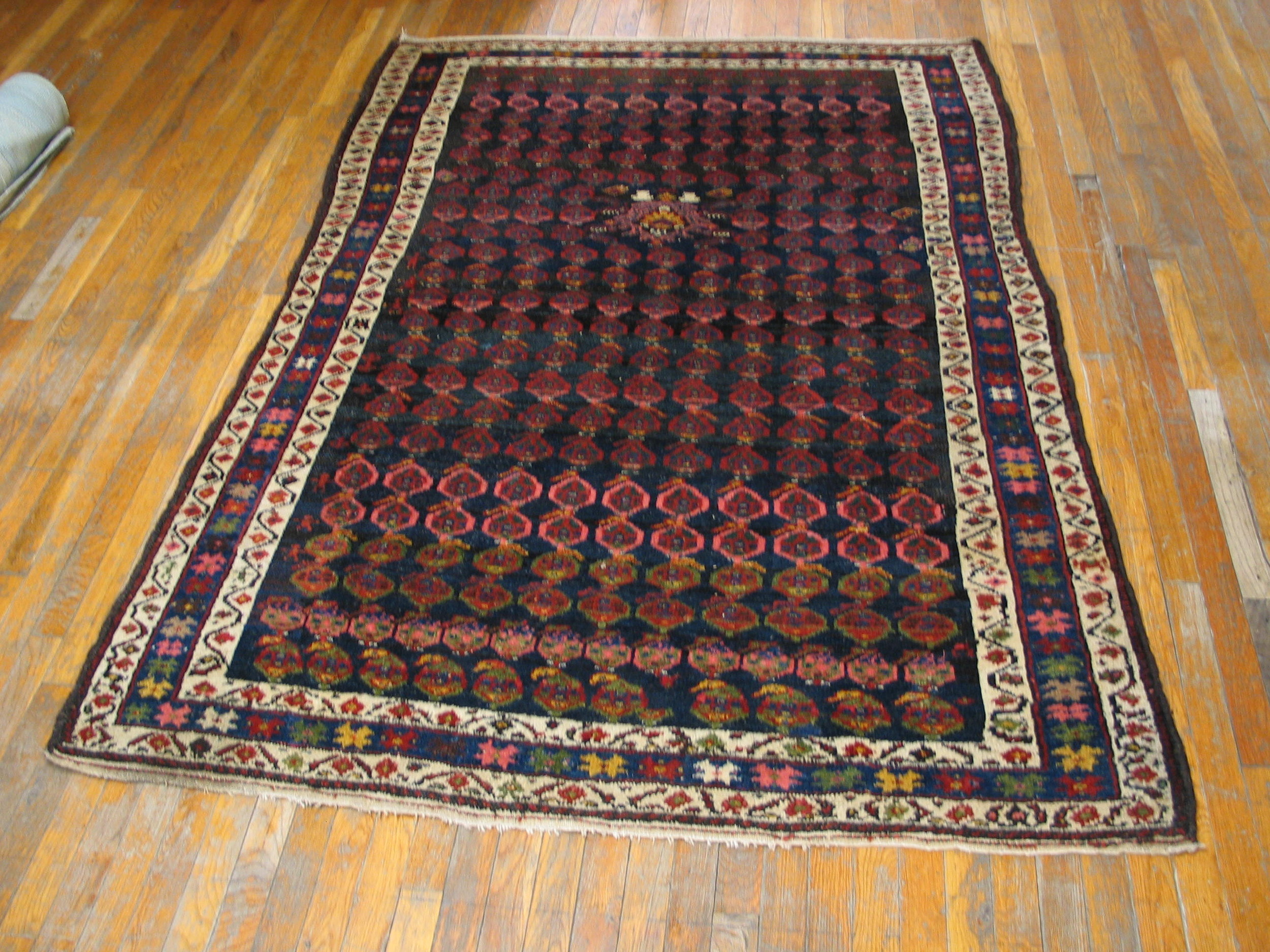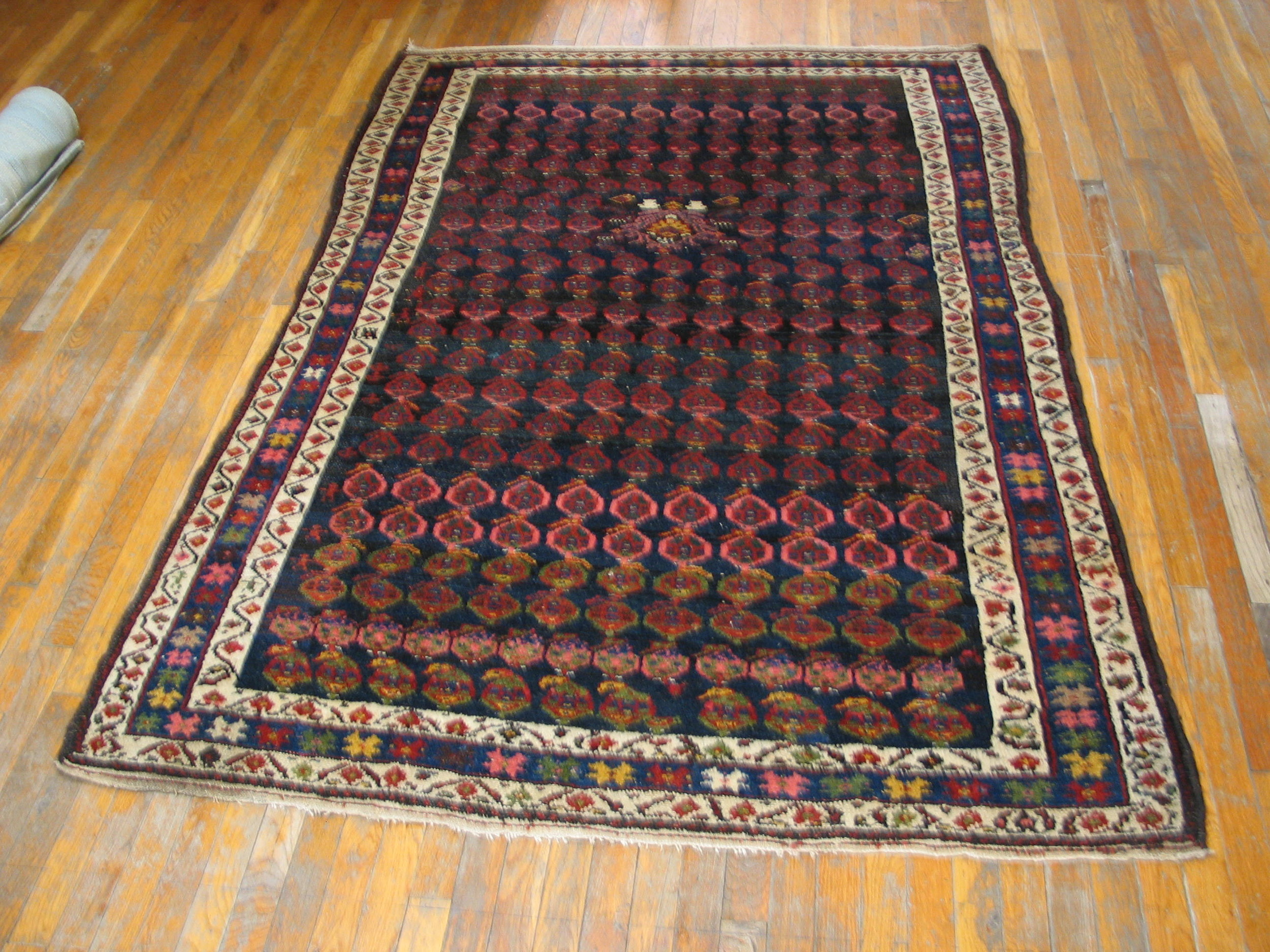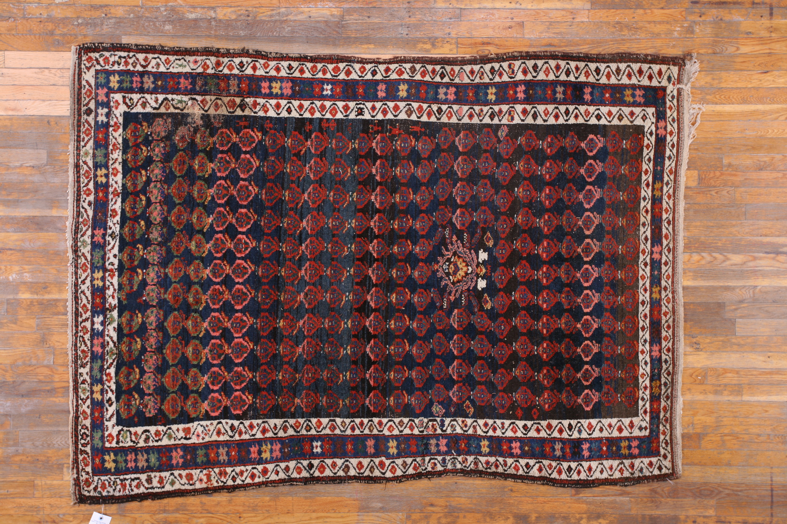 The field is dominated by a deep, resonant indigo, placing this piece firmly within the tradition of sophisticated blue color rugs. This dark ground provides a powerful contrast to the repeating, stylized boteh or shield motifs rendered in oxidized reds and subtle pinks, creating visual depth.