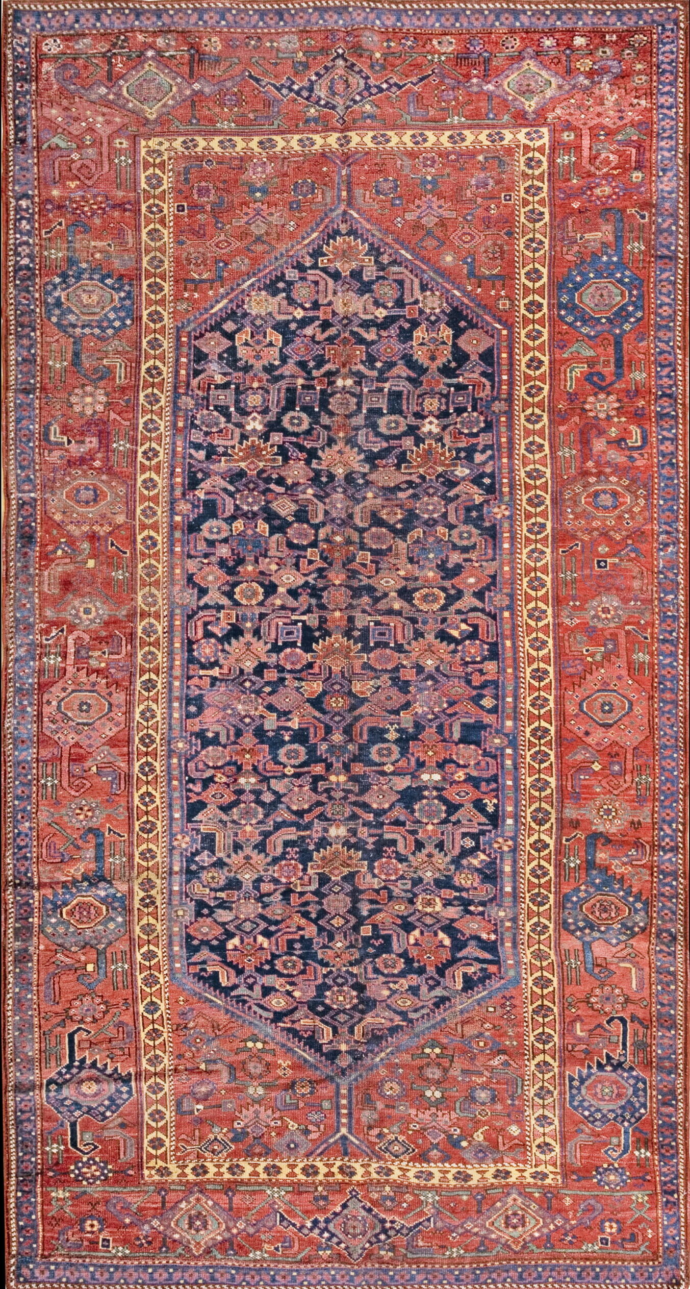 The palette is defined by a striking contrast between the saturated madder red border and the deep indigo central field. The central ground is densely populated with stylized tribal motifs rendered in subtle shades of lilac, terracotta, and pale green, all anchored by the rich, commanding blue color rugs. This masterful use of natural dyes creates a depth and complexity that modern reproductions cannot replicate.