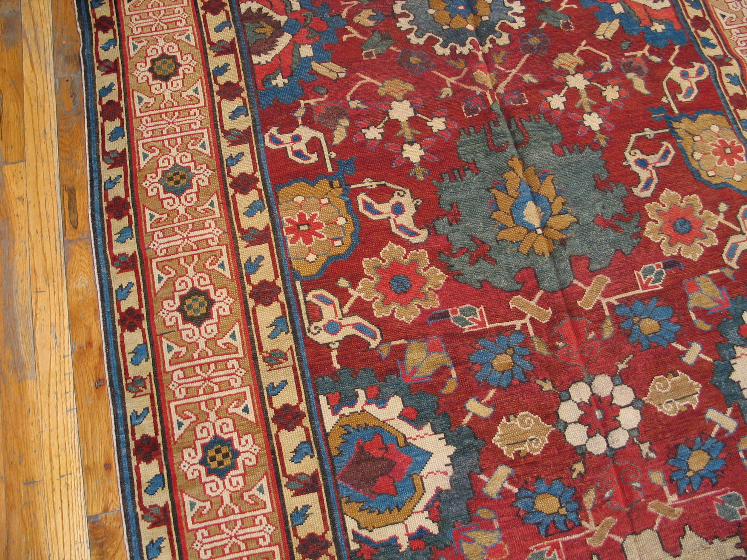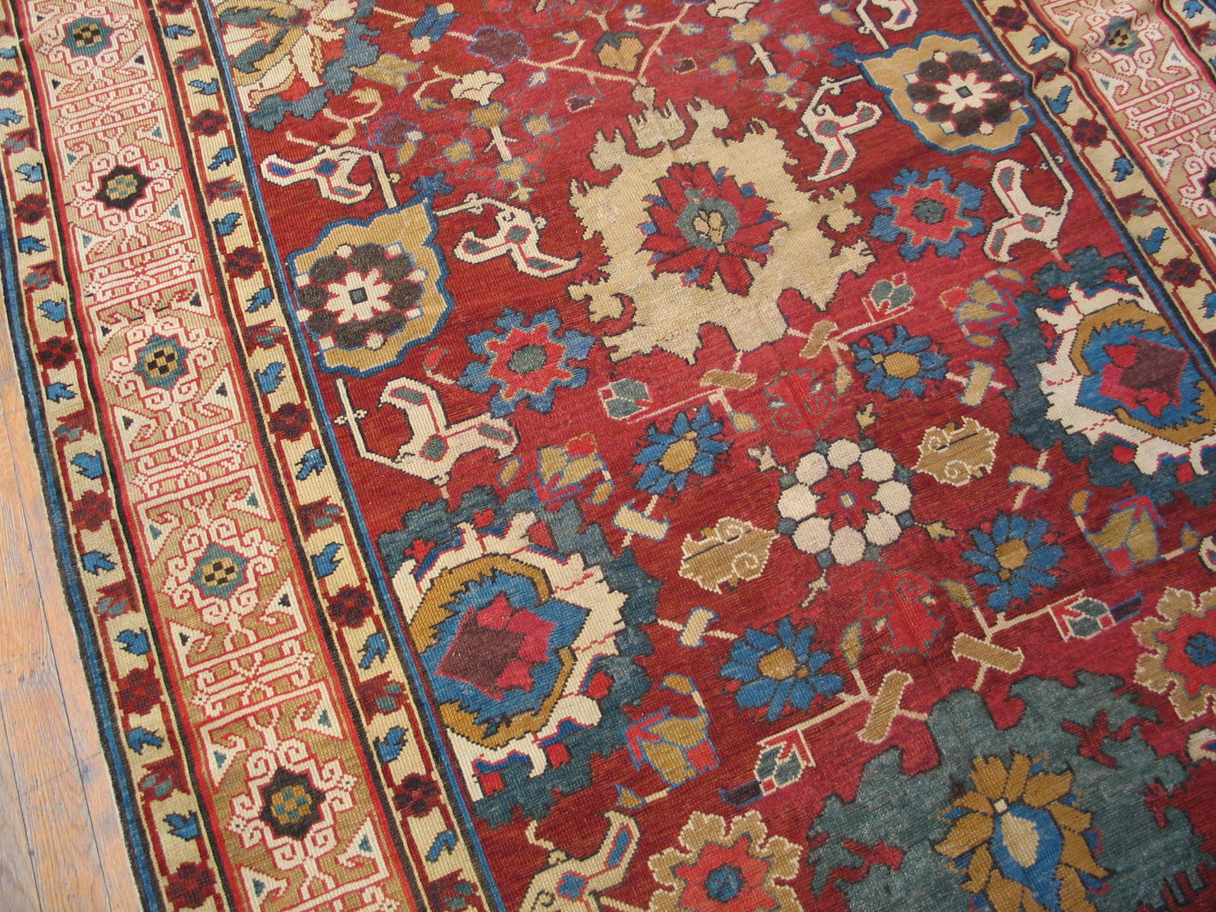 The palette is rich and earthy, dominated by deep madder reds, ochre yellows, and chocolate browns, punctuated by touches of vivid indigo and sage green. This strong, sophisticated colorway is typical of kurdish rugs woven in the early 20th century, reflecting the high quality of the local wool and the skill of the weaver.