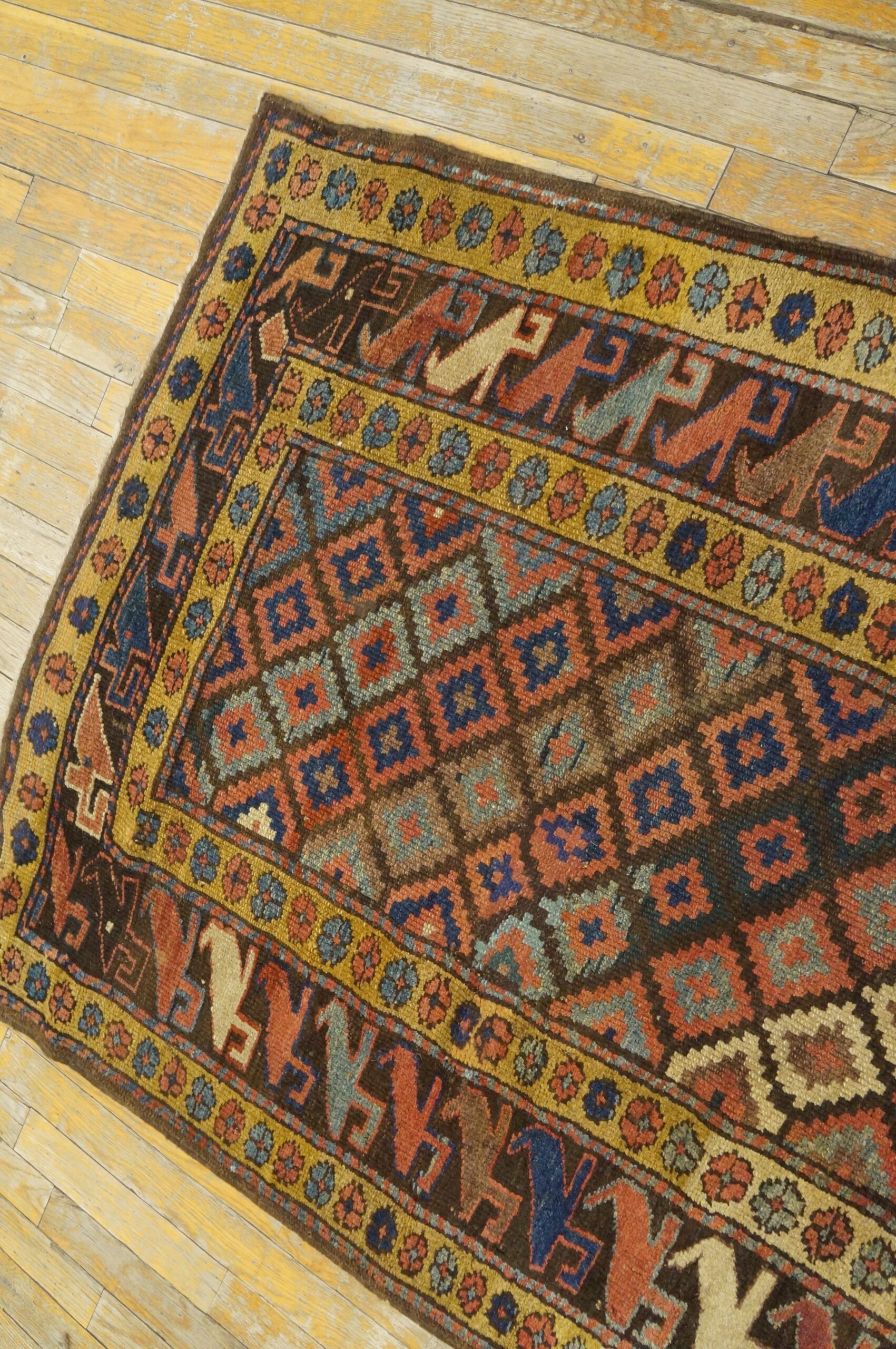A fascinating element of this piece is the highly stylized border, which frames the central geometry with a procession of abstracted zoomorphic figures. These archaic motifs, often interpreted as stylized bird rugs or animals, reflect the enduring symbolic language woven into Kurdish textiles, offering a glimpse into the weaver’s cultural narrative.