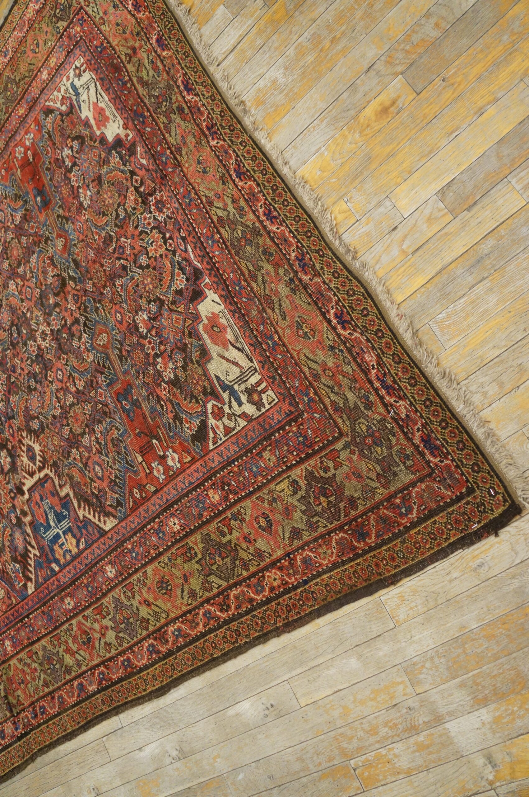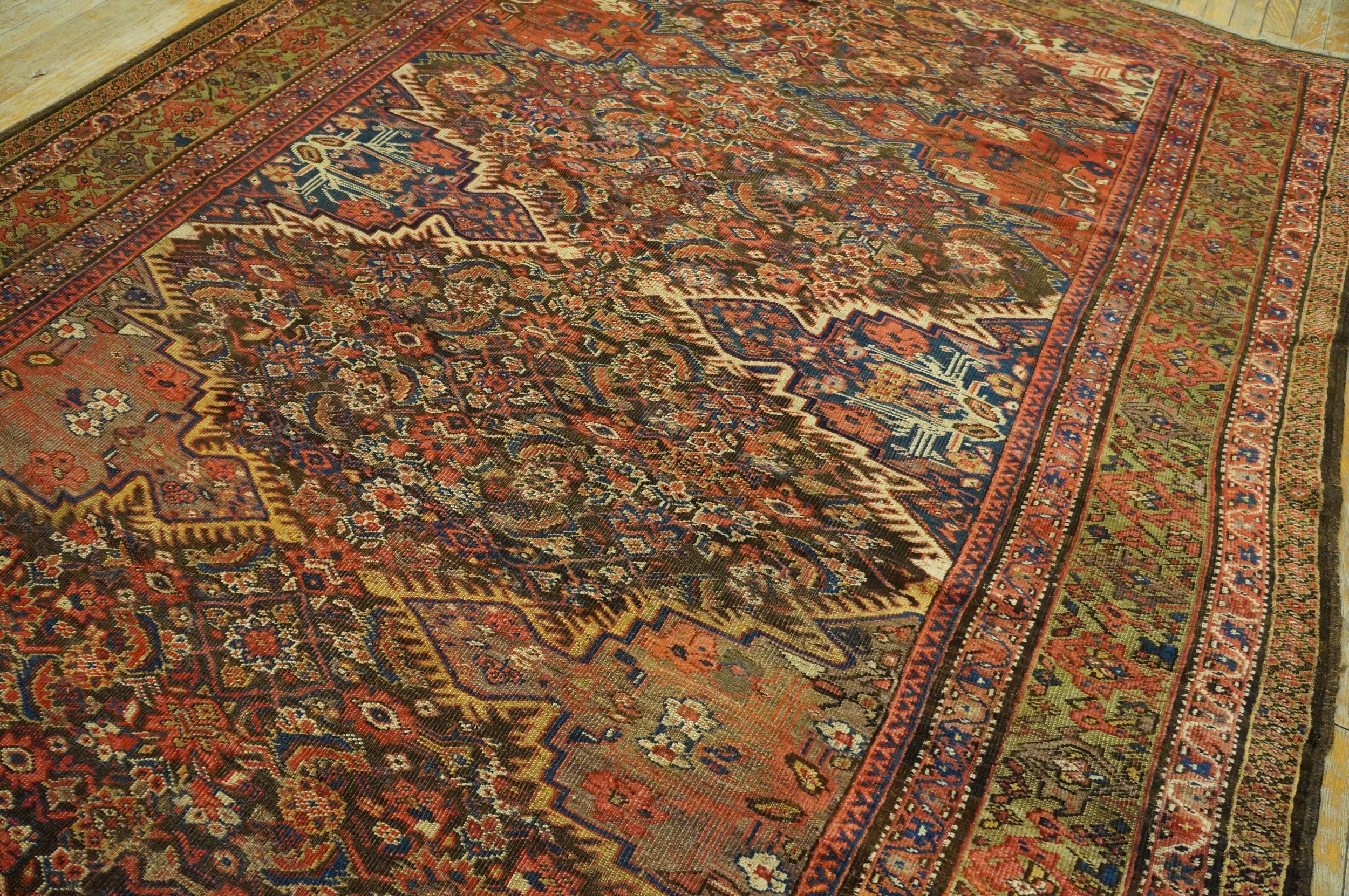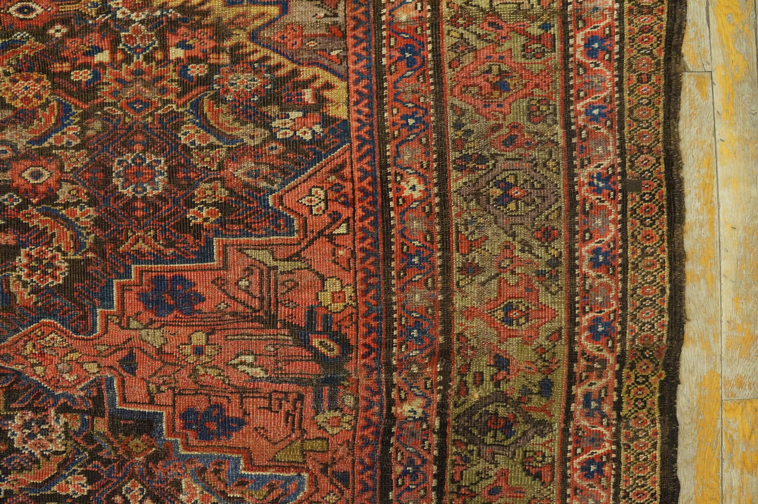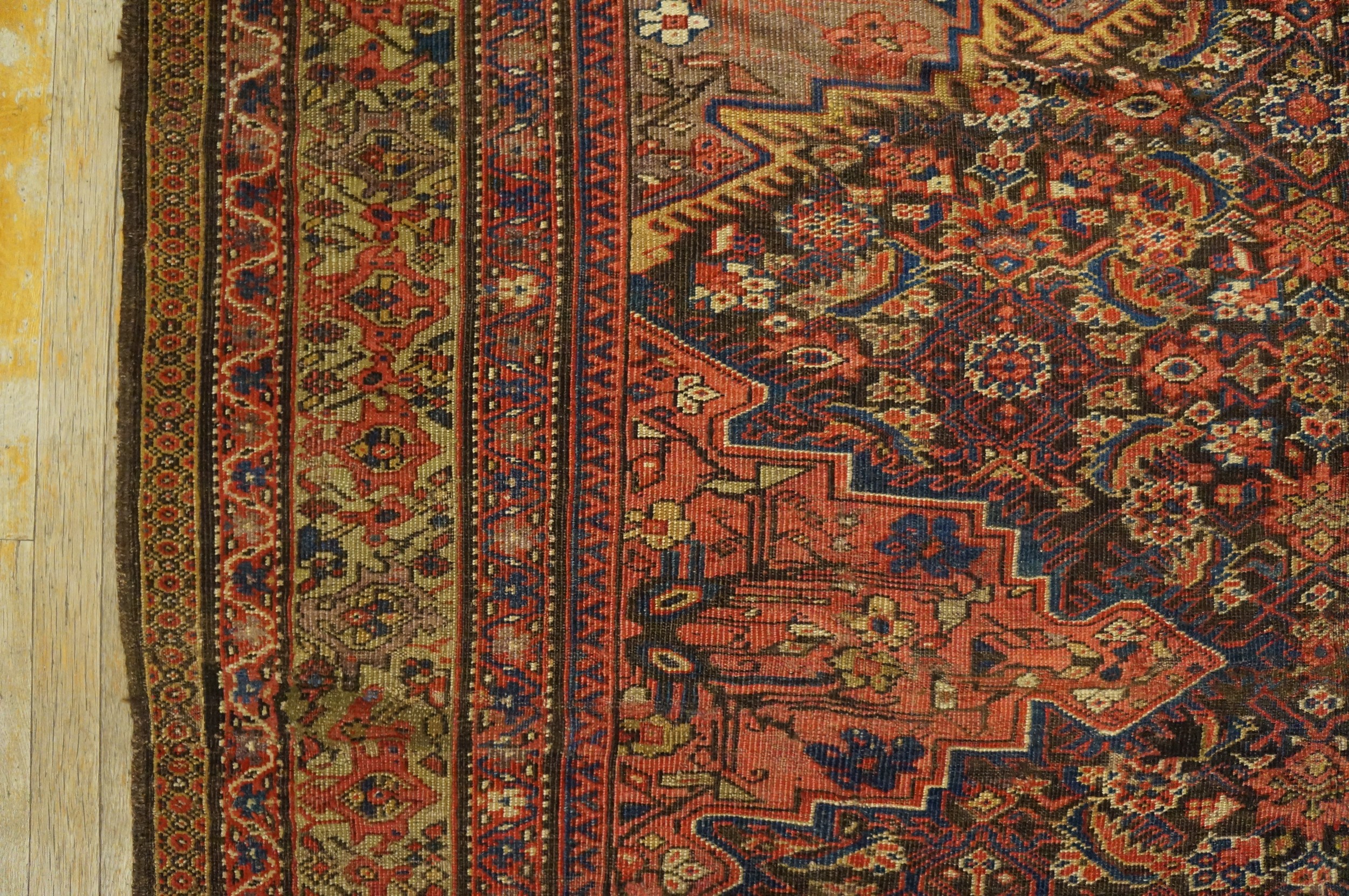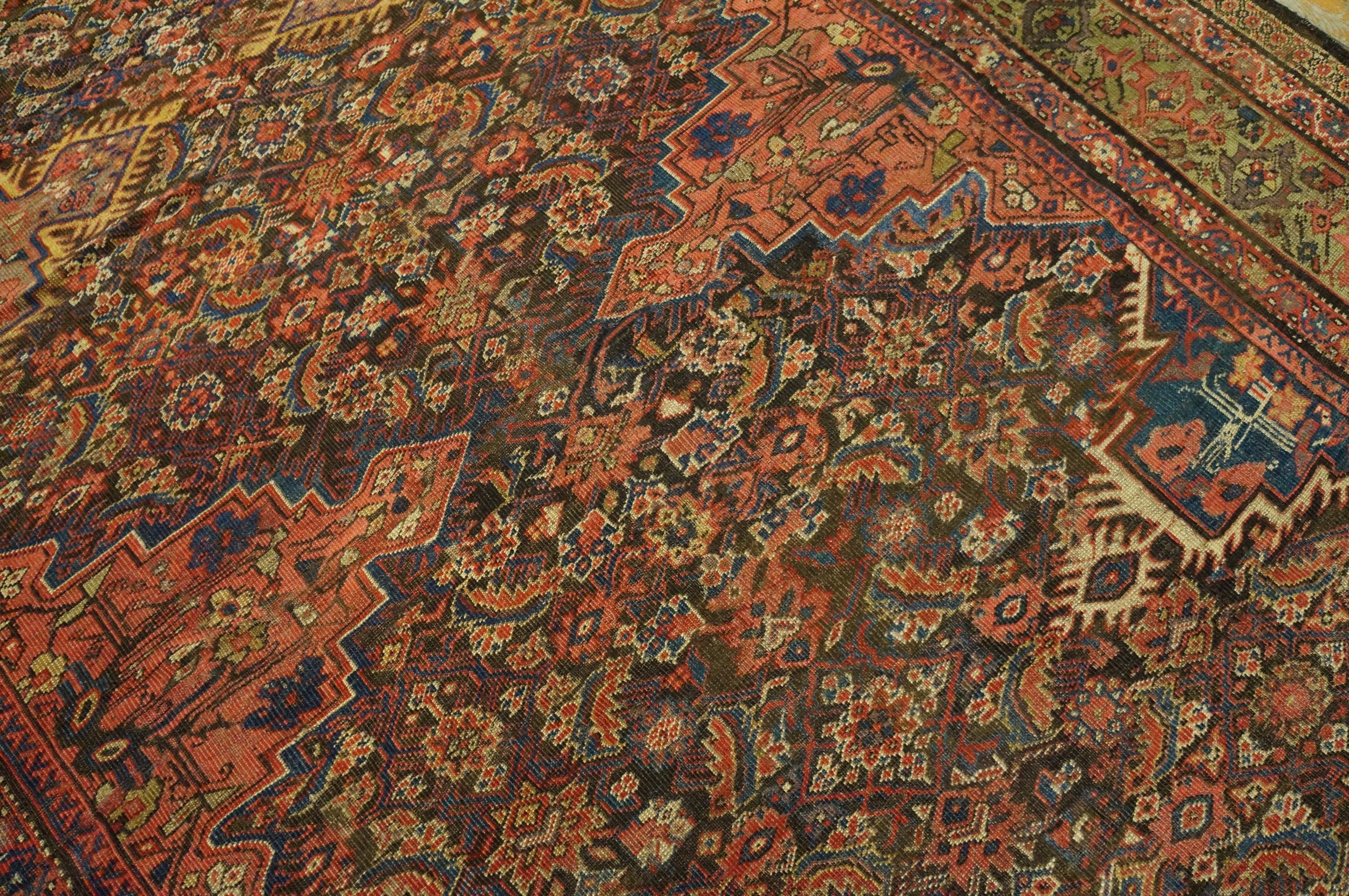 Antique Kurdish Persian Medallion Knotted Rug, Circa Date: 1900s. This exceptional example of antique rugs showcases the robust, deeply saturated palette and intricate geometric complexity characteristic of Kurdish weaving traditions in the early 20th century. The composition is defined by a powerful, stepped central medallion surrounded by a dense field of stylized botanical and tribal motifs.