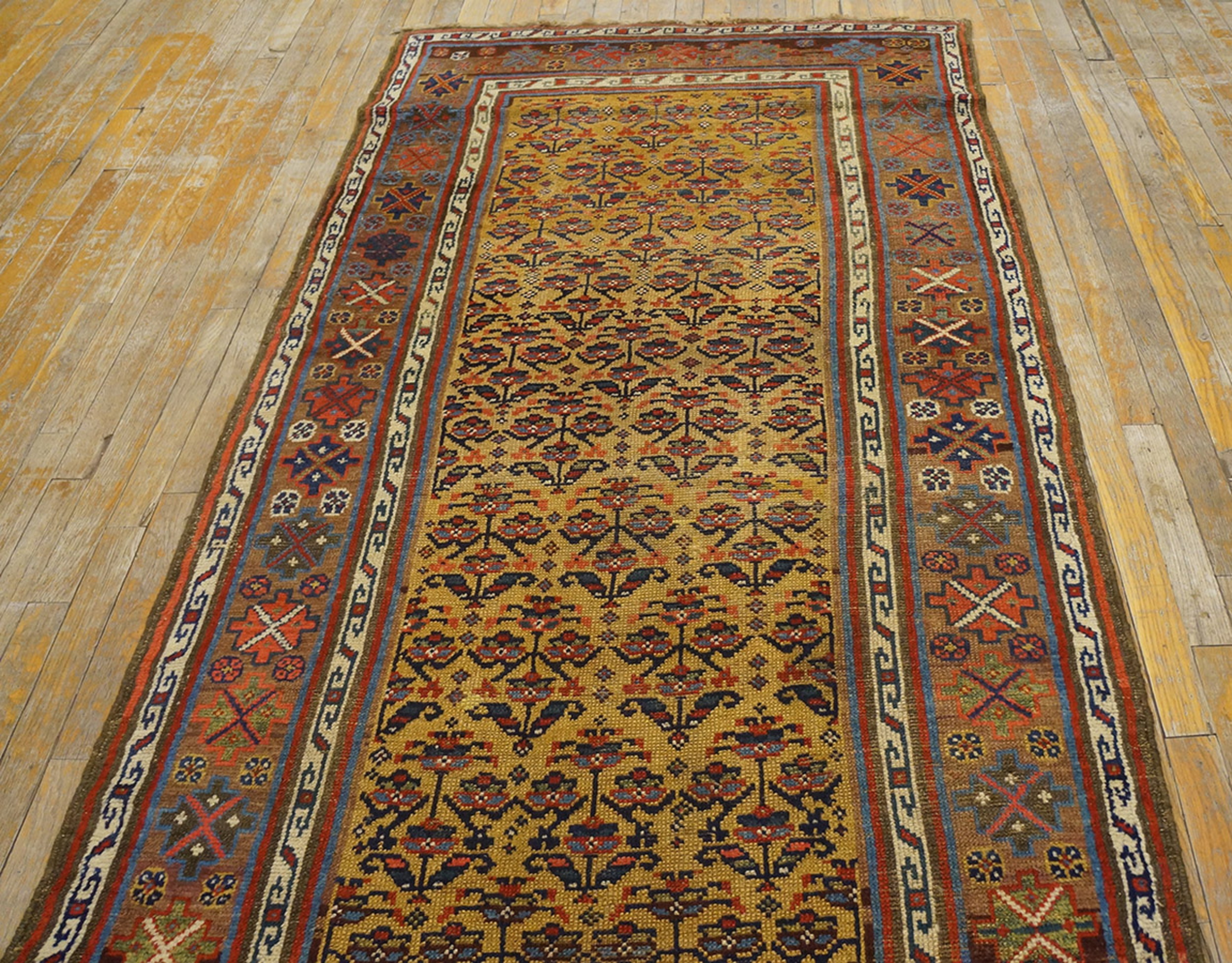 Antique Kurdish Persian Yellow 1880s Rug, Circa Date: 1880s. This exceptional late 19th-century weaving represents the robust, nomadic artistry characteristic of kurdish weavings. Its narrow, elongated format suggests it was originally intended for a specific domestic space within the tribal environment, showcasing the deep tradition of Persian village craft.