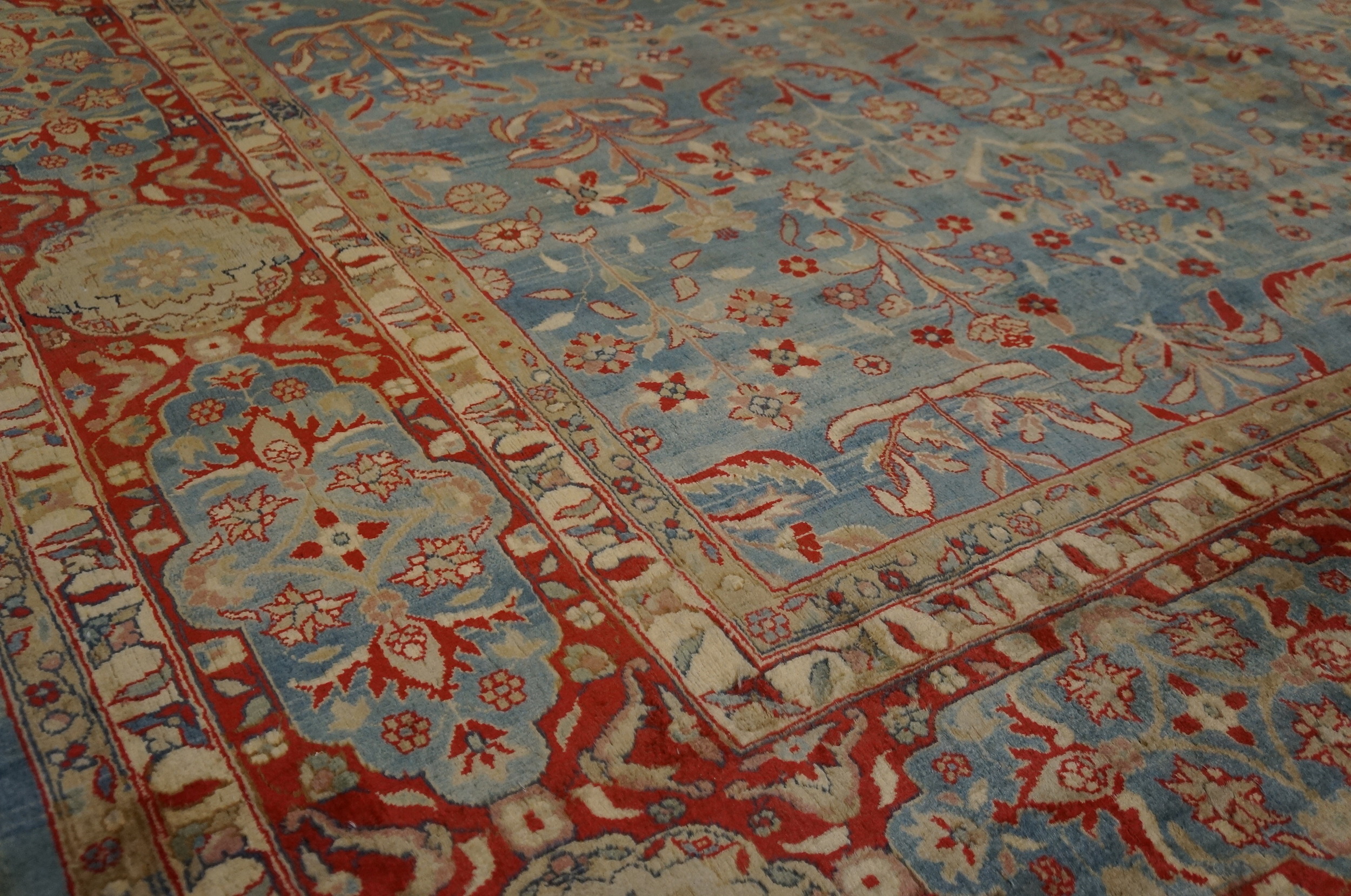 The field is dominated by a stunning, softly faded sky blue, exhibiting beautiful abrash that speaks to the use of natural dyes and the passage of time. The contrast between this ethereal ground and the detailed terracotta and cream motifs is striking, making it an ideal candidate for collectors seeking refined blue color rugs that offer both warmth and coolness simultaneously.