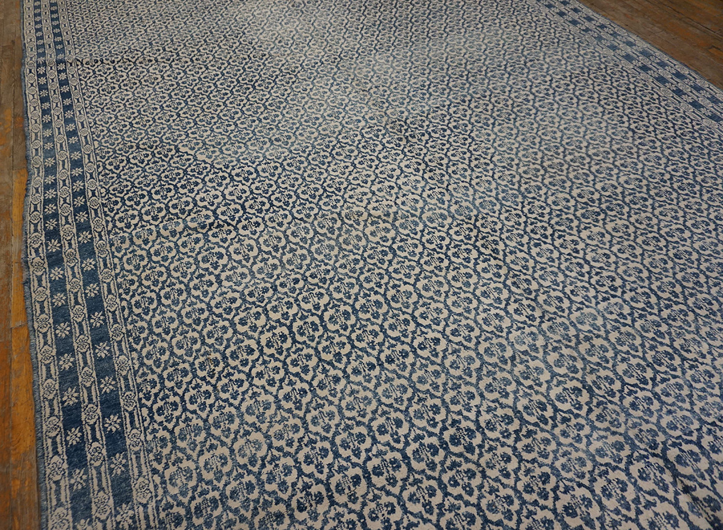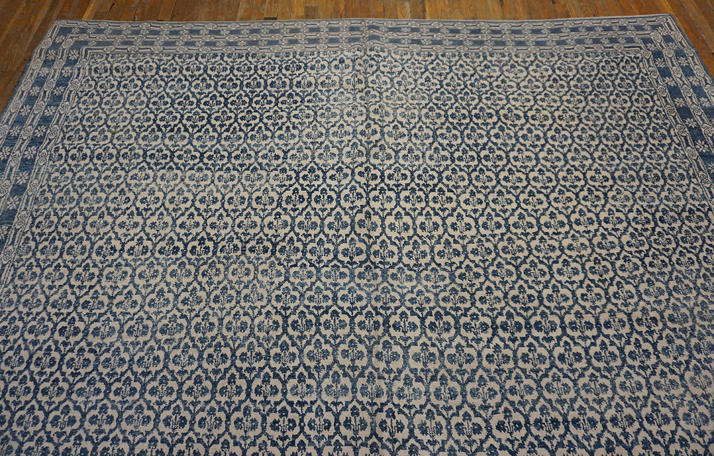 Constructed primarily with a cotton foundation and pile, which is typical for many large-scale Indian carpets of this era, the weave is dense yet supple. The repeating quatrefoil motif provides a structured elegance that anchors a grand space. Given its substantial dimensions, this piece is classified among the finest room size rugs, suitable for major architectural settings.