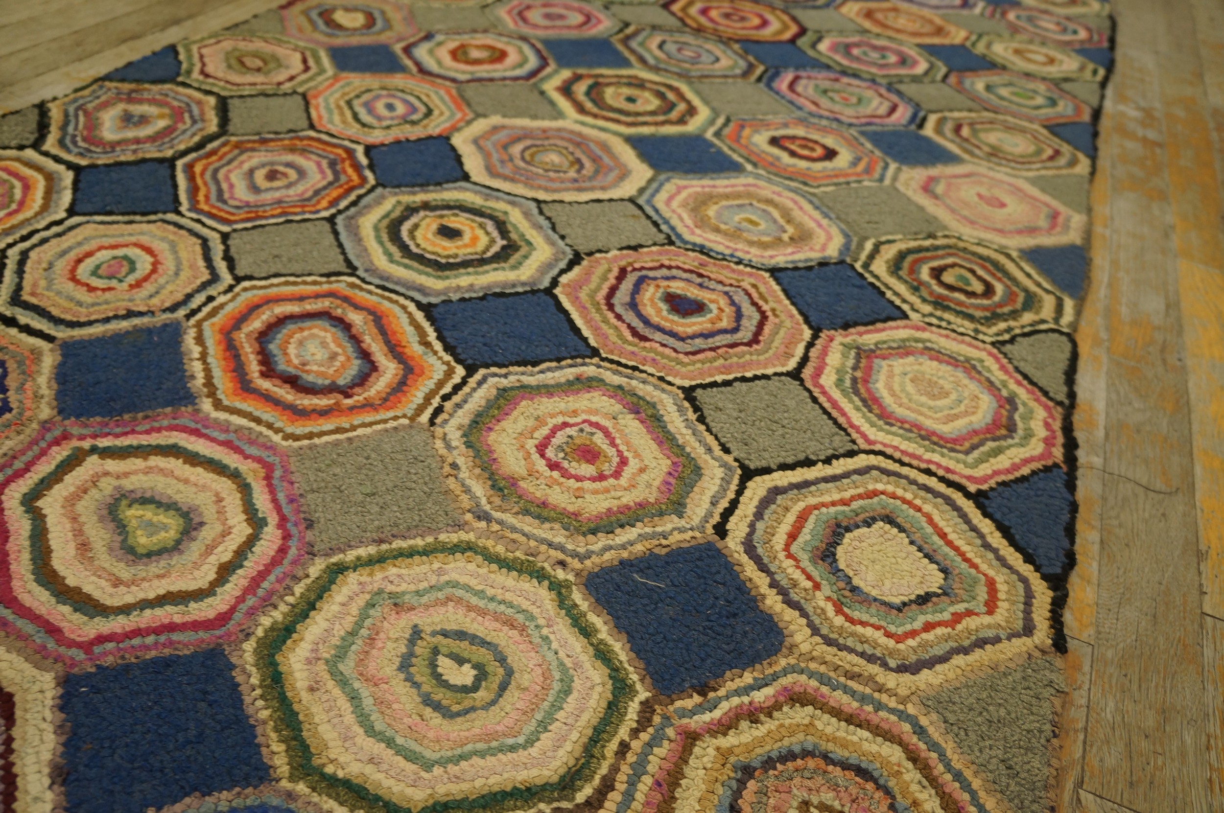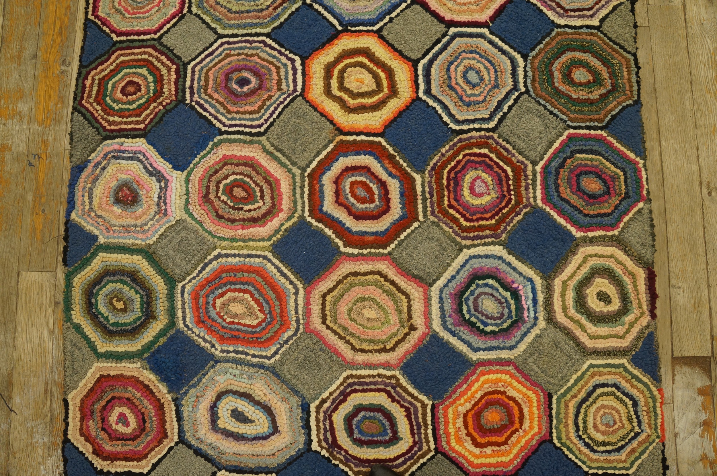 The inherent charm of the hooked technique lies in its resourceful use of varied fabric scraps, resulting in subtle variations in hue and texture within each geometric cell. The primary ground color—a rich, saturated indigo—provides a necessary contrast, allowing the complex, swirling patterns within the octagons to achieve maximum visual depth and definition.