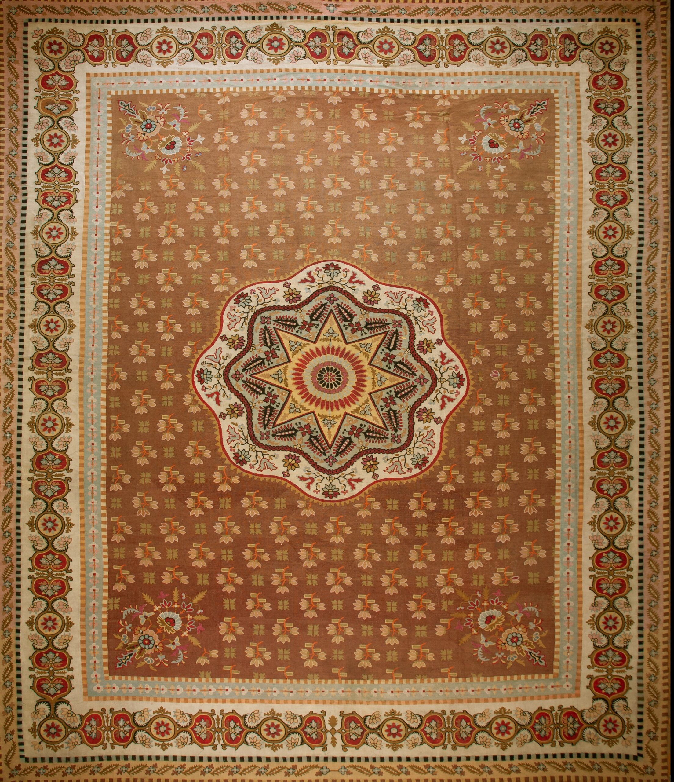 The entire design is contained by a complex series of multi-layered borders, featuring alternating cartouches and stylized floral roundels set against an ivory ground. The sheer scale of this large oversized rug suggests it was commissioned for a grand salon or formal receiving hall, reflecting the opulence and architectural demands of the period’s most distinguished interiors.