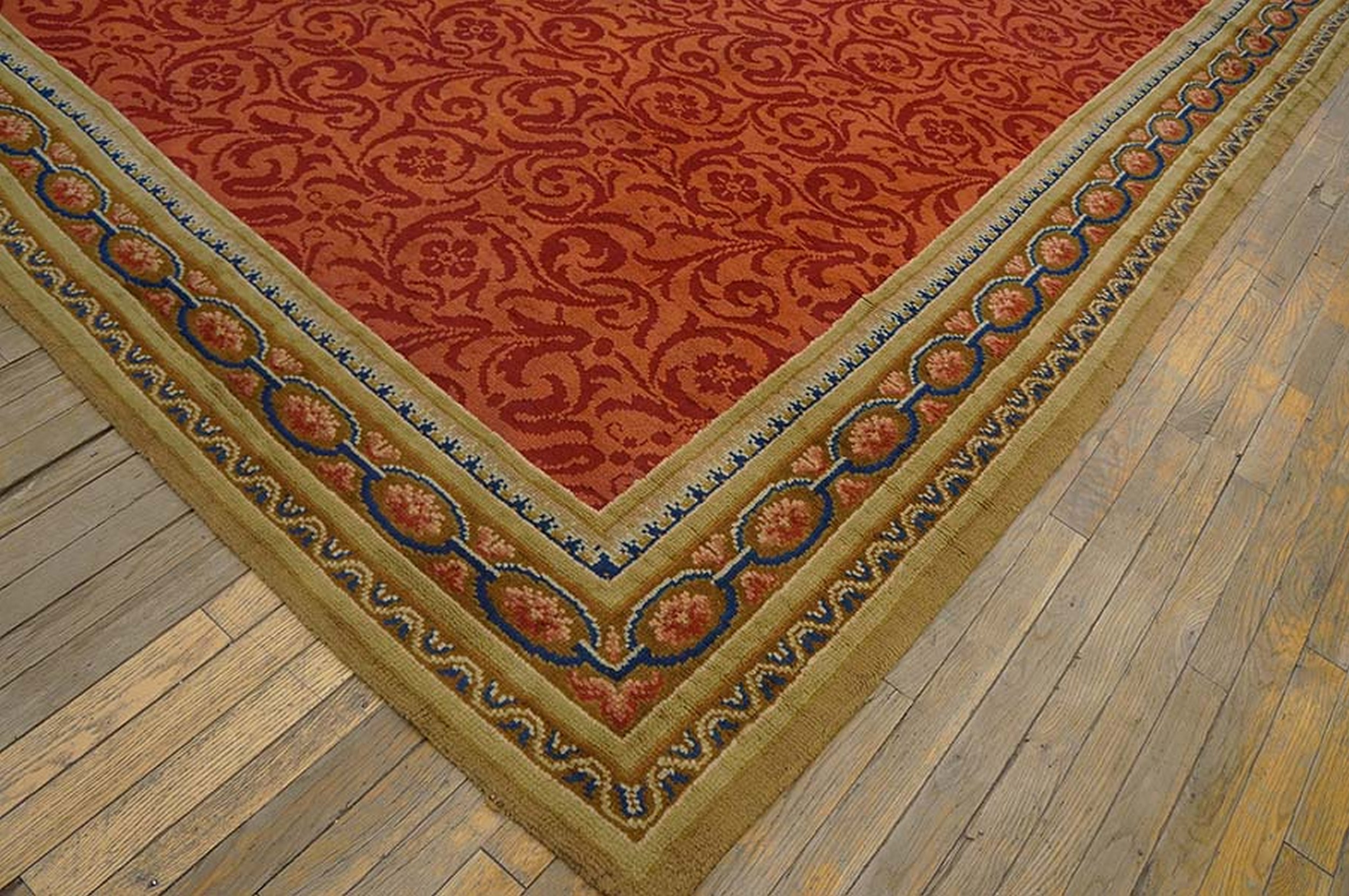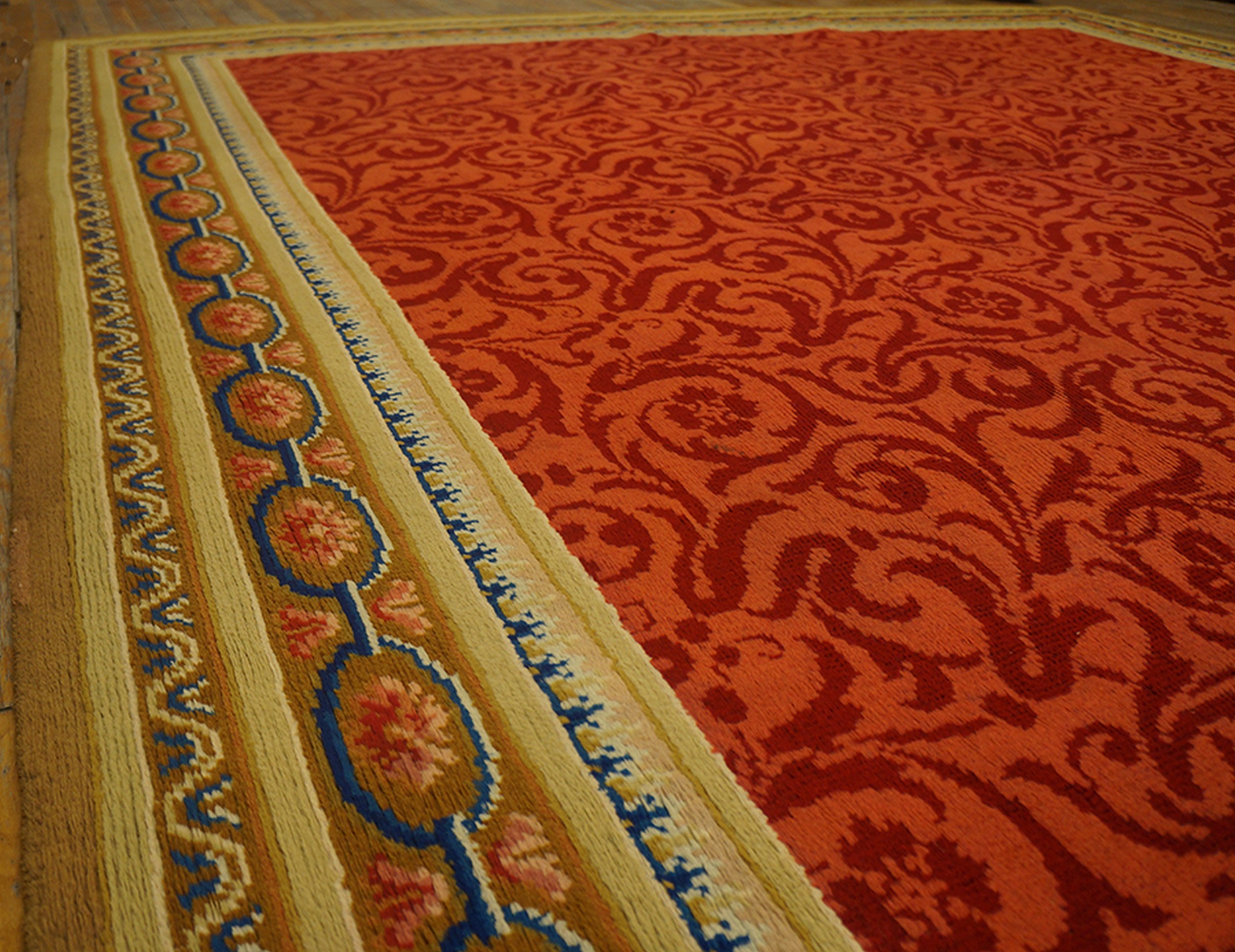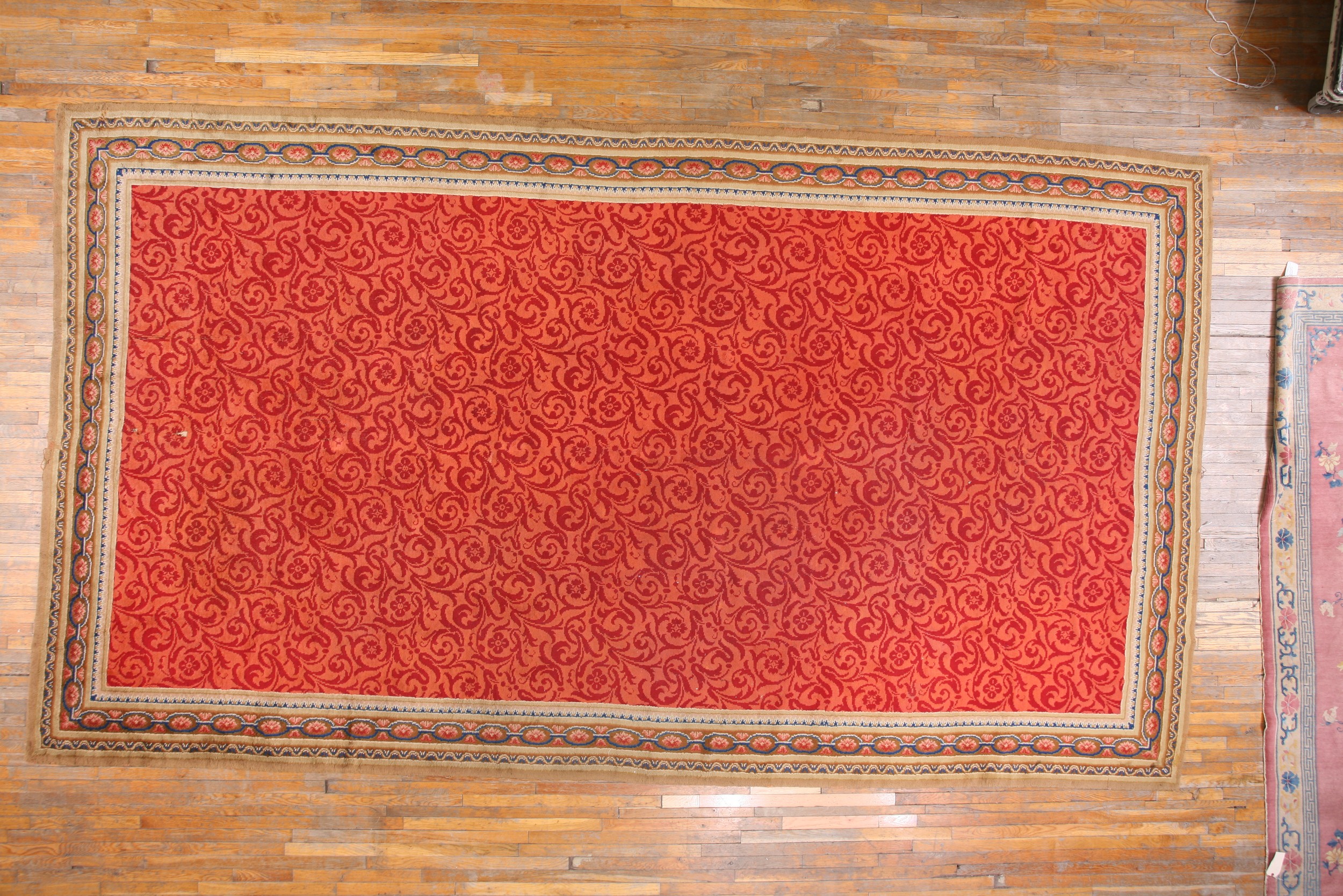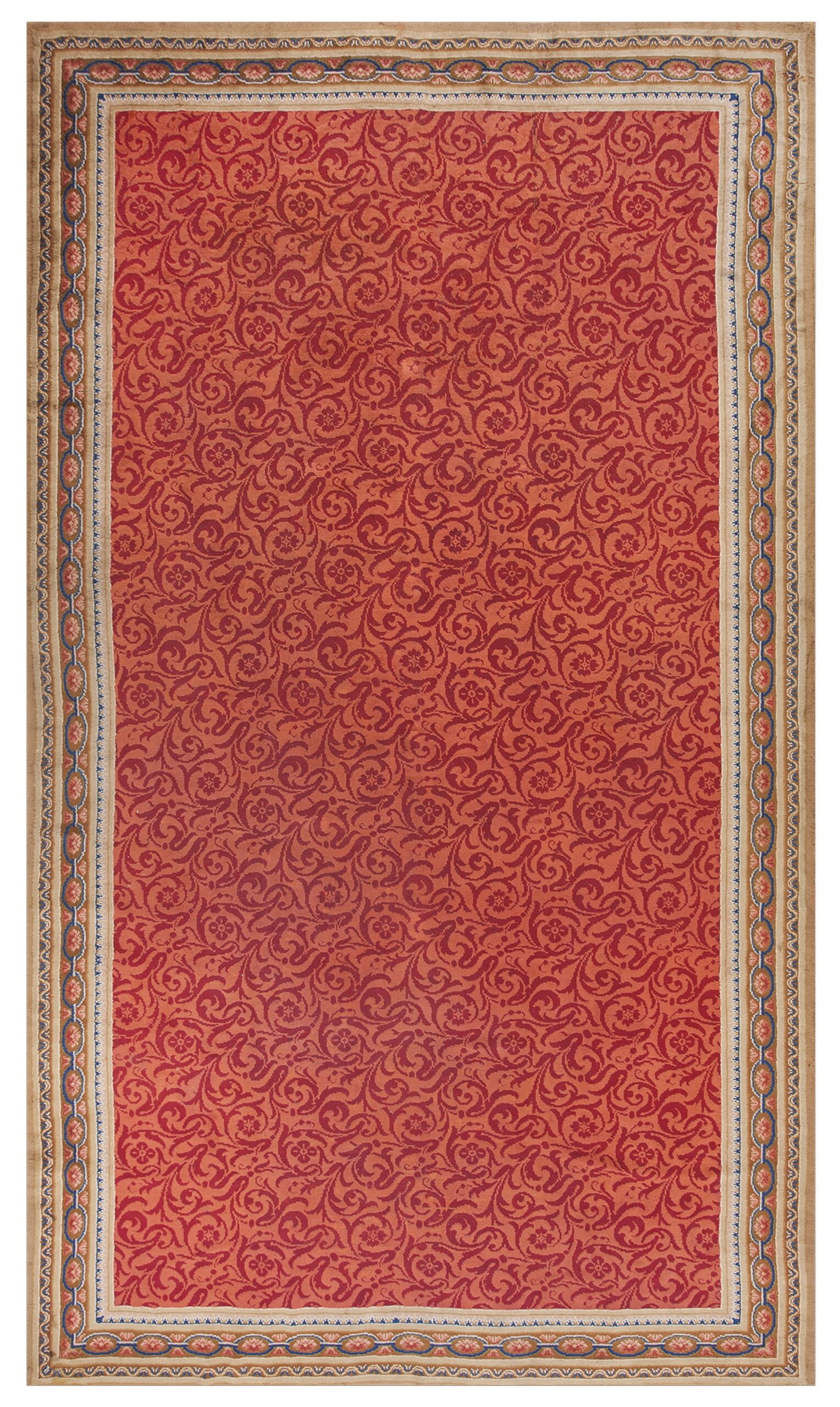 A meticulously detailed border system frames the dramatic field. It features alternating guard bands of geometric motifs and an elegant chain-link design rendered in soft blues, pinks, and creams, providing a necessary visual break against the warm main color. This Axminster masterpiece offers a rare combination of historical provenance, exceptional condition, and enduring decorative appeal.