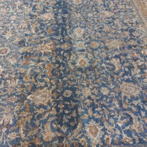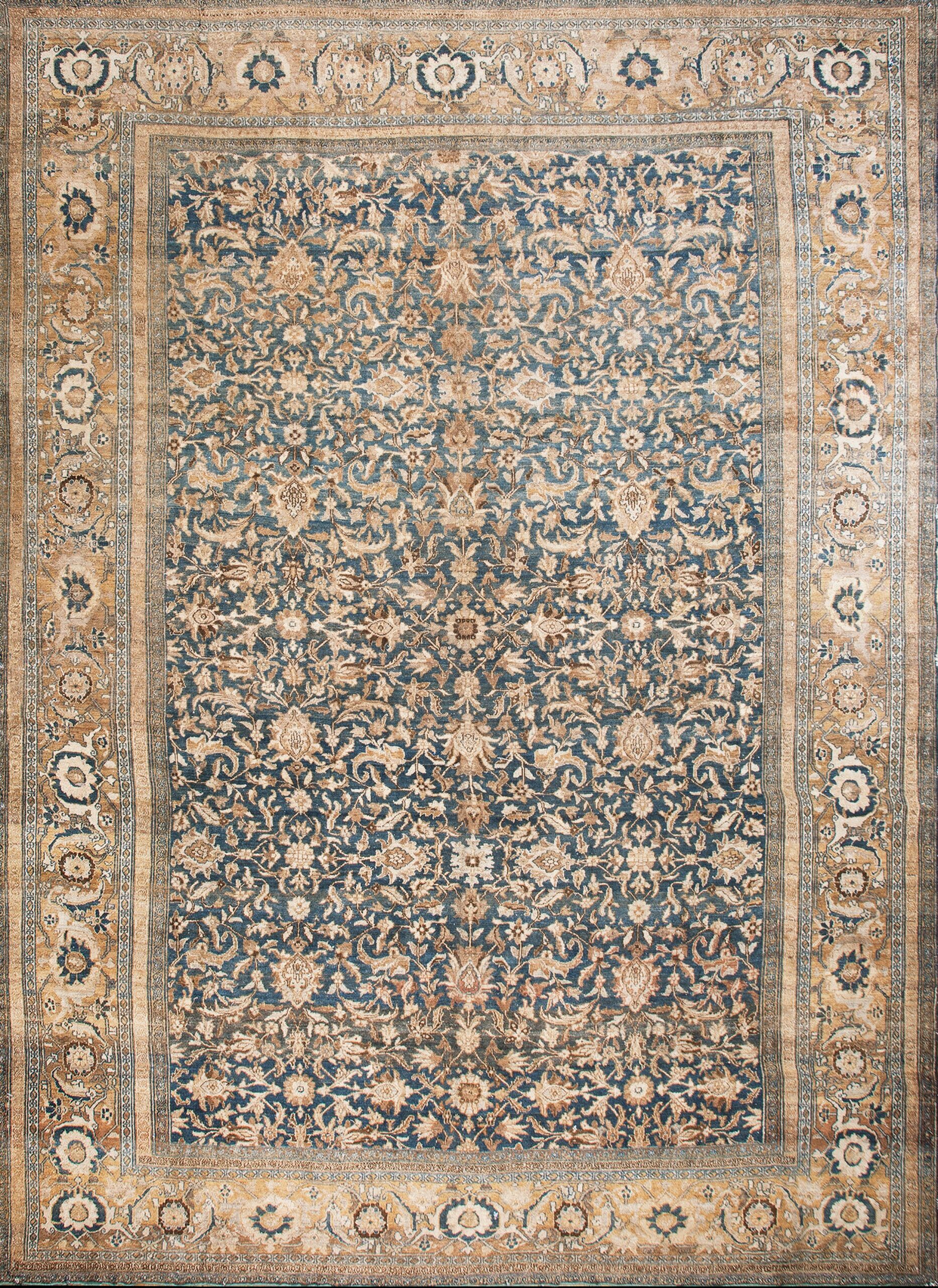 The deep indigo ground color, typical of the Persian weaving tradition during the early 20th century, provides a dramatic contrast to the warm, earth-toned secondary colors of camel, rust, and ivory. The scale of this piece classifies it as a large format floor covering, requiring careful placement to fully appreciate its century of history and artistry.