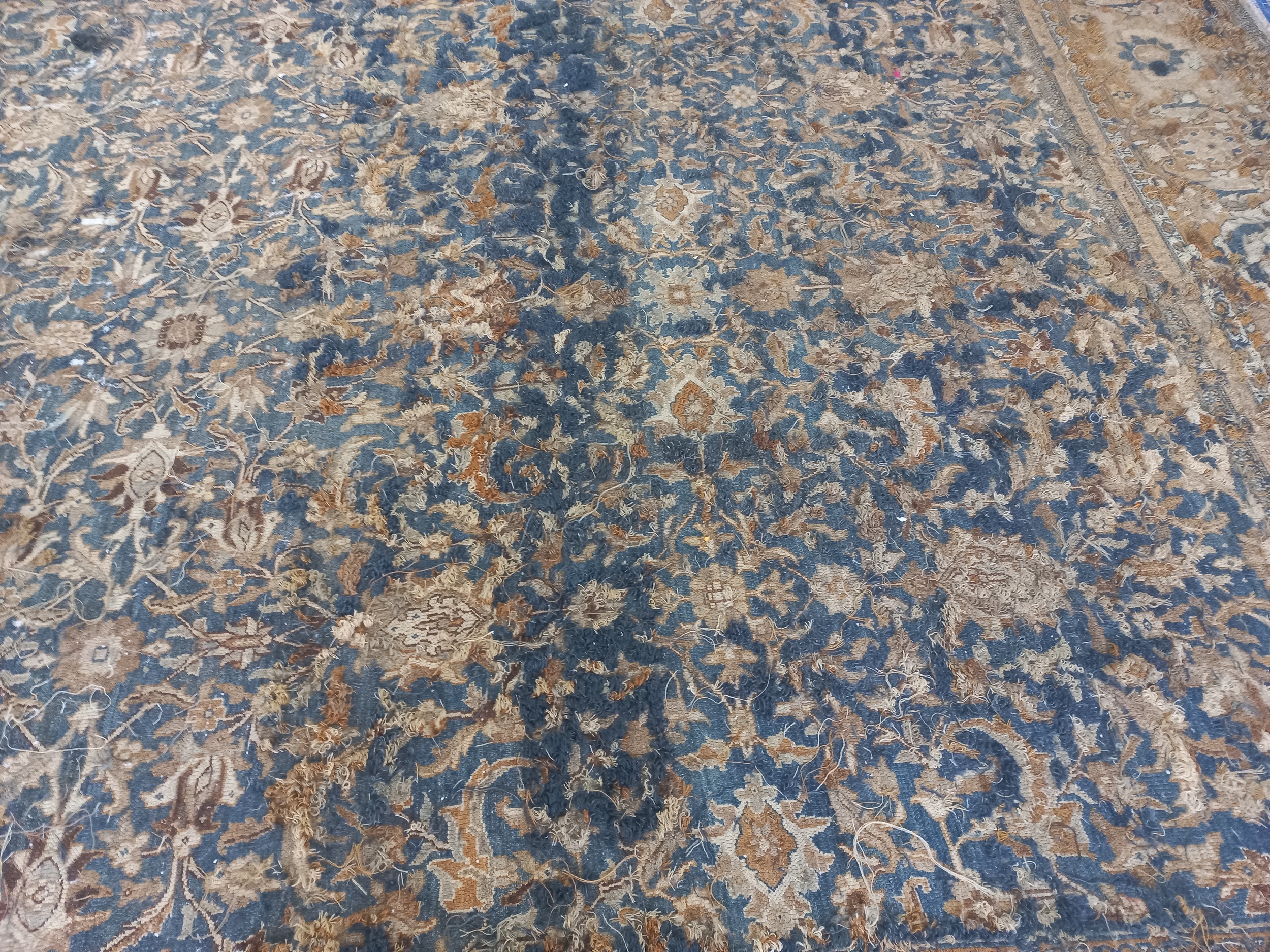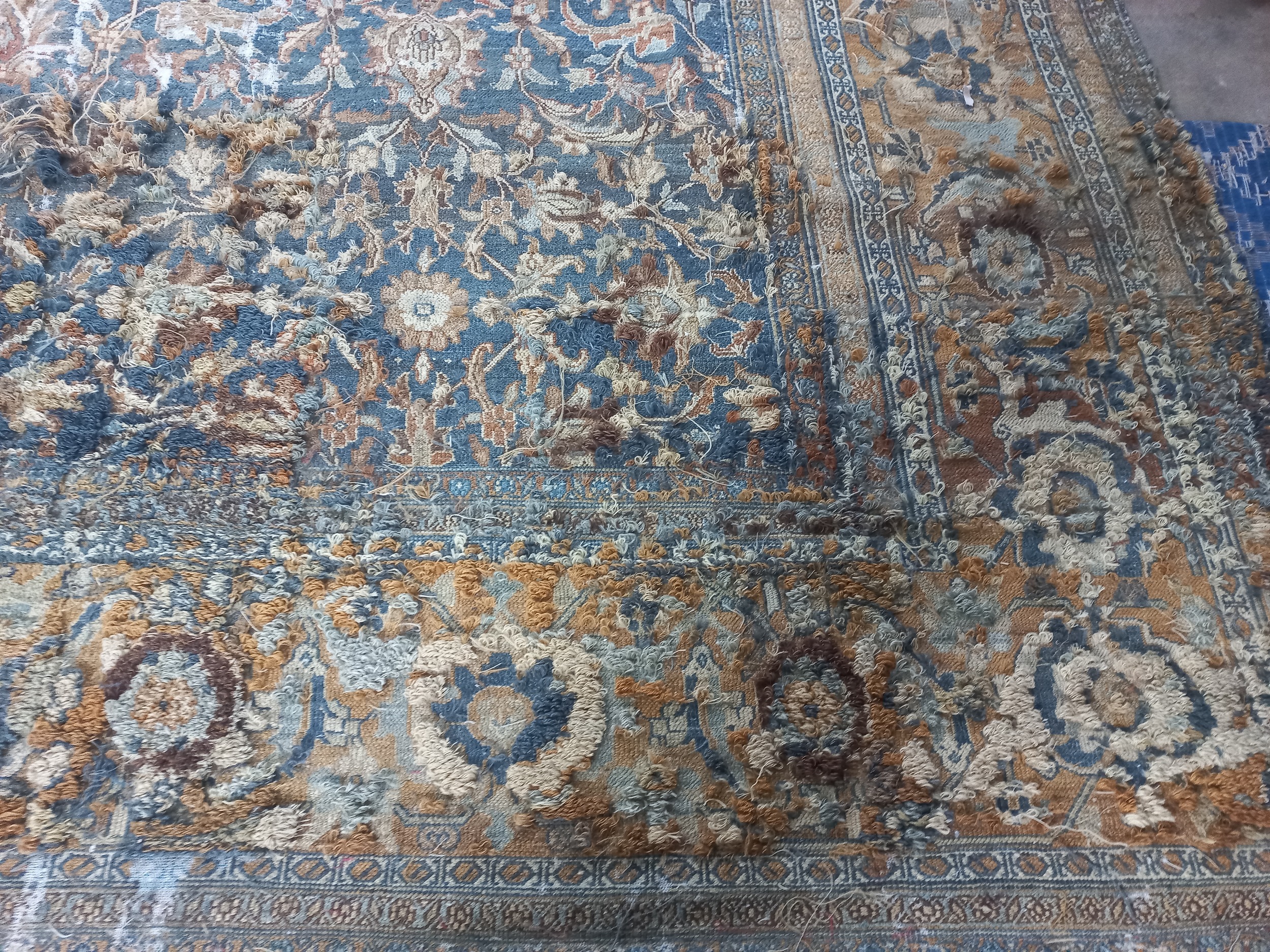 The composition features a dense, highly detailed allover design of flowering vines and palmettes, avoiding the use of a central medallion to ensure visual continuity across the vast field. While the image reveals significant wear and loss of pile, this condition speaks directly to its authenticity and long life as a functional piece of art.