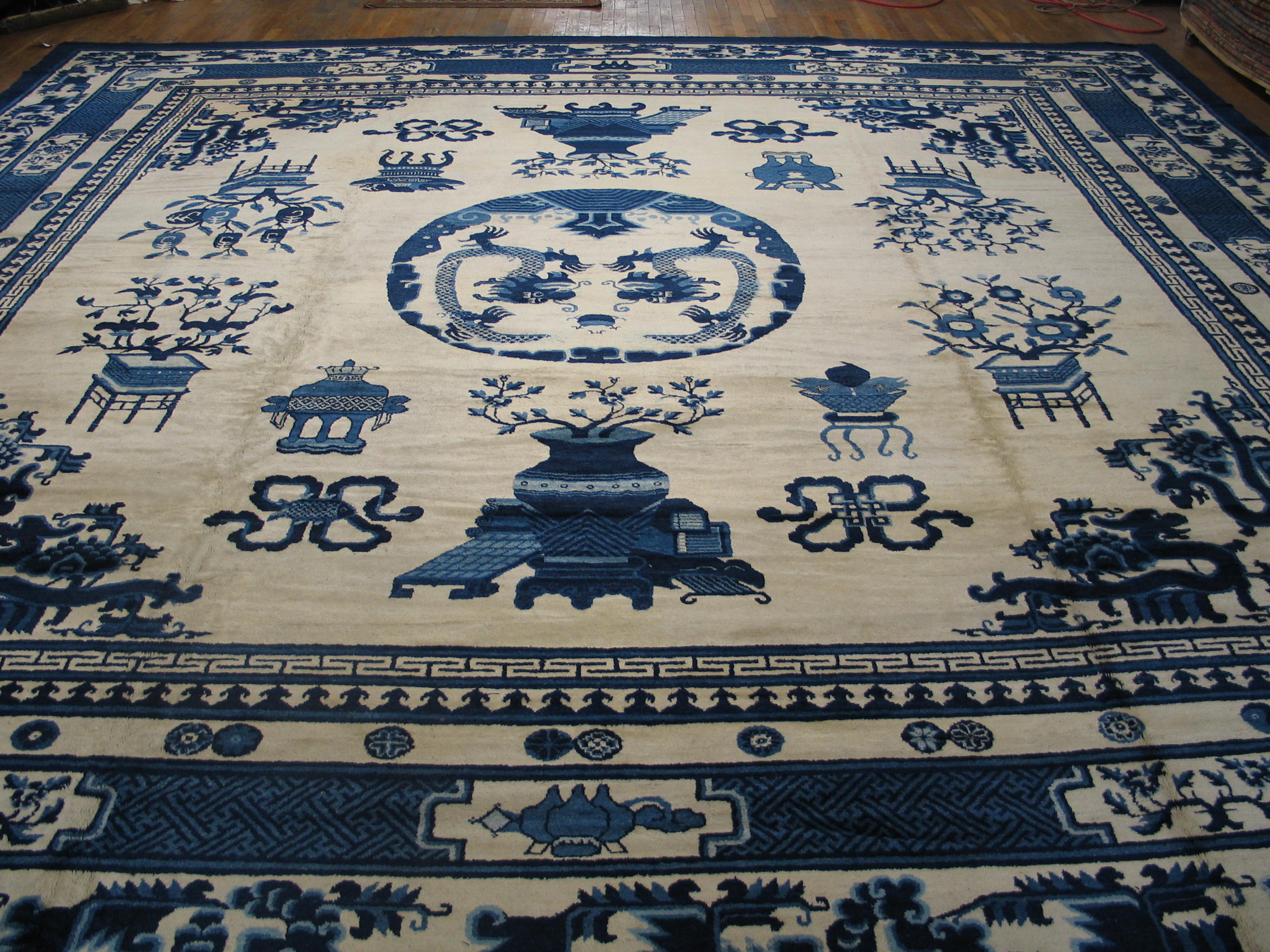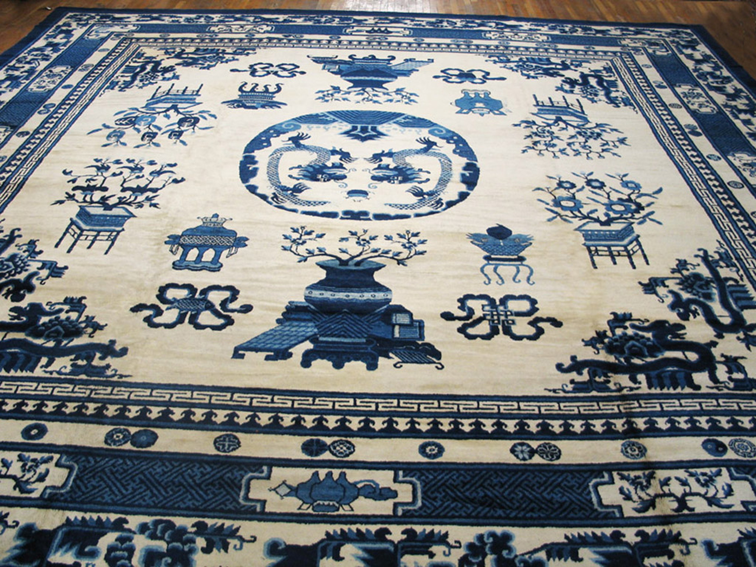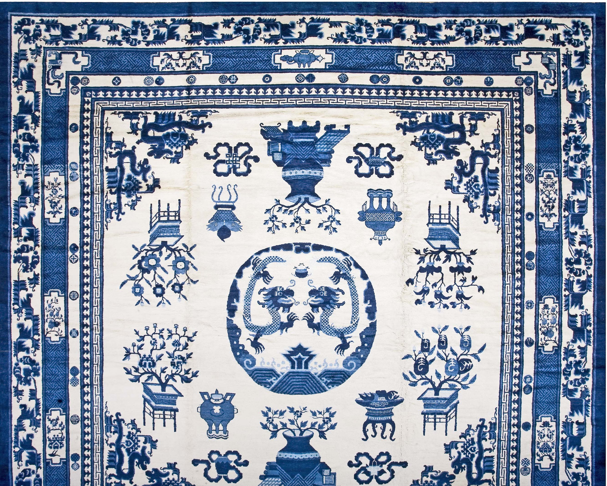 The design is characterized by a central roundel featuring two confronting dragons, symbols of imperial power and good fortune. Surrounding this focal point, various auspicious objects—including stylized vases, censers, and potted fruit trees—are scattered across the field, typical of high-quality antique rugs from this period.