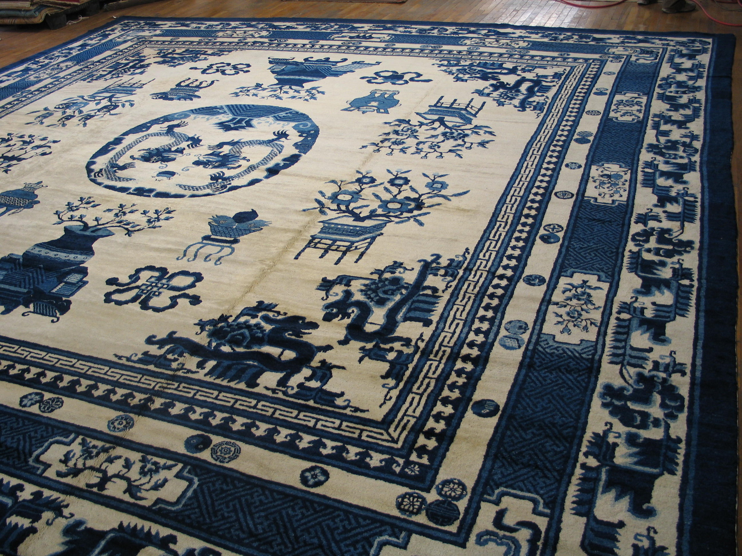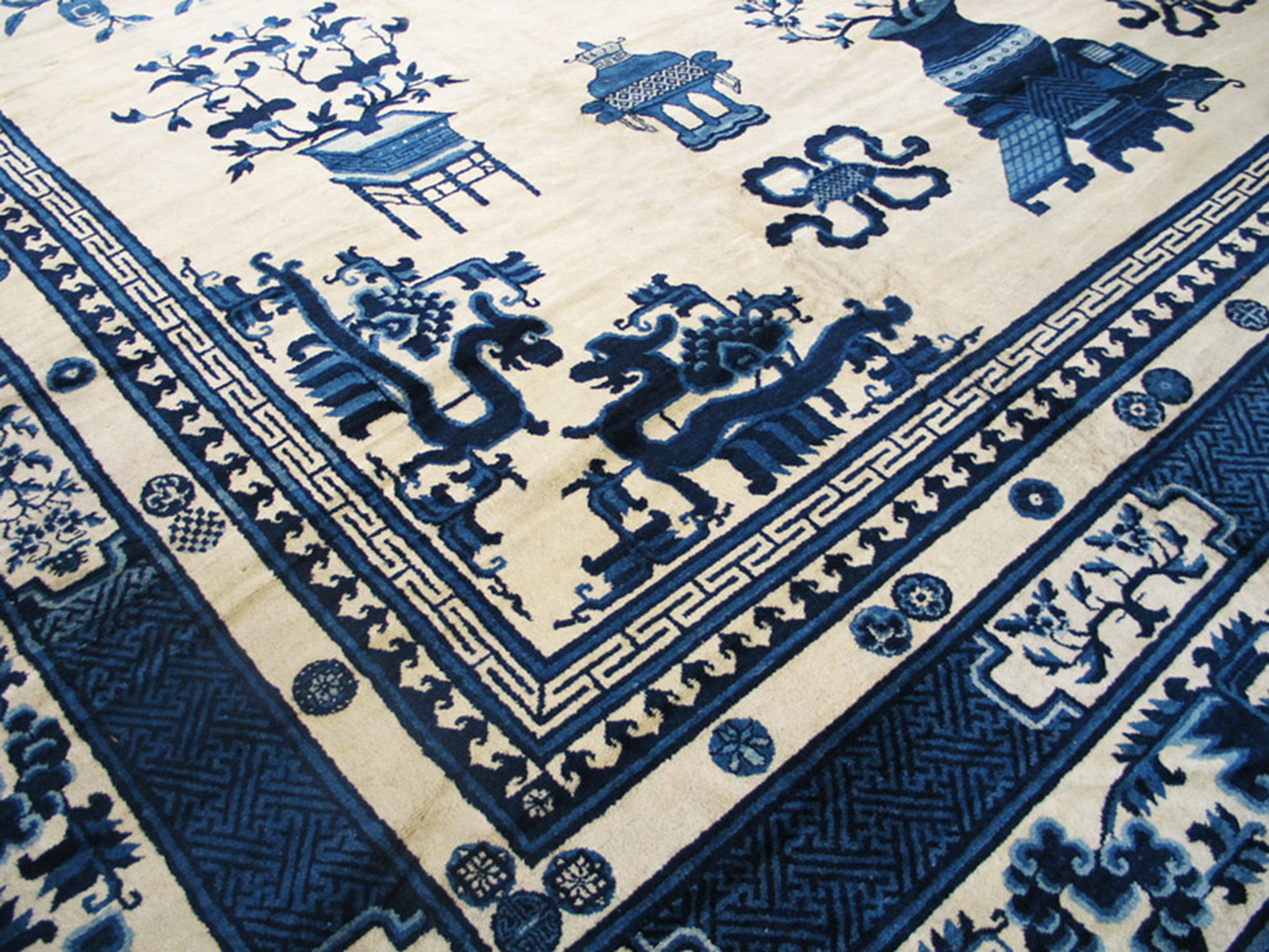 Antique Large Chinese – Mongolian Chinese Knotted Rug, Circa Date: 1890s. This exceptional late 19th-century weaving presents a dramatic contrast, utilizing deep indigo blue against a field of luminous ivory and cream. This classic palette evokes the elegance of traditional Chinese export porcelain, translating that refined aesthetic into a monumental floor covering.