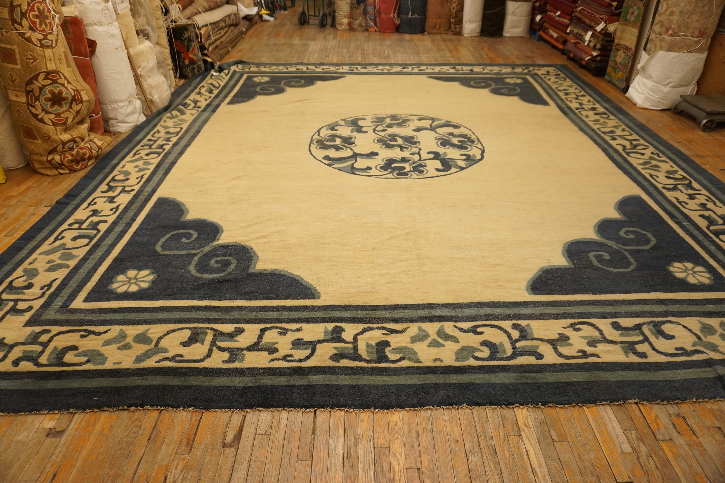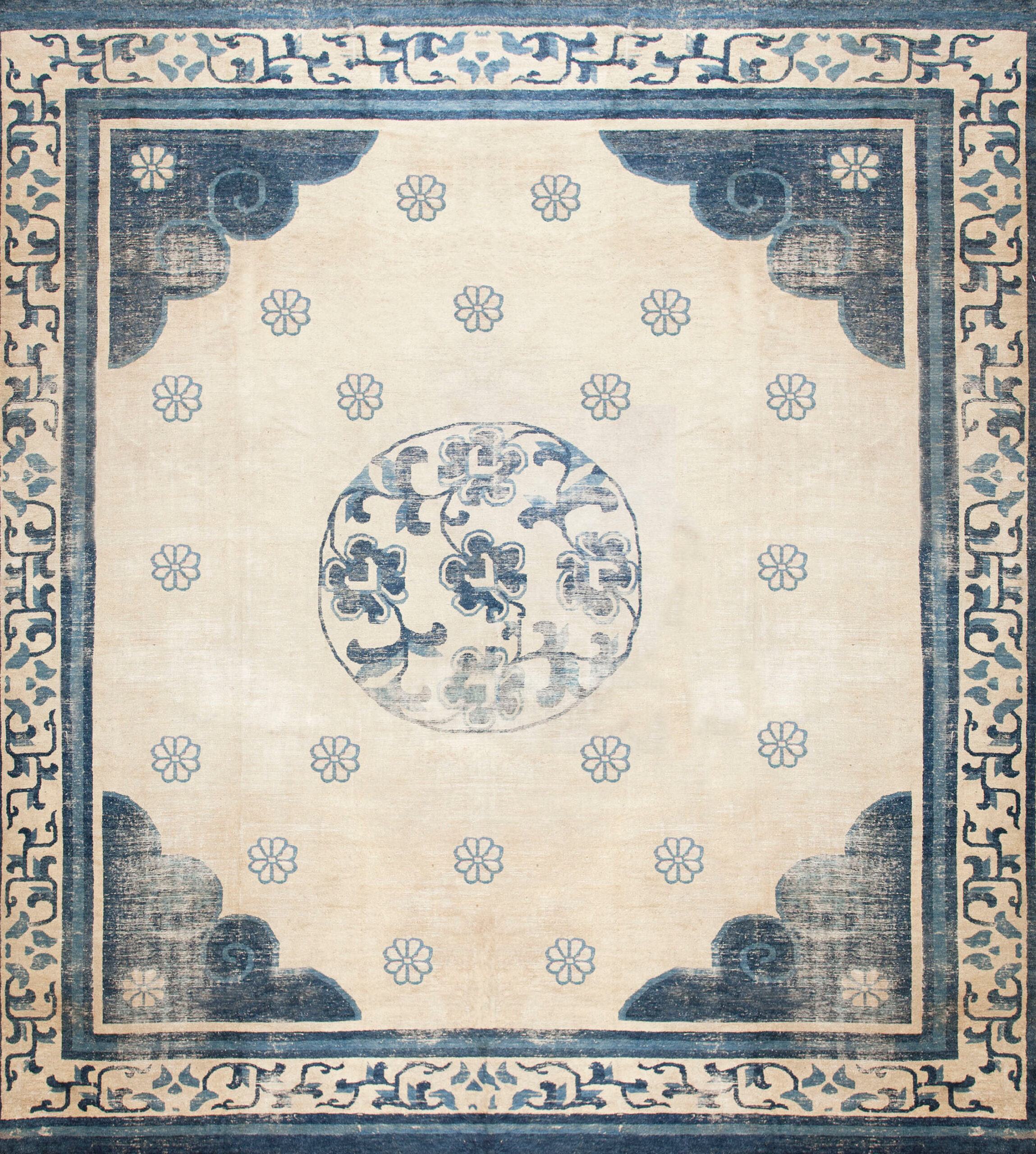 The central circular medallion and the corner spandrels feature stylized cloud forms, while the main border is populated by delicate, scrolling vines and stylized floral motifs. This masterful use of traditional Chinese iconography, executed with bold, graphic lines, confirms the rug’s status as a superb example of late 19th-century weaving.