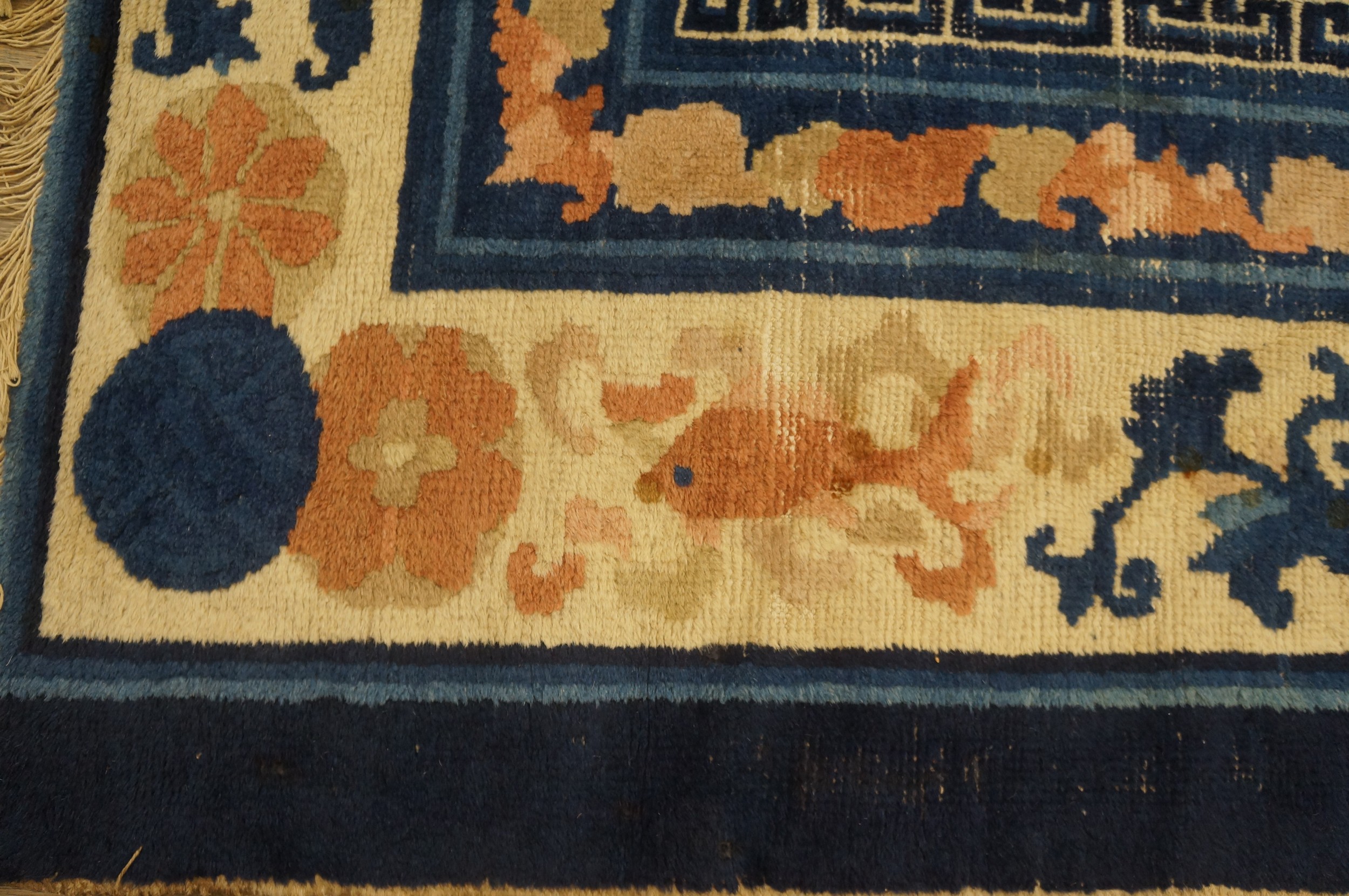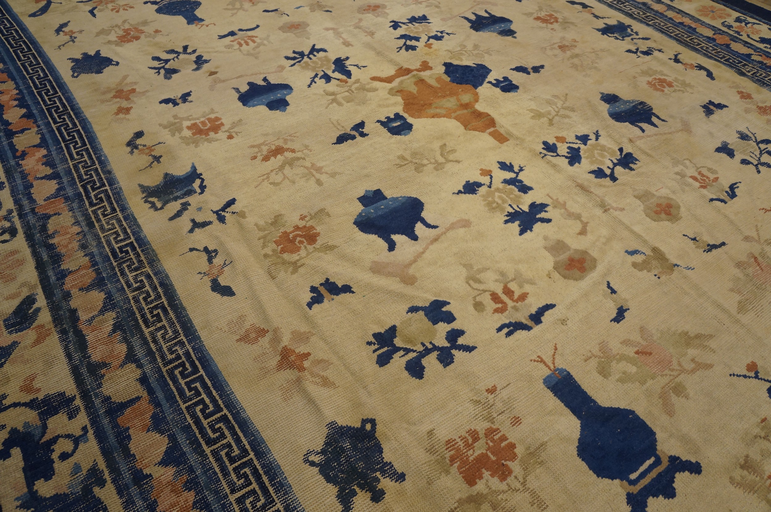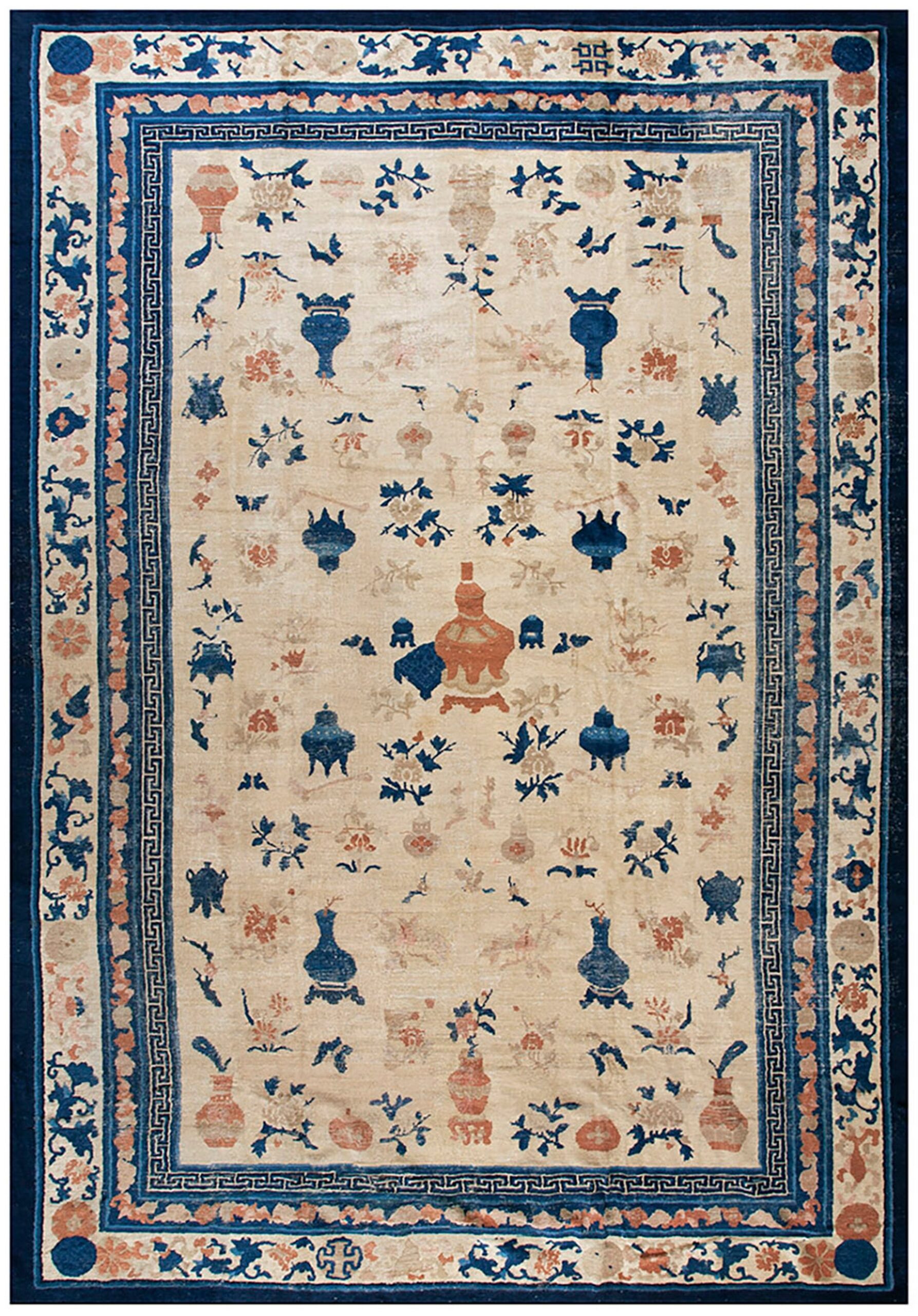 The allover pattern features an array of auspicious symbols, including delicate floral sprays and various ancient bronze vessels and vases, lending the piece a classical, scholarly air. The impressive scale of this piece makes it an ideal room size complement for a formal dining area or grand salon.