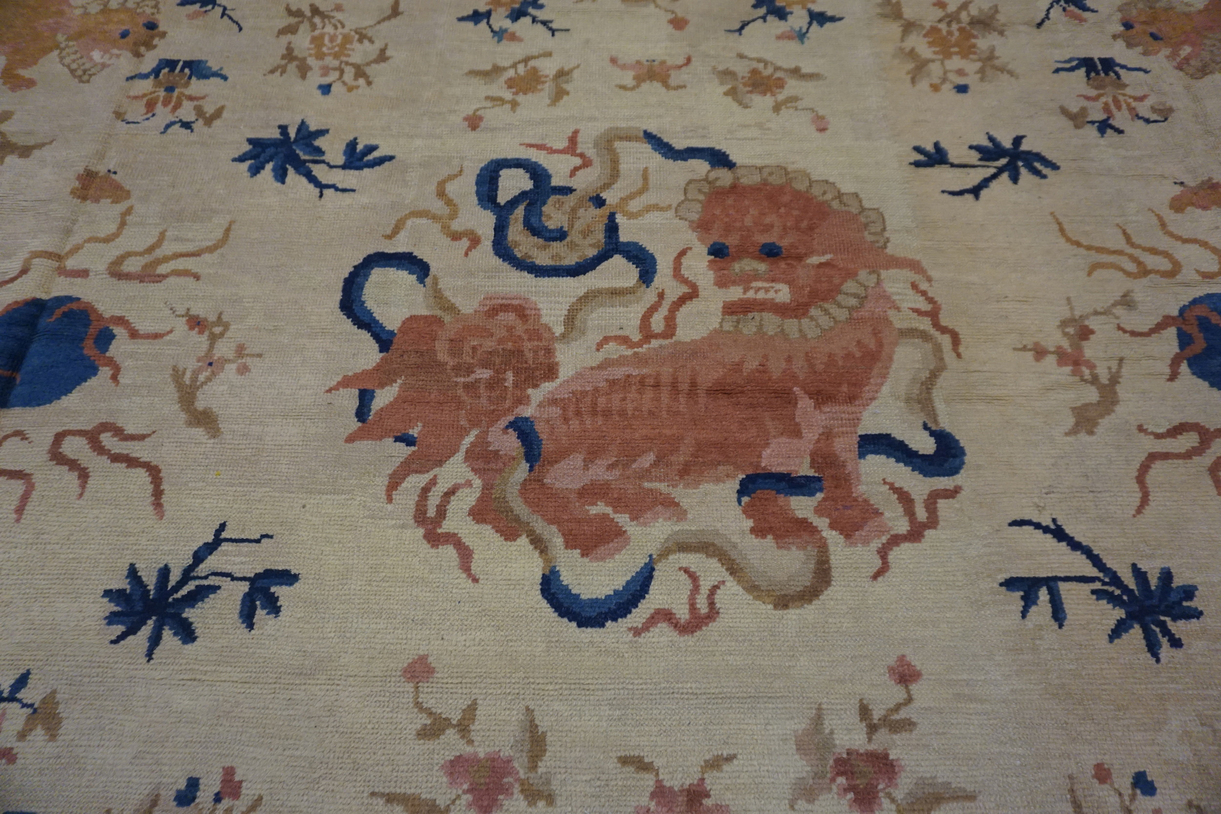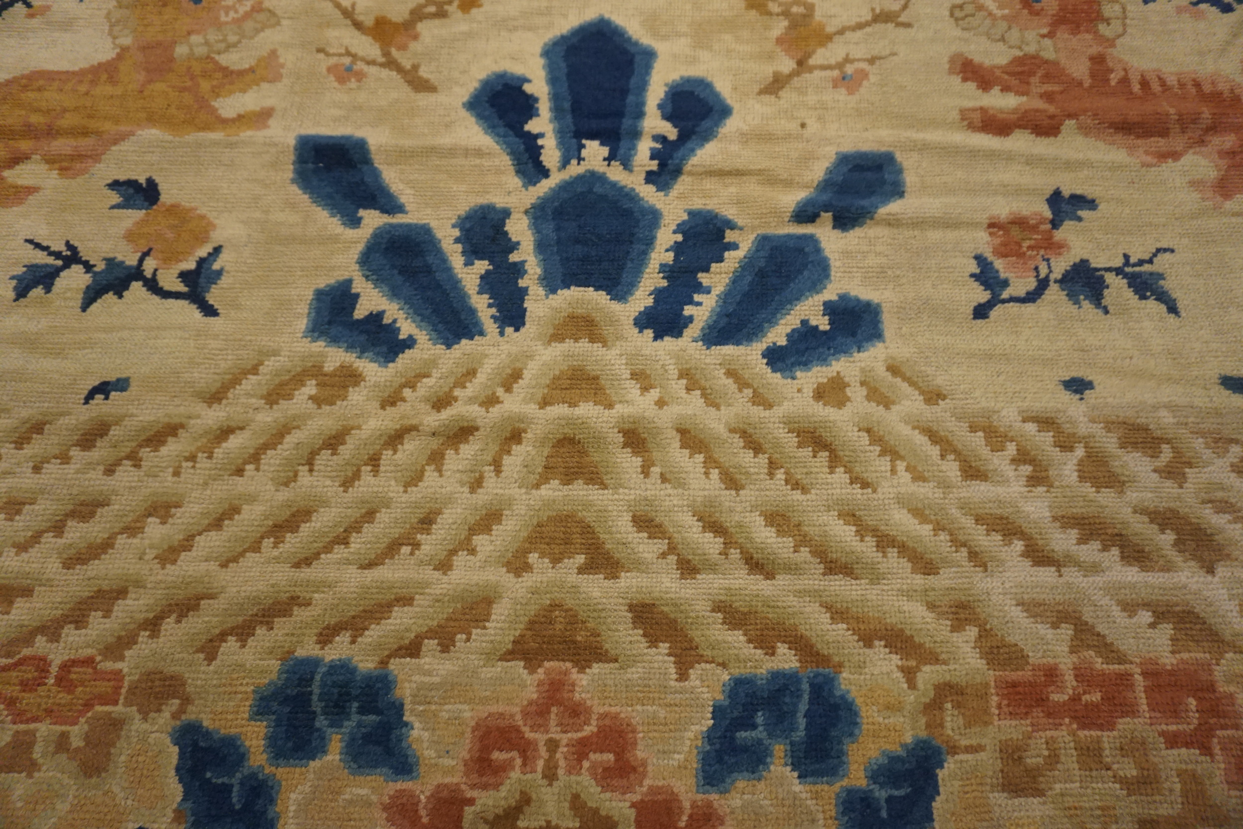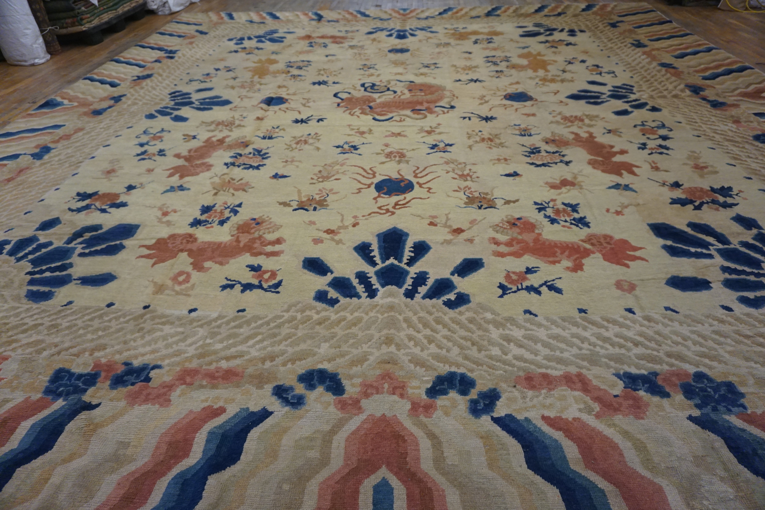 Given its impressive scale, this textile is a rare example of a Qing Dynasty large format rug, suitable for grand interiors or contemporary spaces requiring a foundational statement piece. The thick, lustrous wool pile and robust knotting ensure that this museum-quality artifact remains a durable and historically significant addition to any curated collection.