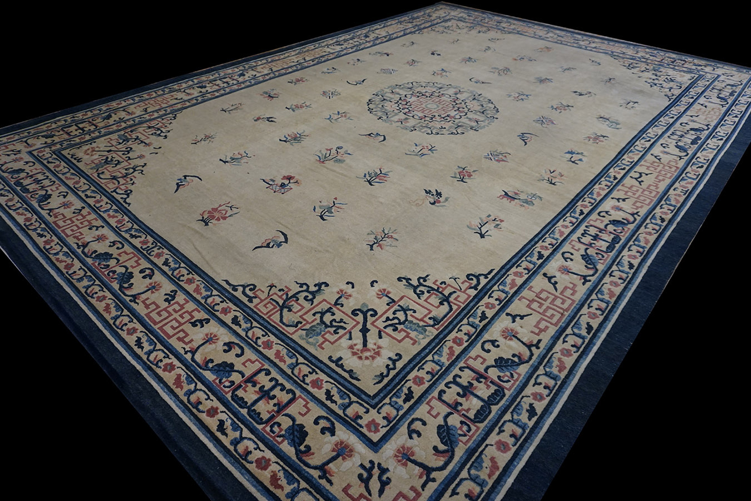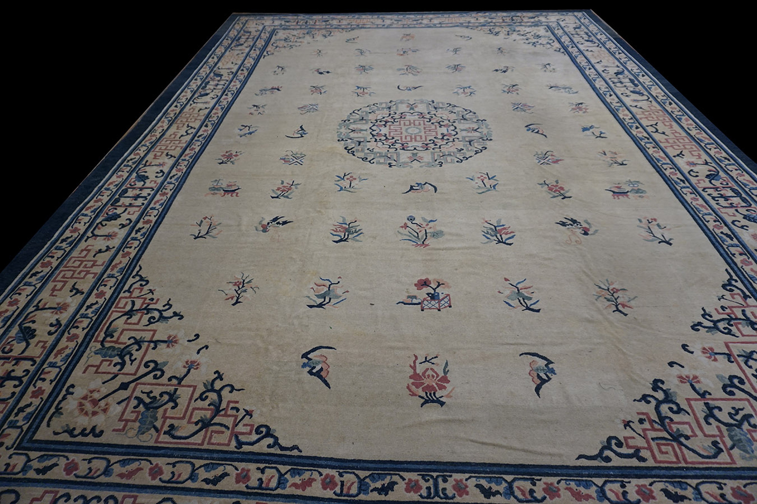 Unlike the tightly packed designs often seen in Western carpets, this Peking rug employs a sparse, elegant arrangement of stylized symbols and botanicals. The central medallion, rendered in soft blues, reds, and celadon, anchors the composition, surrounded by individual sprays of blossoms, making it a classic example of floral rugs with symbolic resonance.