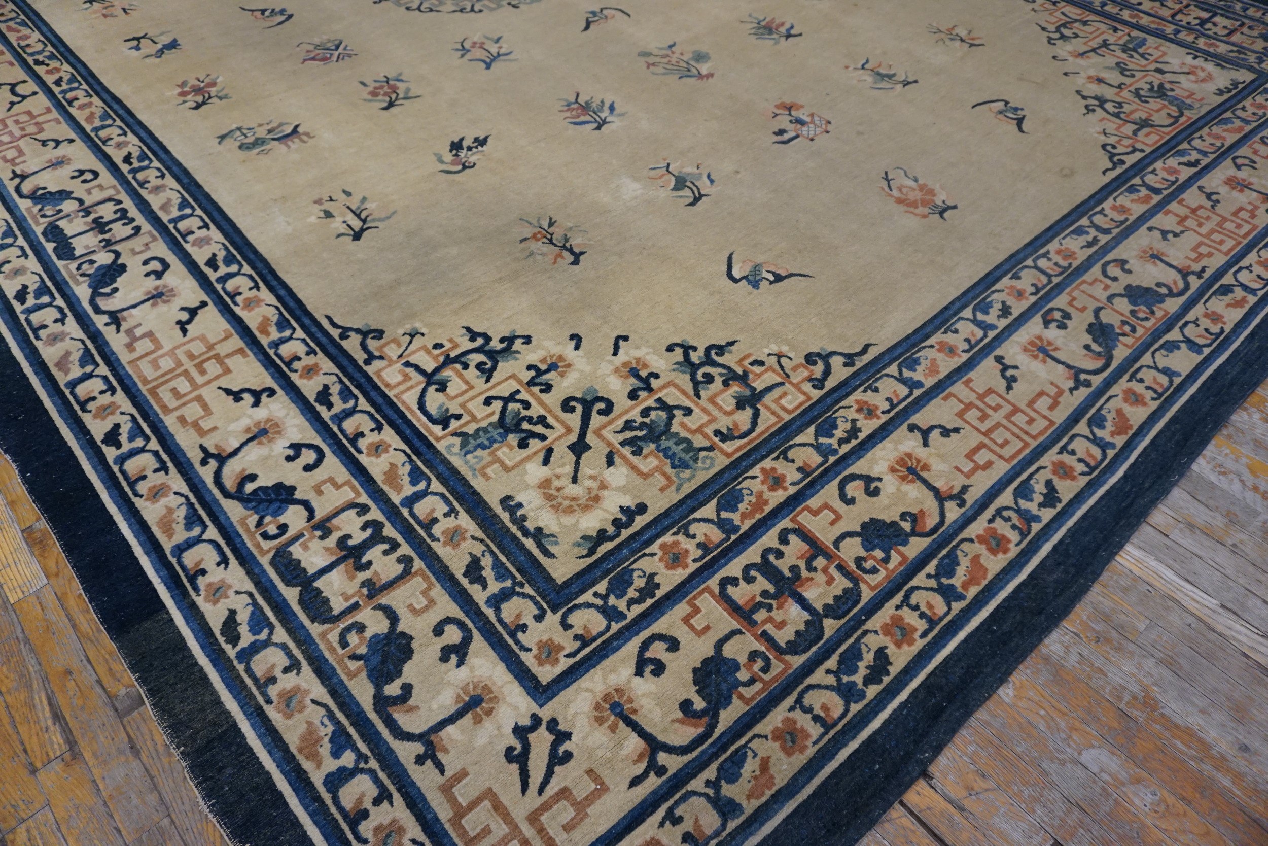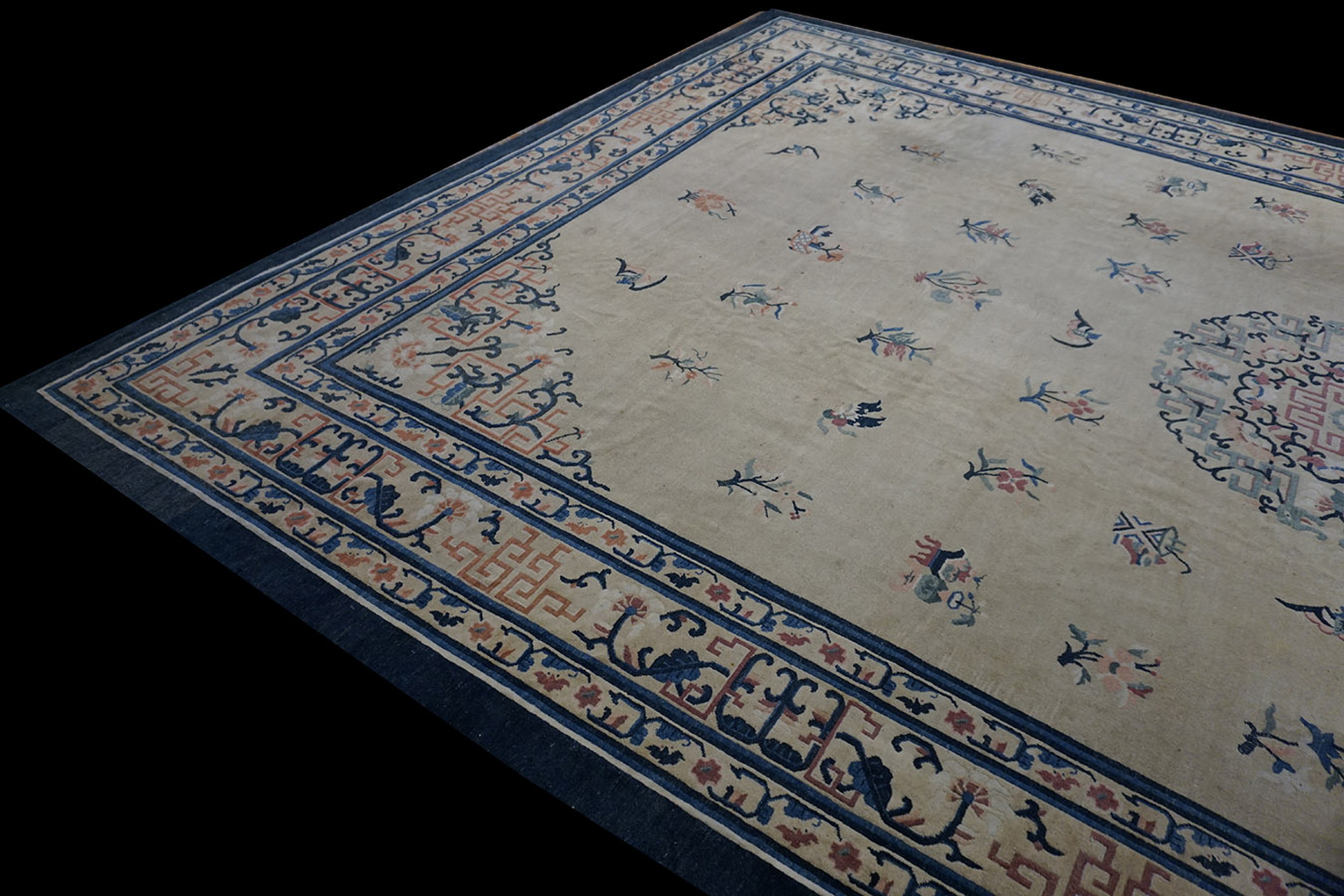 The expansive central field utilizes a subtle, luminous ground, placing this piece among the most desirable ivory color rugs of the period. This neutral backdrop allows the scattered, delicate motifs to float gracefully across the surface. The contrast is provided by the deep indigo border, which frames the composition with traditional Chinese key and scroll patterns, lending structure to the overall design.