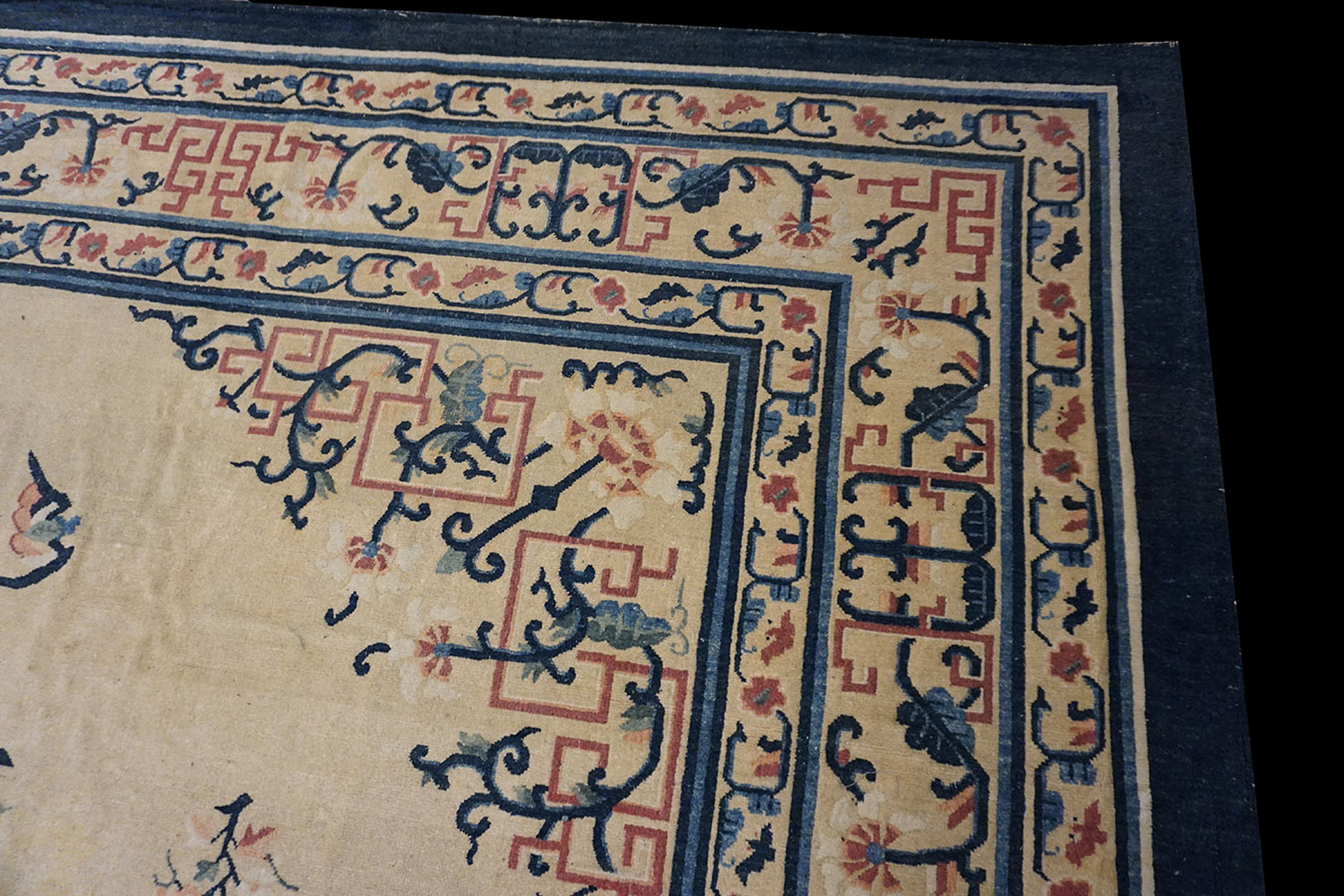 Antique Large Chinese – Peking Knotted Rug artisanal, Circa Date: 1920s. This exceptional piece represents the height of early 20th-century Chinese weaving, characterized by its refined palette and open field design typical of the Peking tradition. As a genuine example of antique rugs, its provenance and craftsmanship are immediately evident in the quality of the wool and the depth of the knotting.