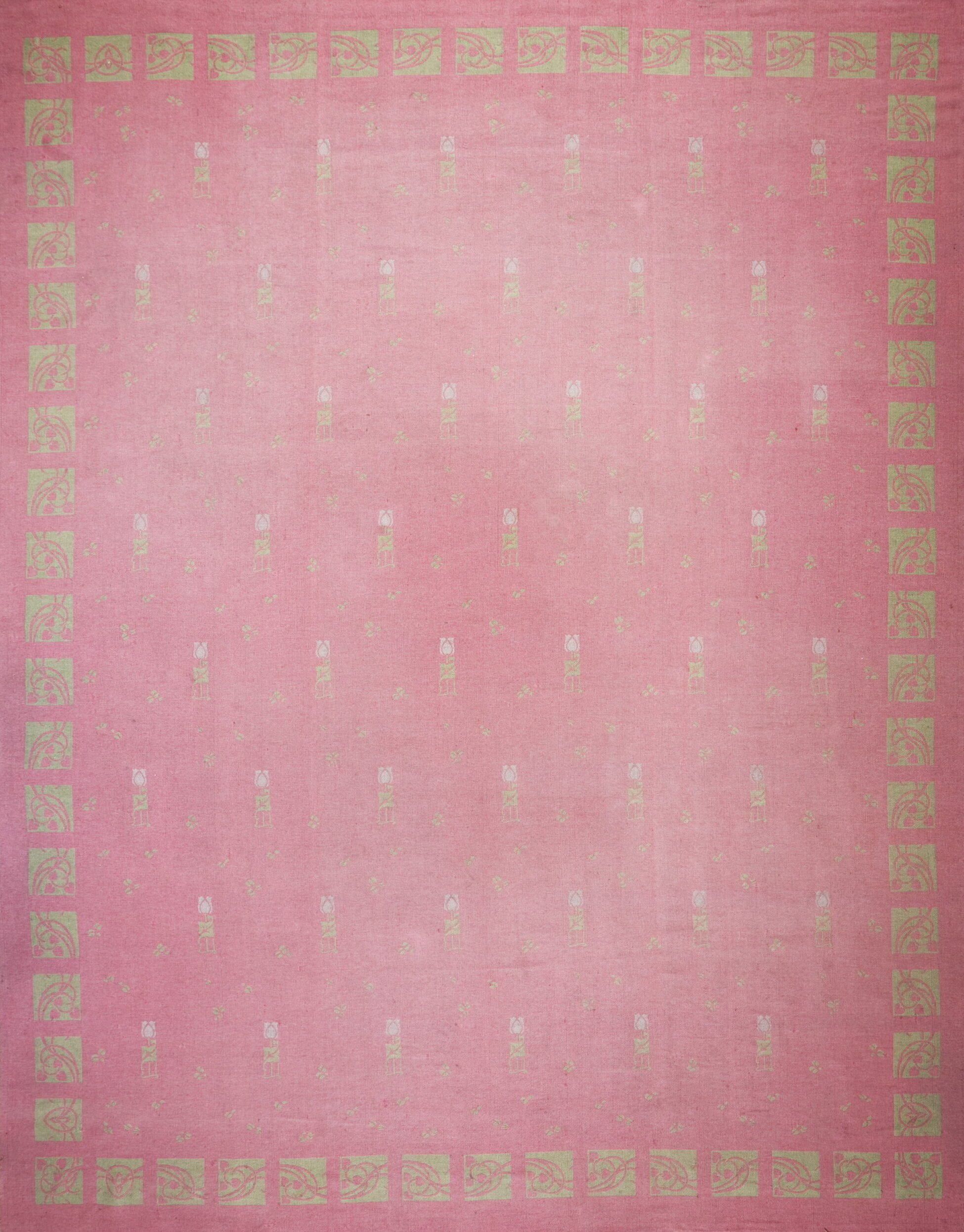 The palette is remarkably sophisticated, utilizing a soft, expansive field of salmon coral pink that dominates the composition. This rich ground is offset by stylized, rectilinear floral elements rendered in muted celadon and cream, creating a visual harmony that is both delicate and commanding, perfectly capturing the subtle naturalism favored by designers of the period.