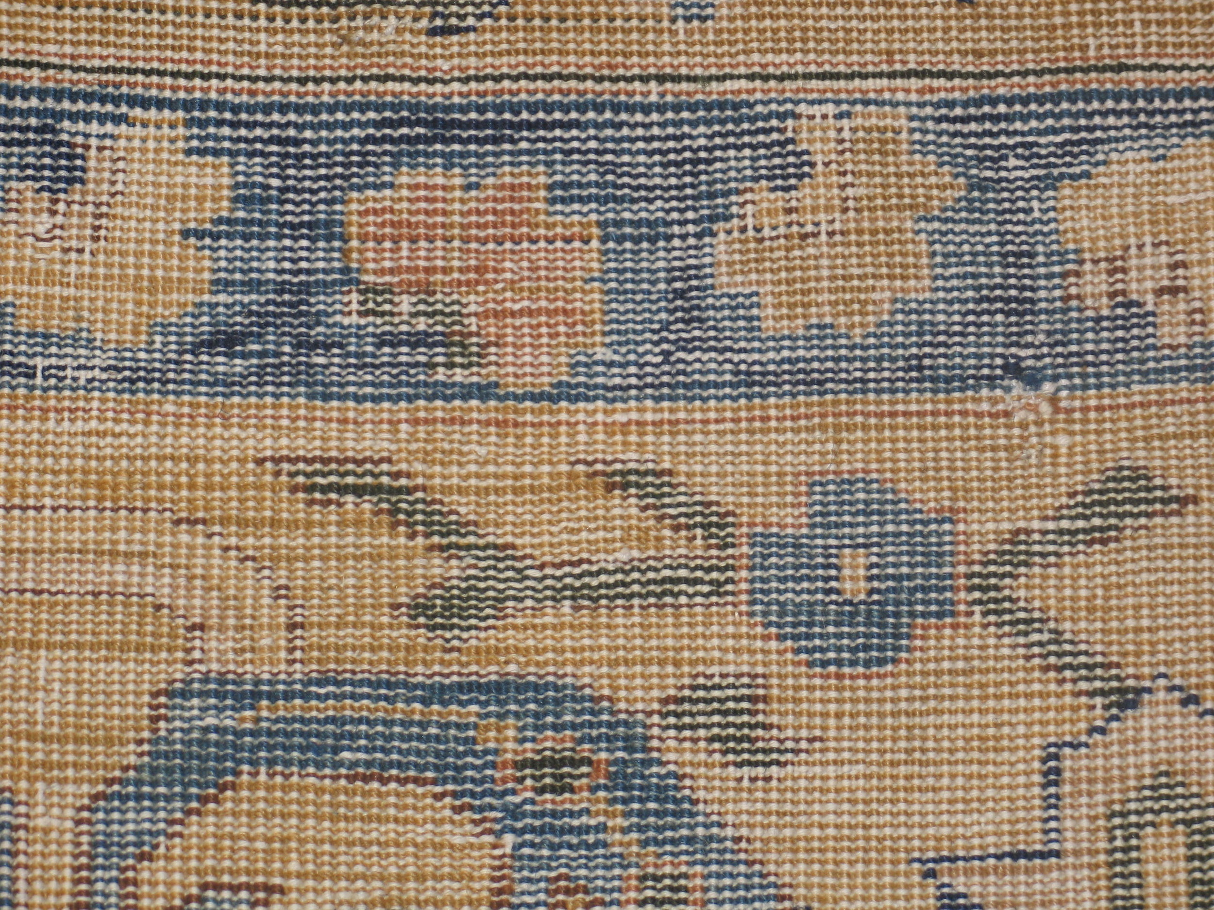 The palette is dominated by a rich, saturated indigo field, providing a dramatic backdrop for the intricate design elements. The primary contrast is achieved through the use of vibrant saffron and ochre tones, highlighting the stylized fauna and geometric framework. This striking combination of colors places it among the most desirable blue color rugs of the period, offering both warmth and formality.