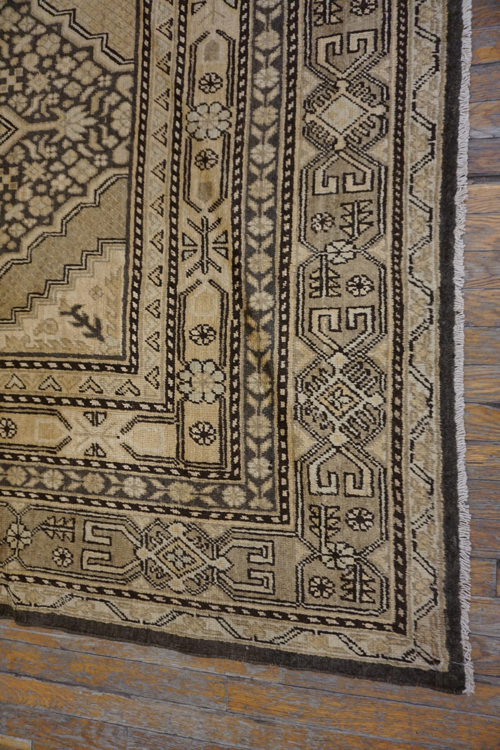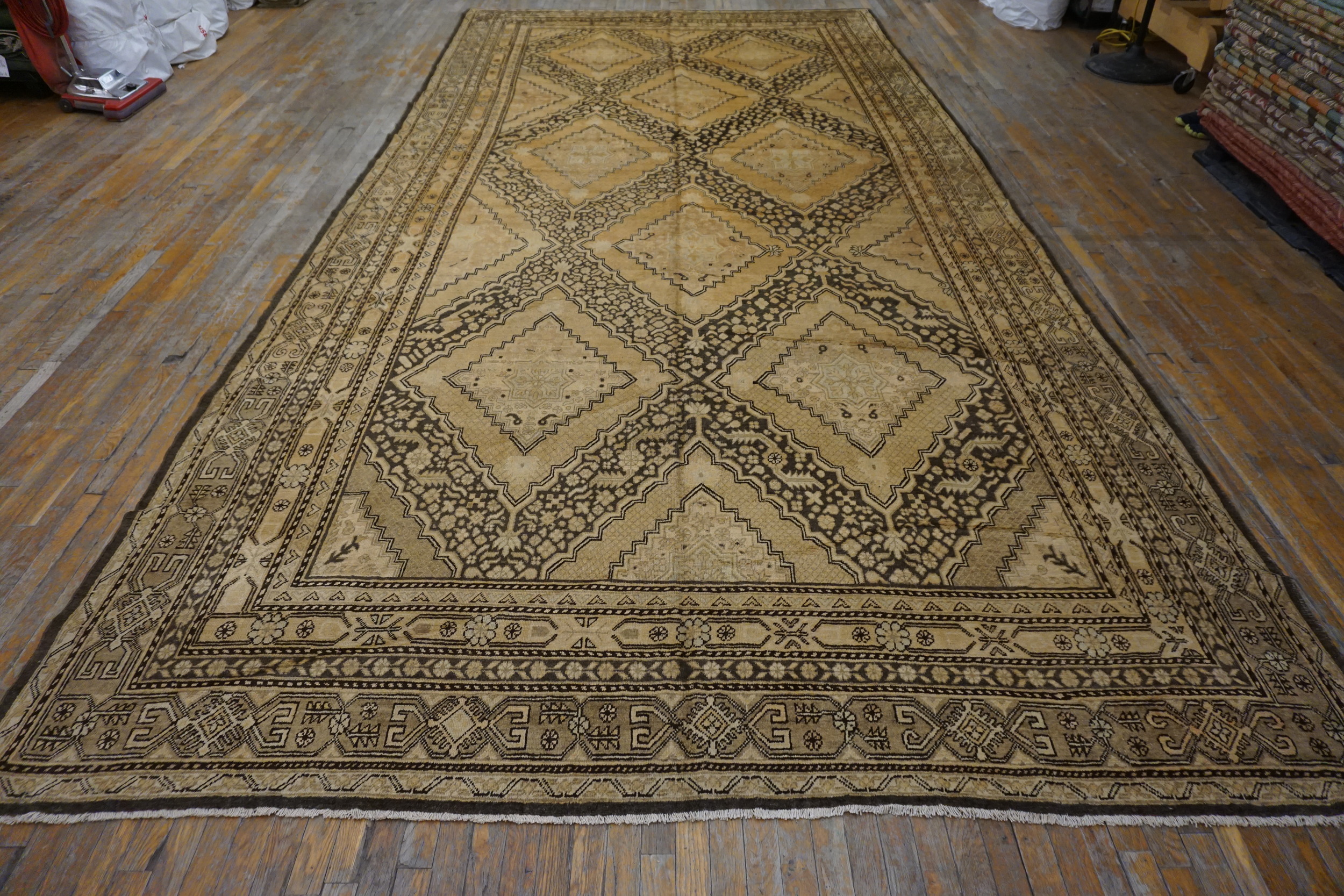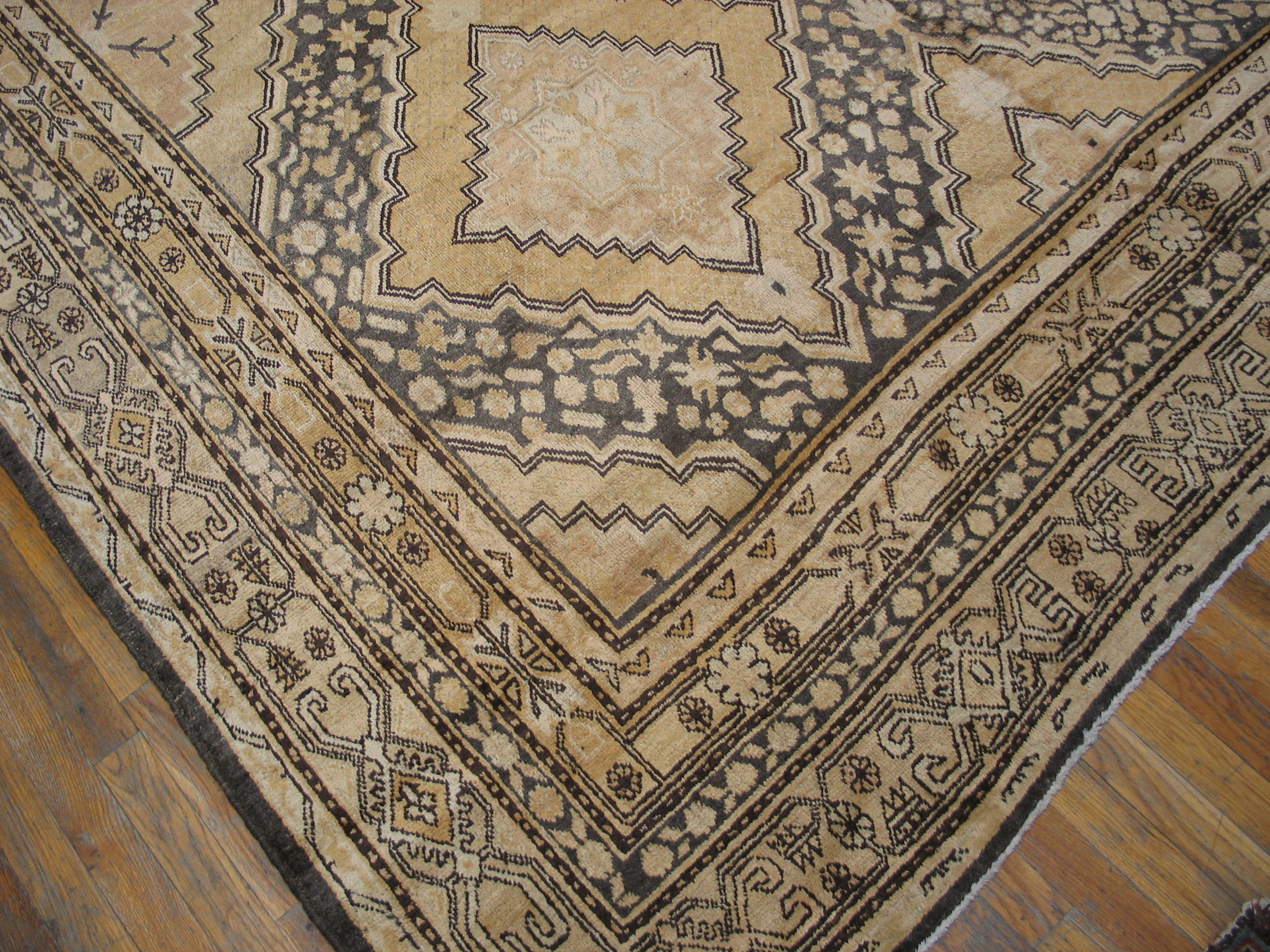Antique Khotan Large Room Size Wool Ivory Rug, Circa Date: 1930s. This exceptional Khotan piece exhibits the unique geometric artistry characteristic of East Turkestan weaving traditions. The patina and subtle wear confirm its status as a genuine antique rug, offering a rich history underfoot.