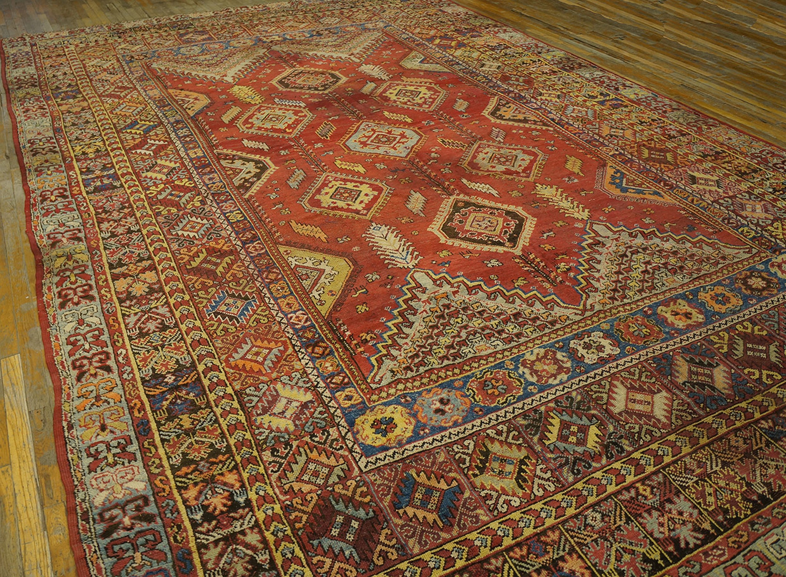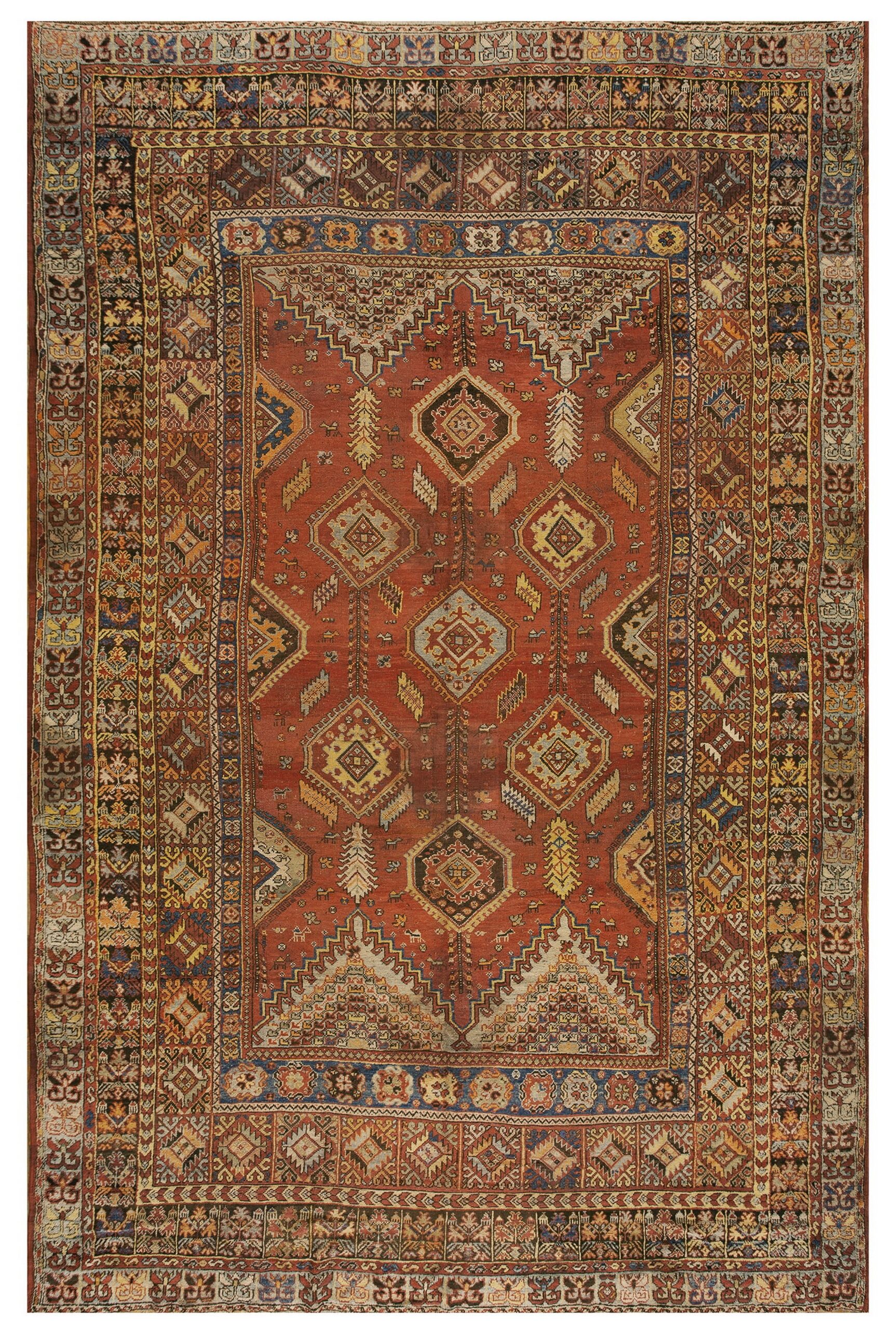 A series of meticulously rendered borders frame the central medallion arrangement, each band employing a different geometric vocabulary—from zigzagging chevrons to repeating stylized flower heads. The technical execution demonstrates the high standard of knotting prevalent among antique rugs from this period, offering durability alongside intricate visual appeal.