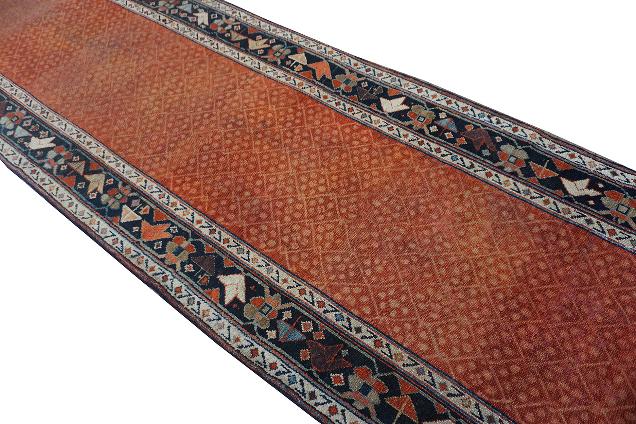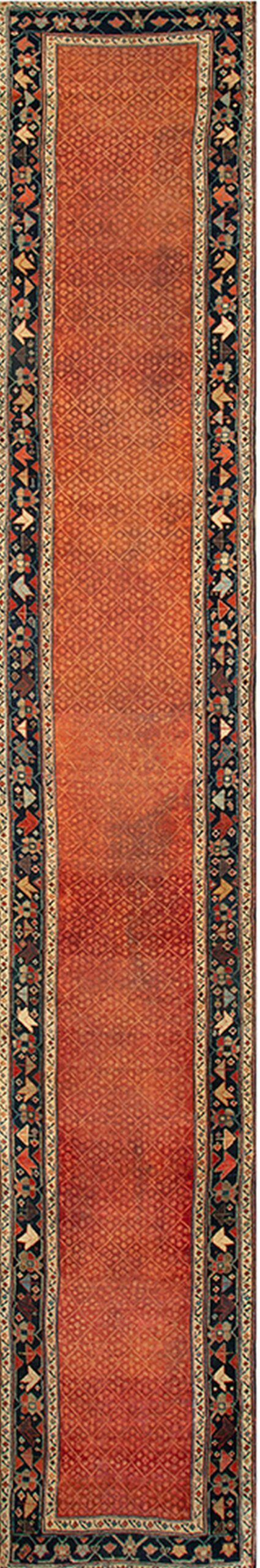 Hallway Runner Rugs (3ft x 19ft), Circa Date: 1900s. This exceptional piece exemplifies the enduring quality found in antique rugs from the Caucasus and Northwest Persia. The primary field is saturated with a rich, earthy terracotta hue, featuring a finely rendered, repeating diamond lattice pattern that creates a sense of depth and visual texture.