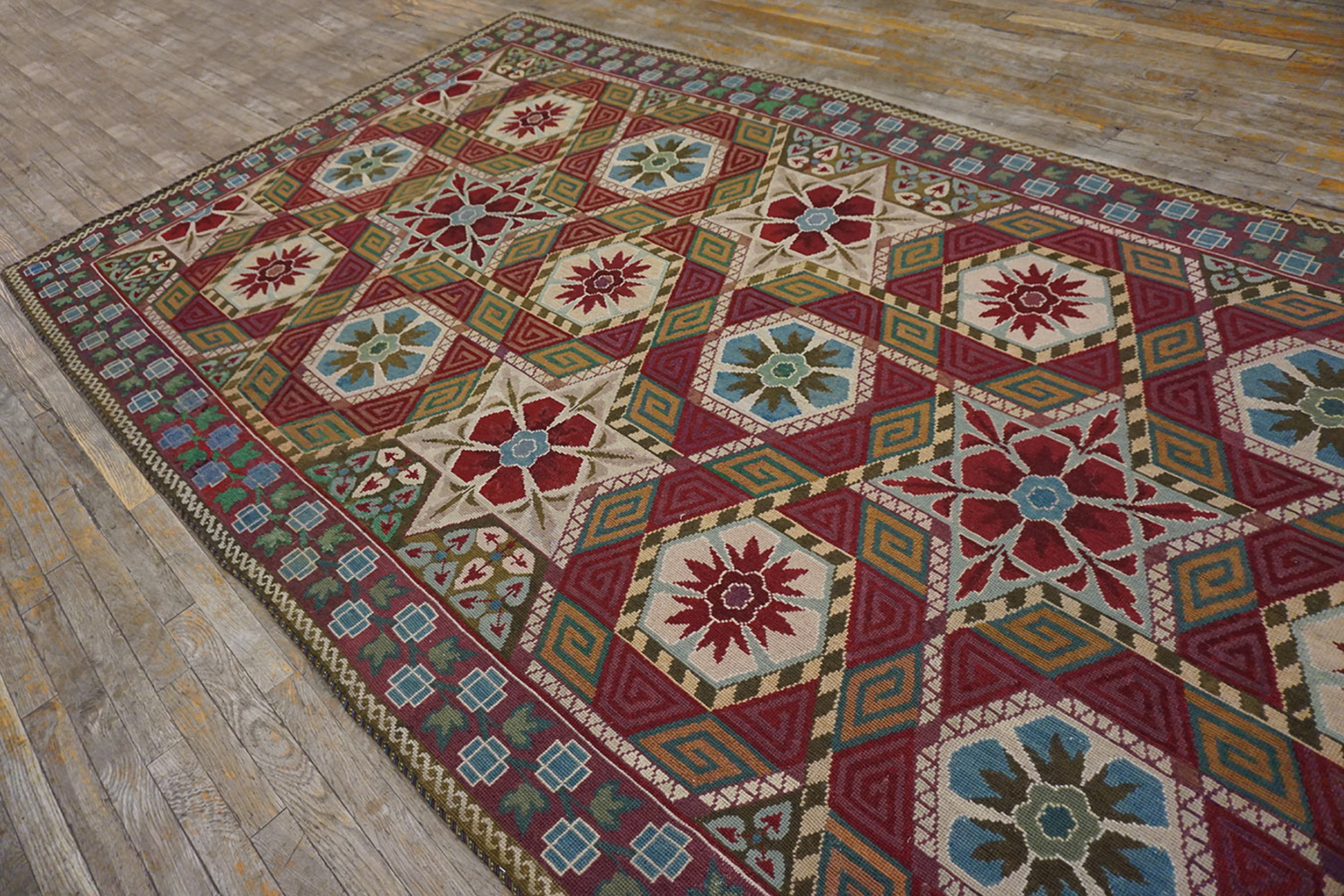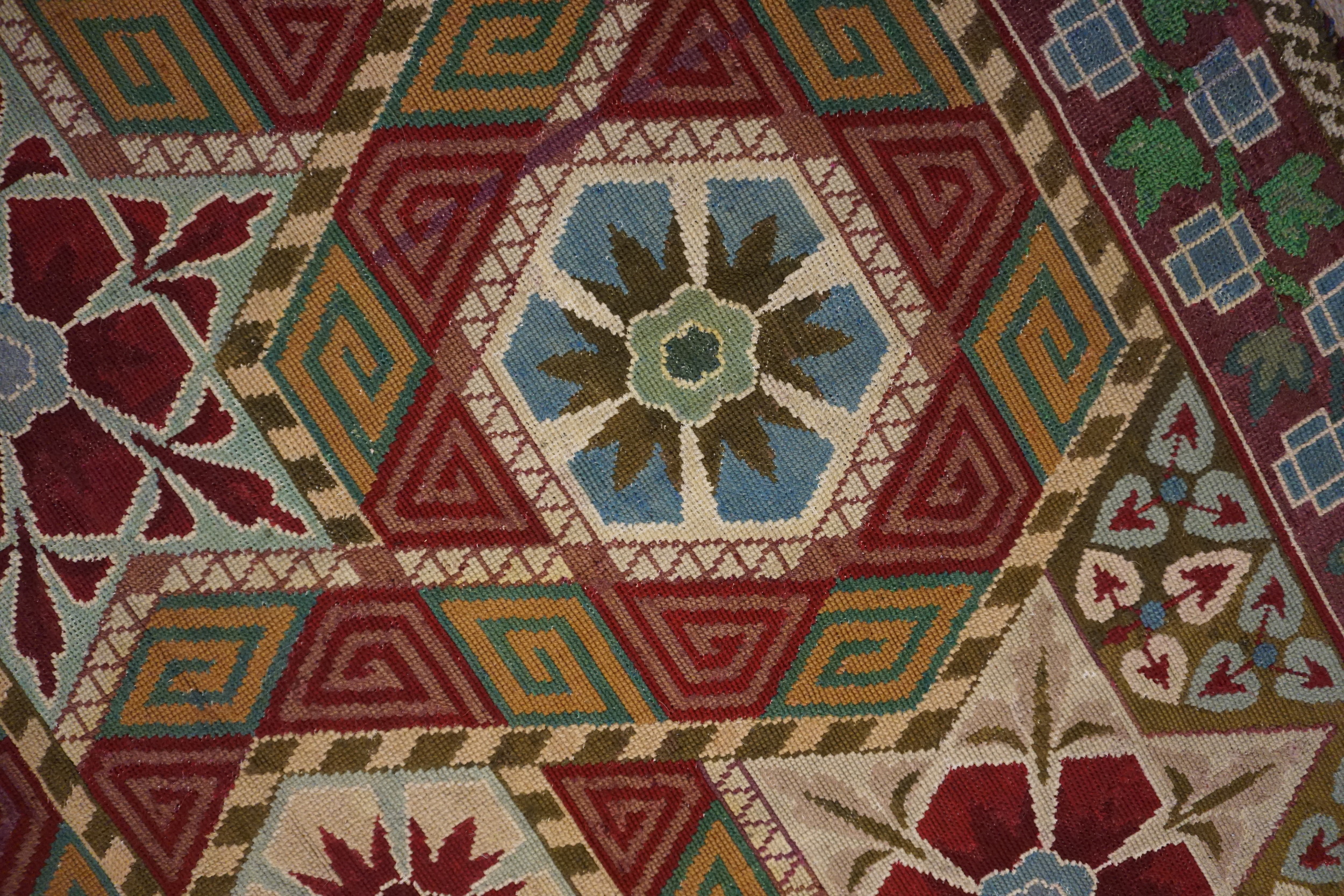 Antique Large Needlepoint French Flat Weave Rug, Circa Date: 1880s. This exceptional French needlepoint piece, dating to the late 19th century, exemplifies the refined domestic textile arts of the period. Its flat-woven structure provides a light, durable surface, making it a highly desirable example among antique rugs of European origin.