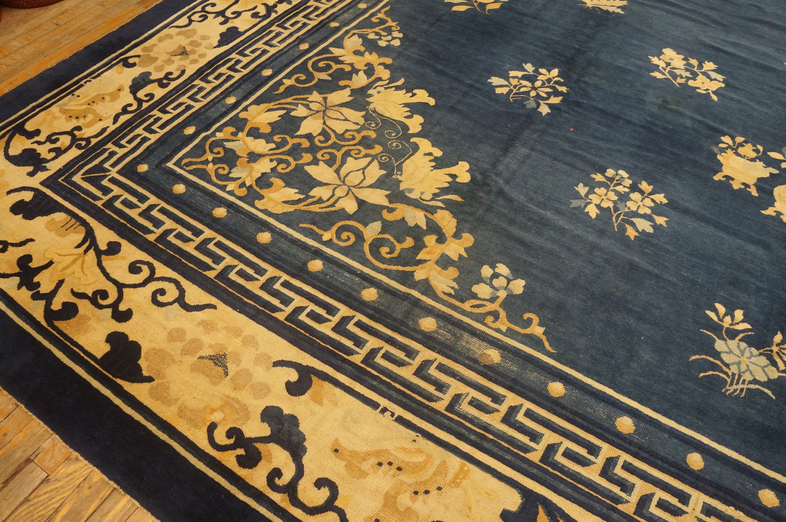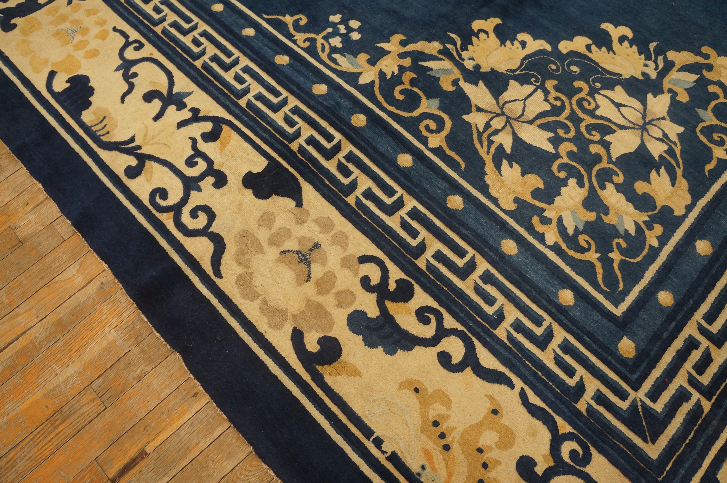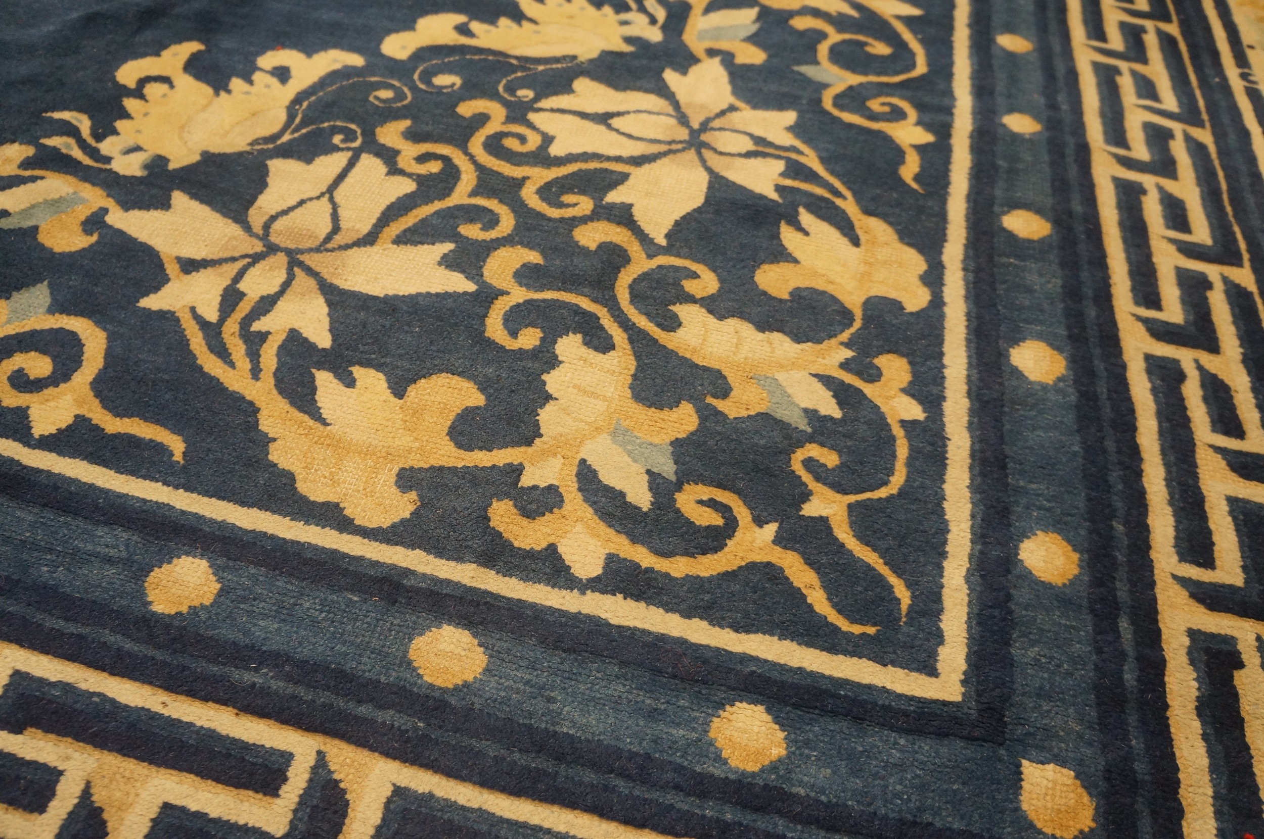 The complex border system frames the central design with precision, utilizing layers of scrolling vines and classic geometric patterns. Notably, the innermost guard border features the distinctive interlocking meander, often referred to as the greek Key running dog motif. This detail reinforces the rug’s classical pedigree, harmonizing traditional Chinese symbolism with sophisticated design structure.