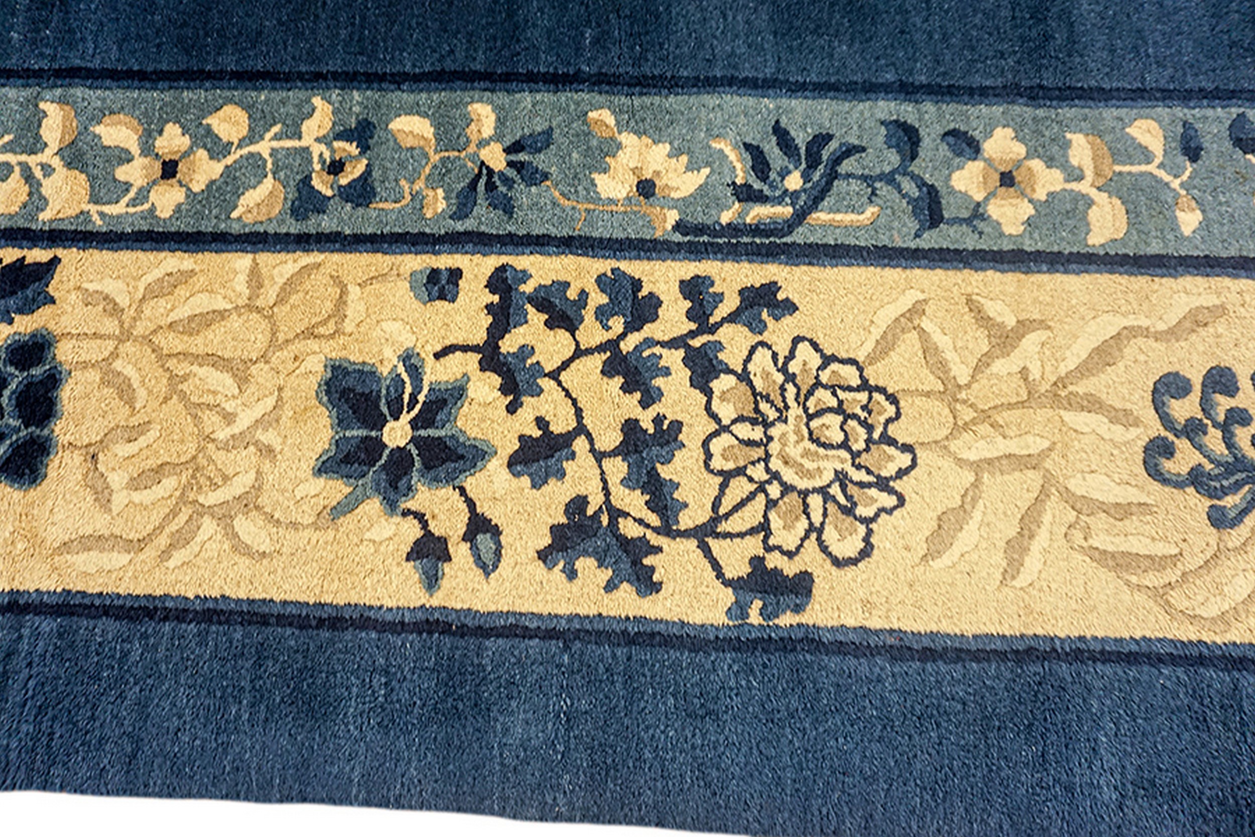 The expansive central field is dominated by a rich, velvety navy hue, providing a dramatic contrast to the ivory and gold motifs. This use of a singular, powerful background color is typical of the Peking style, emphasizing the purity of the design elements. Collectors often seek out blue color rugs for their versatility and ability to anchor sophisticated interior spaces.