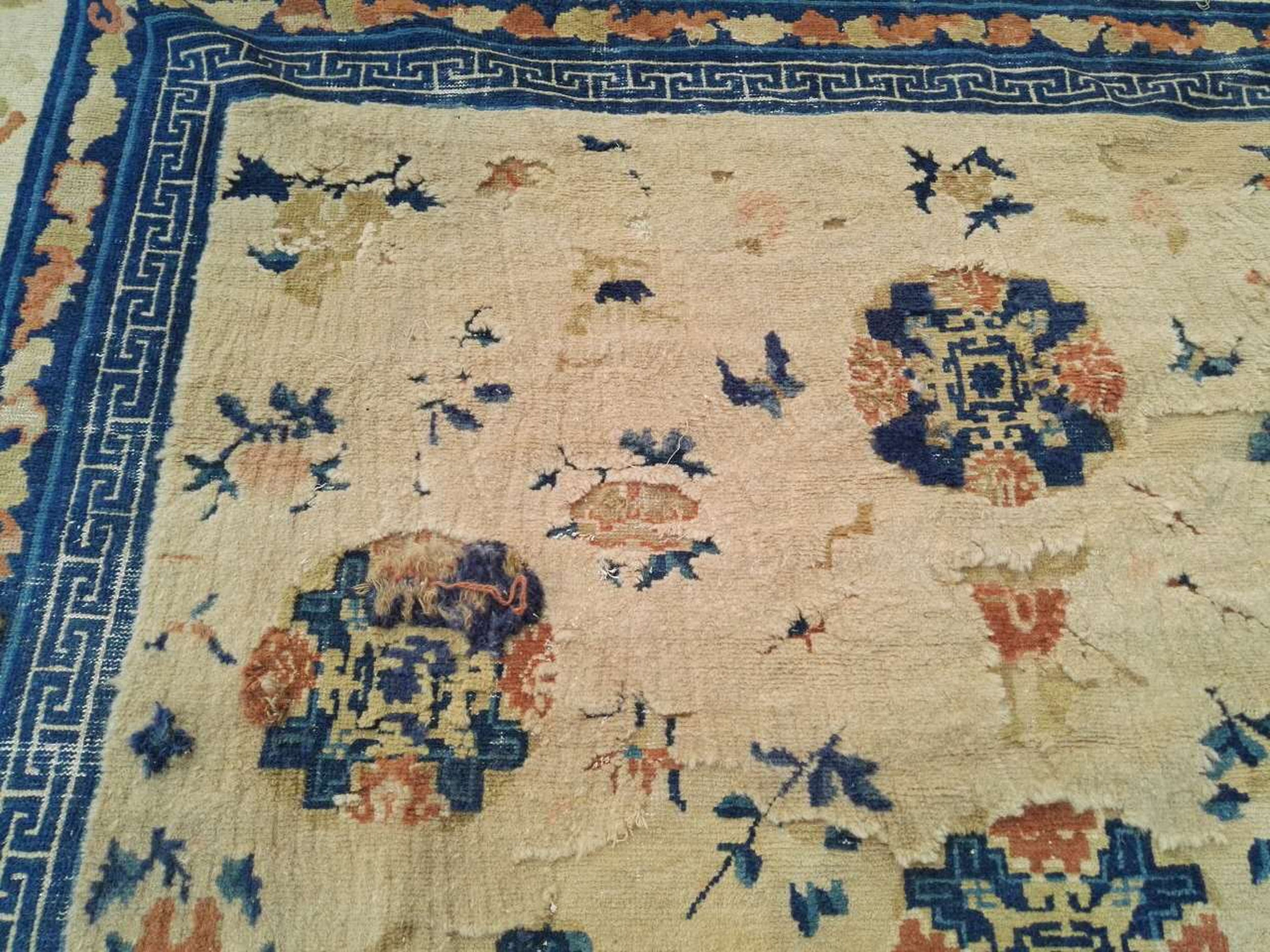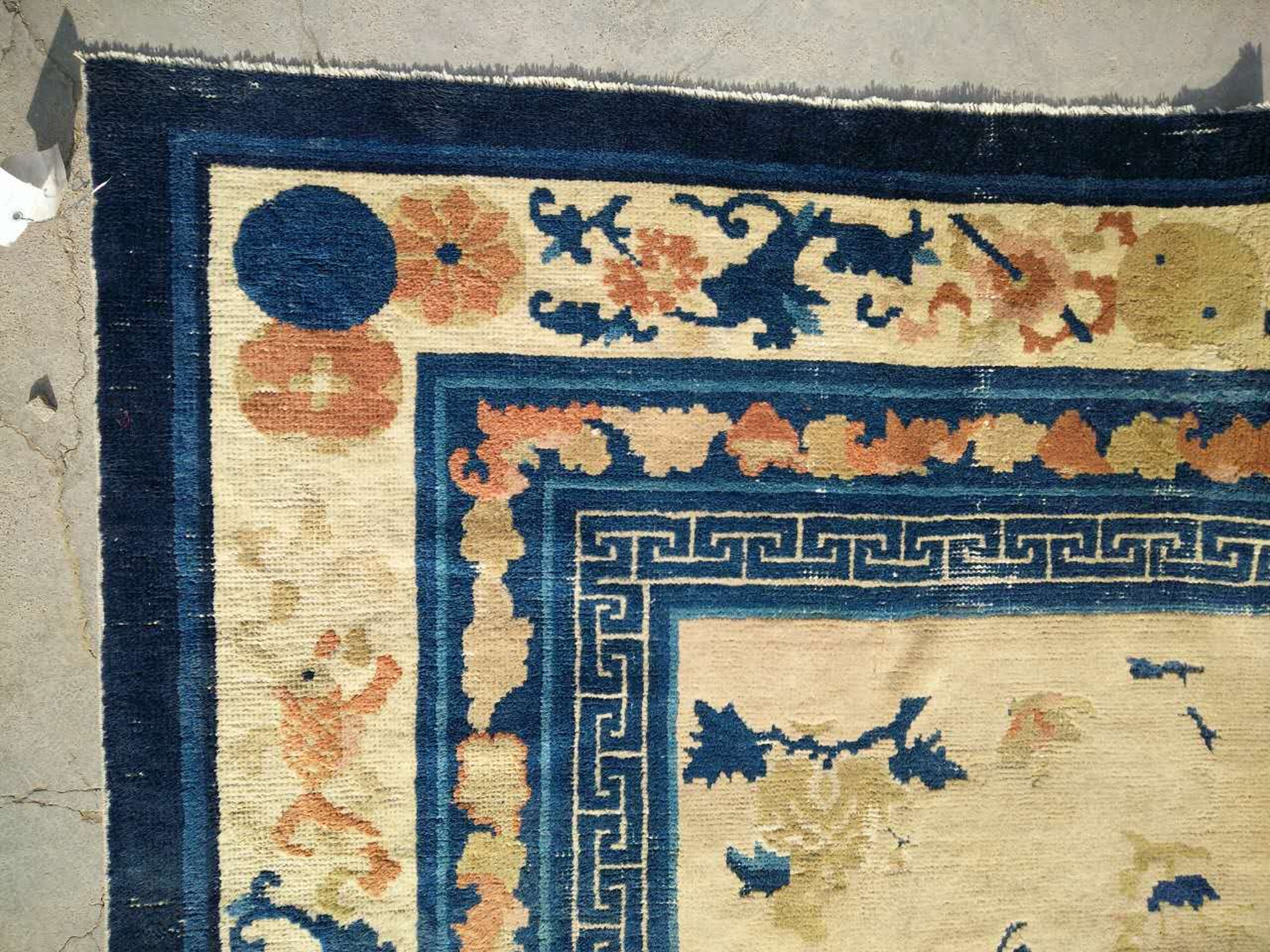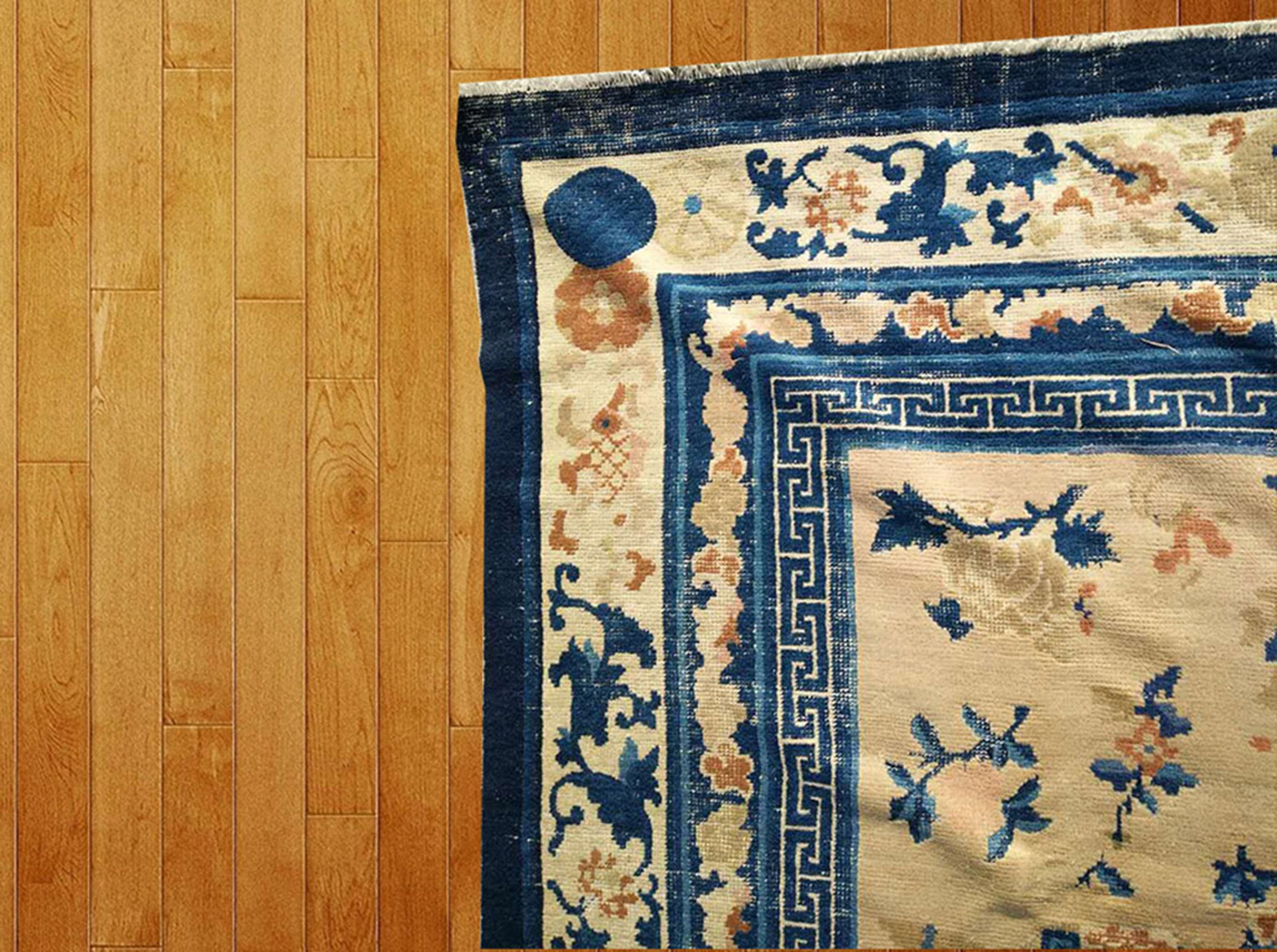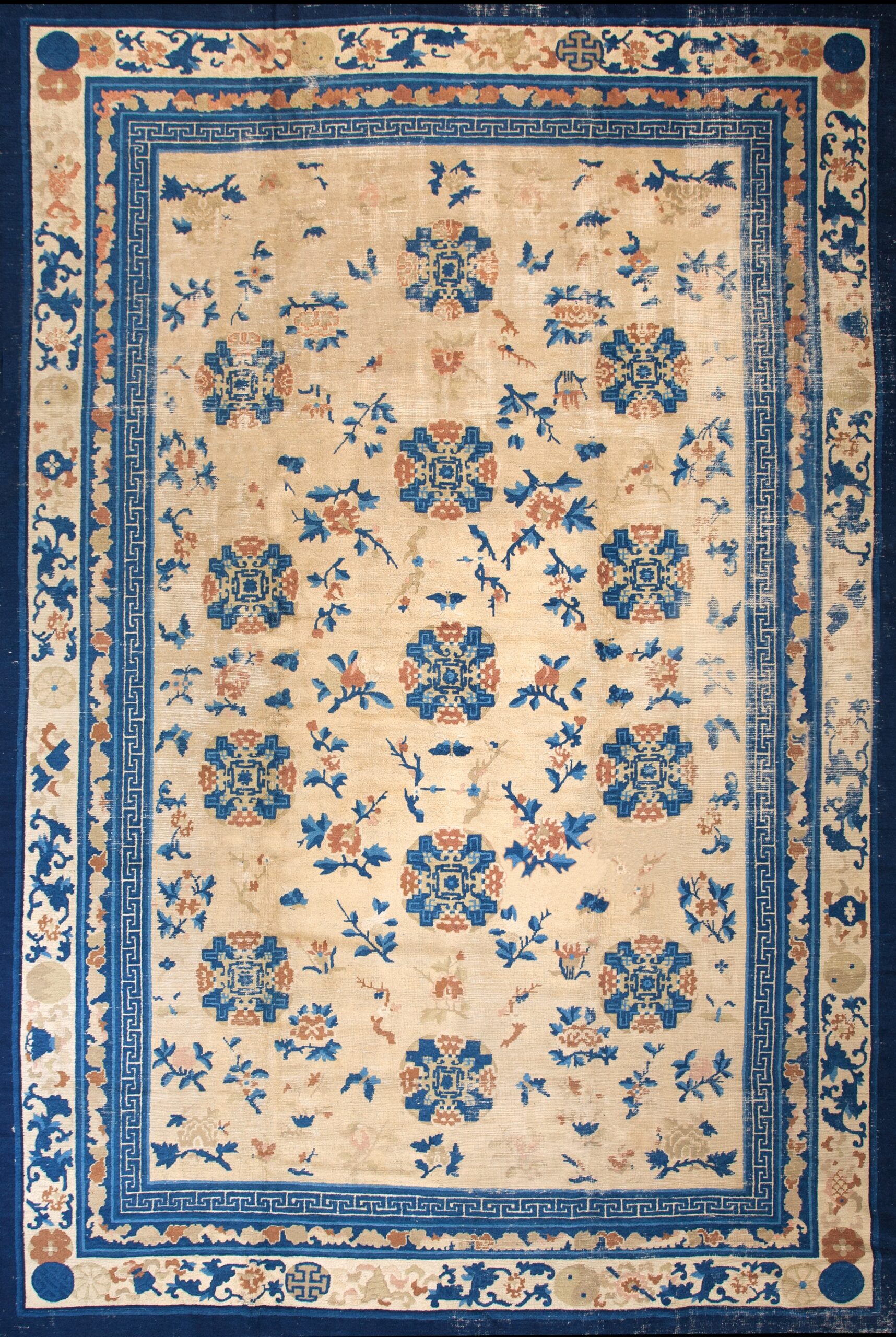The expansive field is rendered in a soft, luminous ivory ground, providing a perfect canvas for the scattered floral and geometric motifs. These elements are executed primarily in rich indigo blue and warm terracotta, colors often favored in Chinese rugs of this period for their striking contrast and symbolic meaning, ensuring the design remains vibrant yet harmonious.