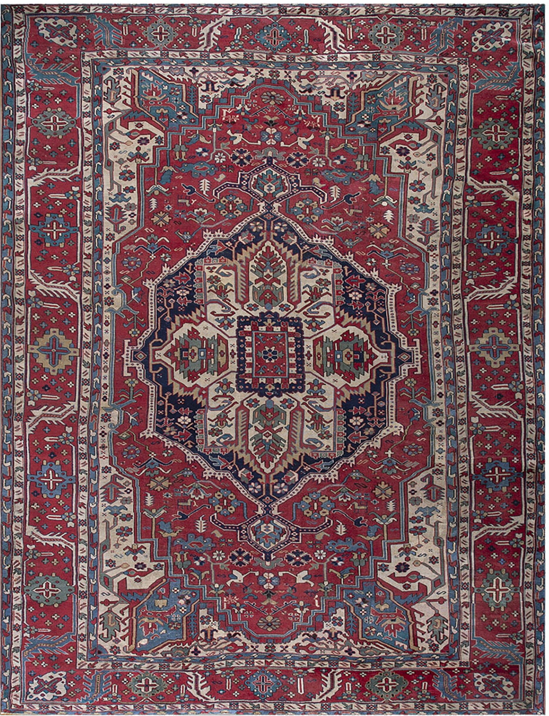Antique Large Serapi Persian Allover Medallion Rug, Country of Origin: Persia, Circa Date: 1890s. This exceptional late 19th-century weaving originates from the mountainous region of Northwest Persia, showcasing the robust, geometric aesthetic that defines the Serapi tradition. The palette is dominated by a deep madder red field, providing a dramatic backdrop for the complex, angular motifs rendered in indigo, cream, and sky blue.