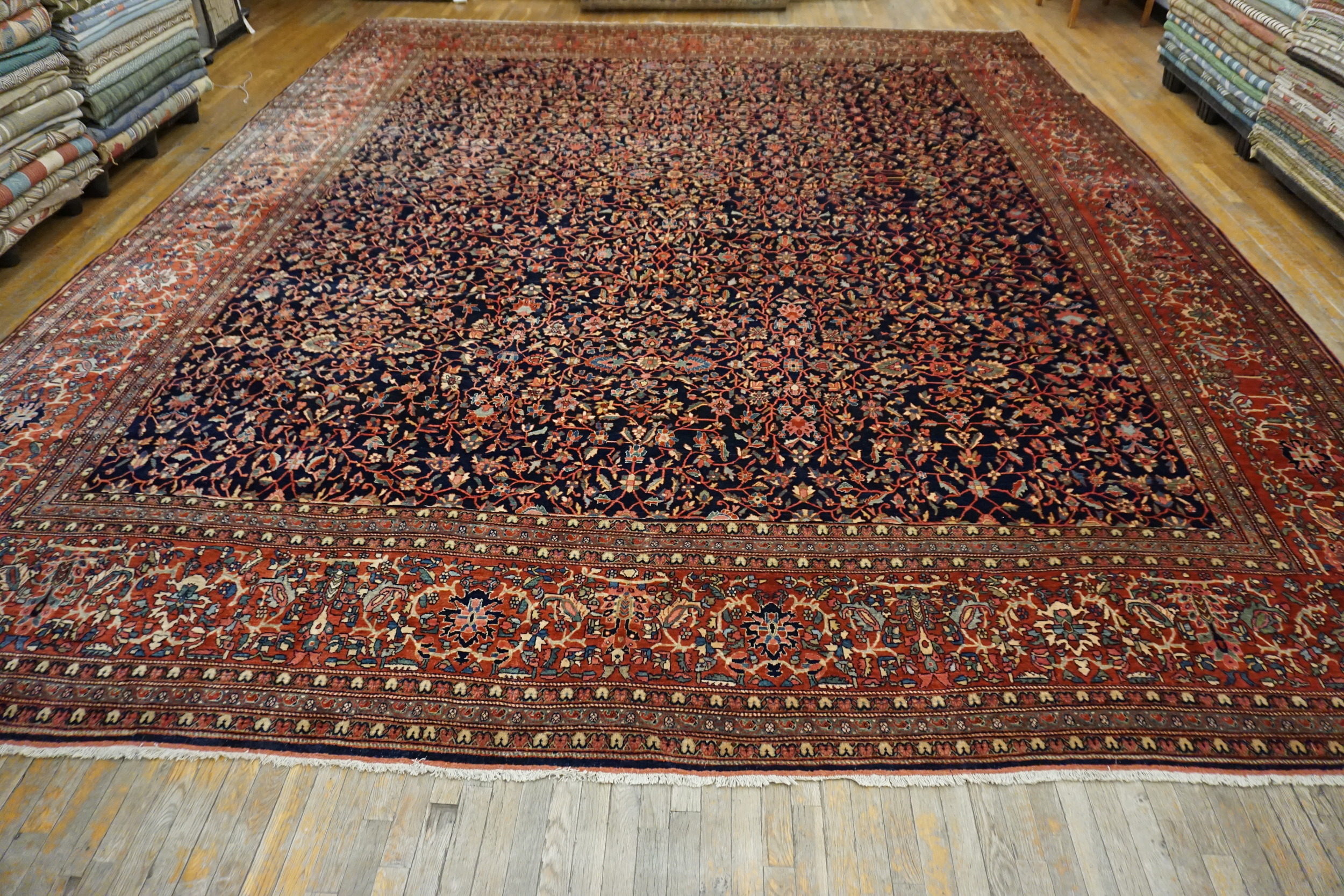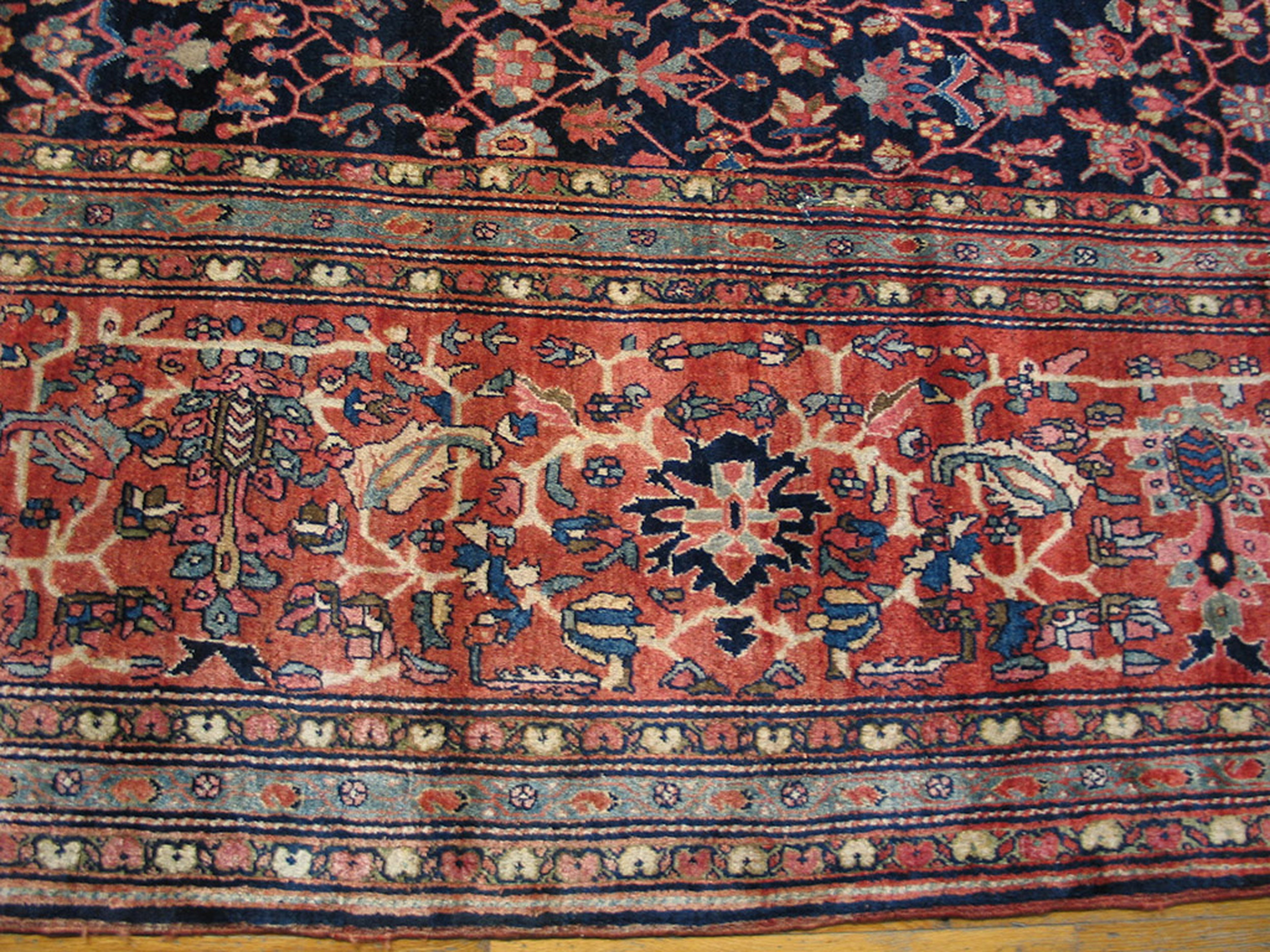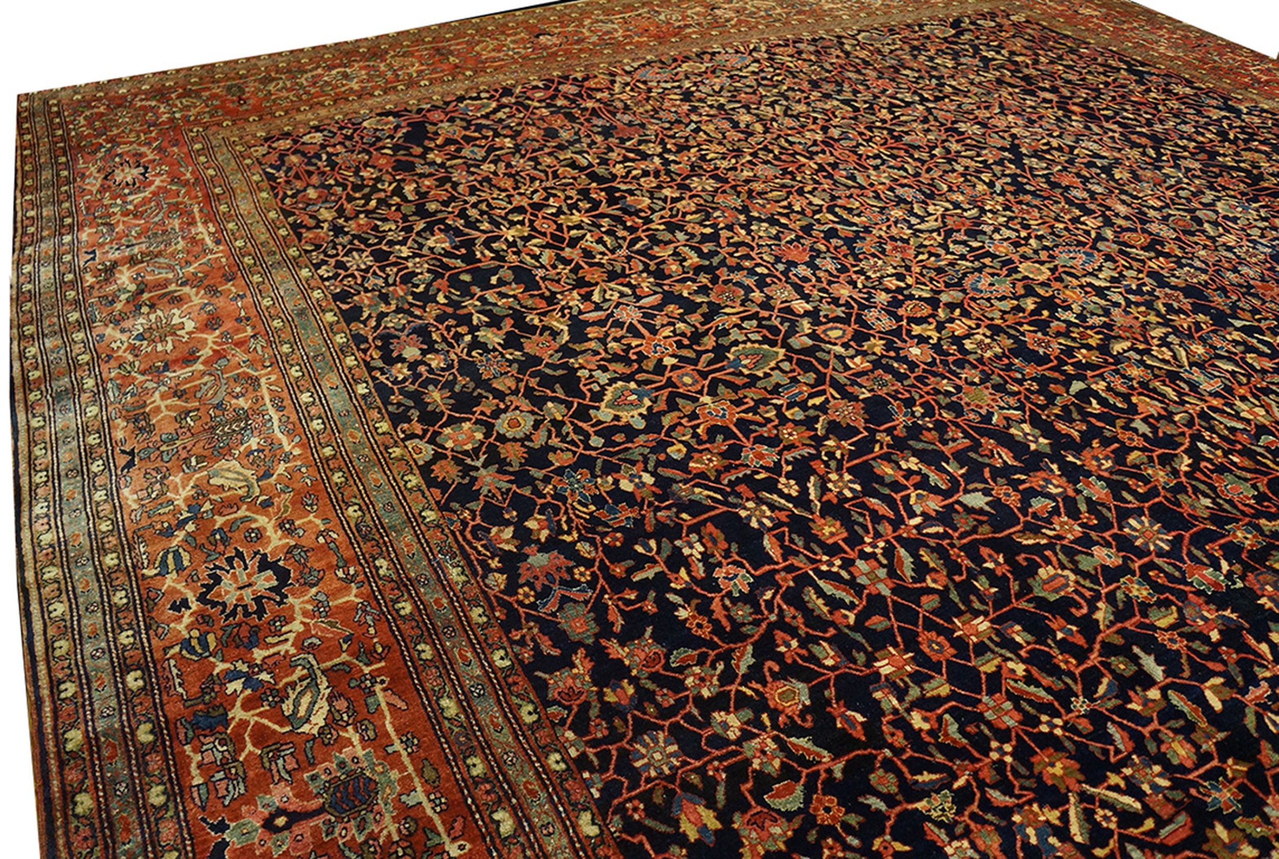 The commanding visual presence of this piece is defined by its rich, saturated color palette. A deep, midnight indigo serves as the primary ground color, providing a dramatic backdrop for the intricate botanical motifs. This classic use of blue color rugs contrasts sharply with the earthy terracotta and rust tones of the main border, creating a harmonious yet powerful aesthetic balance characteristic of the finest Farahan workshops.